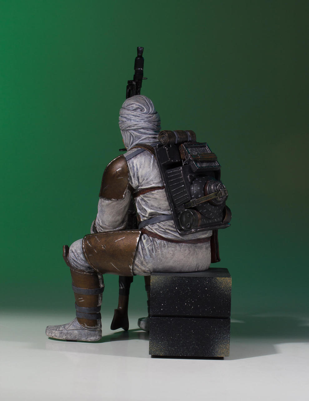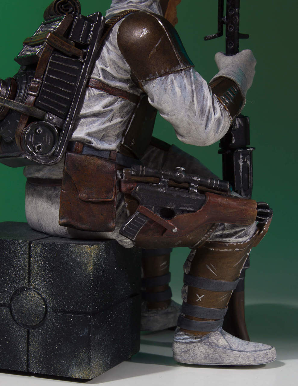 In Gentle Giant LTD's newest Collector's Gallery statue, we see a battle-hardened Dengar guarding a supply crate full of additional firepower with his trusty Valken-38 carbine rifle in hand. Hossing all of that heavy firepower from one end of the quadrant to the next has taken its toll but it has been worth it to establish his reputation as one of the best hunters in the galaxy. Dengar has seen it all and has lived to tell the tale; you can see every bounty etched into his face, every struggle to capture his prisoner scratched into his armor. He missed the bounty for Solo, but he has gone back to his armory to reload and he will get his next mark… dead or alive.