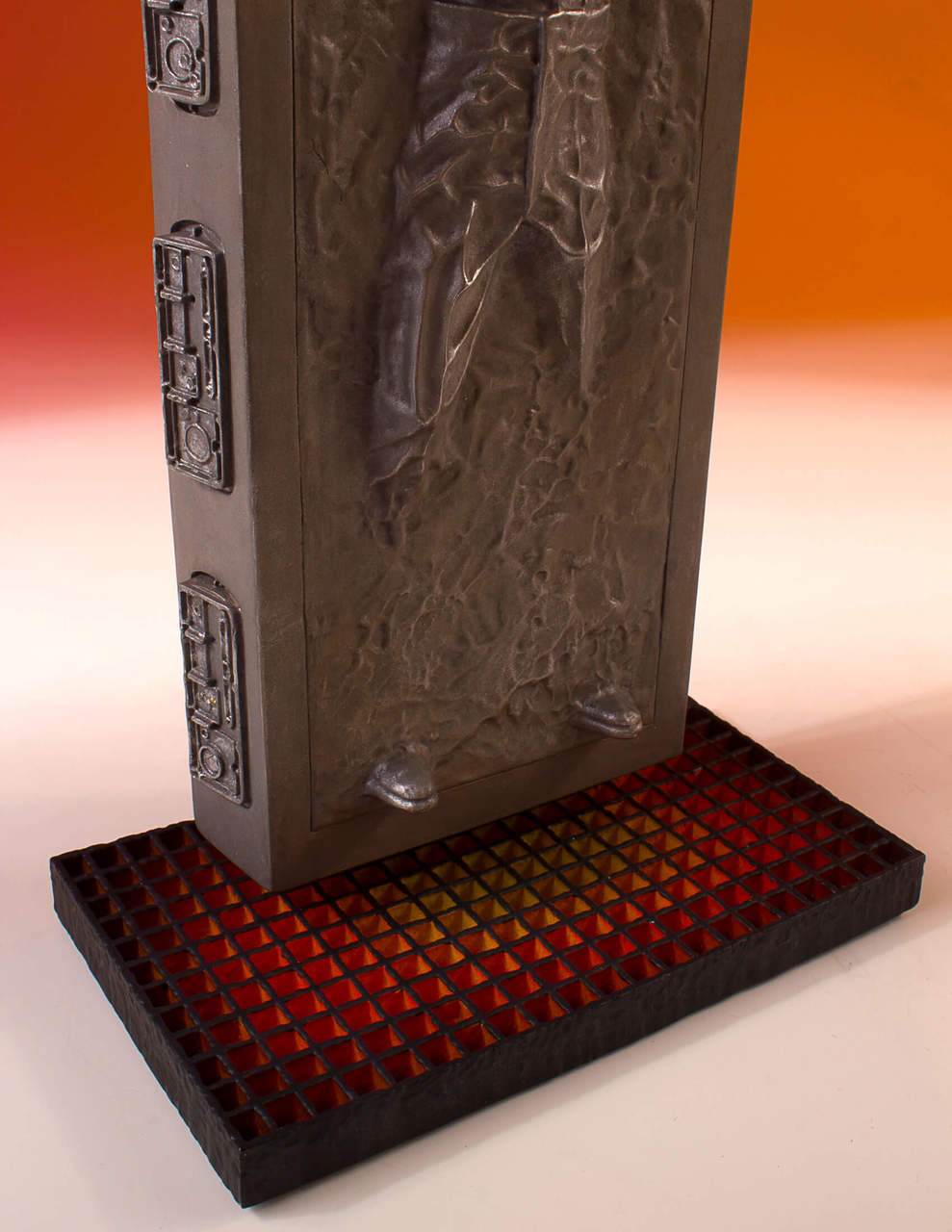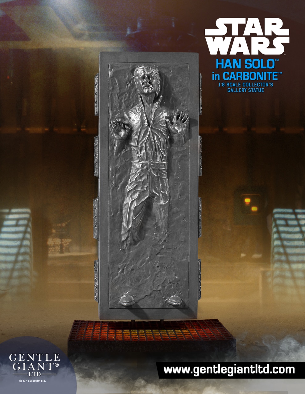 Han Solo In Carbonite is the seventh statue in Bounty Hunter 1:8th Collector's Gallery line celebrating over 40 years of the Star Wars universe. This accurate sculpture comes from scans of the actual carbonite block prop for the ultimate attention to detail. The Han Solo's frozen, pained expression is perfectly captured in this carbonite block, with a base that matches the alcove where the frozen Han Solo hung as a prized possession in the Mighty Jabba's palace. Bring Han home and he can be a prize in your collection too. Pre-Order now to complete your 1:8th scale bounty hunter collection, have as a stand-alone piece or make sure your Boba Fett collector's gallery statue is not lonely. Each limited edition, hand-painted piece is cast in high quality polyresin with crisp details. This statue comes individually numbered with a matching Certificate of Authenticity.