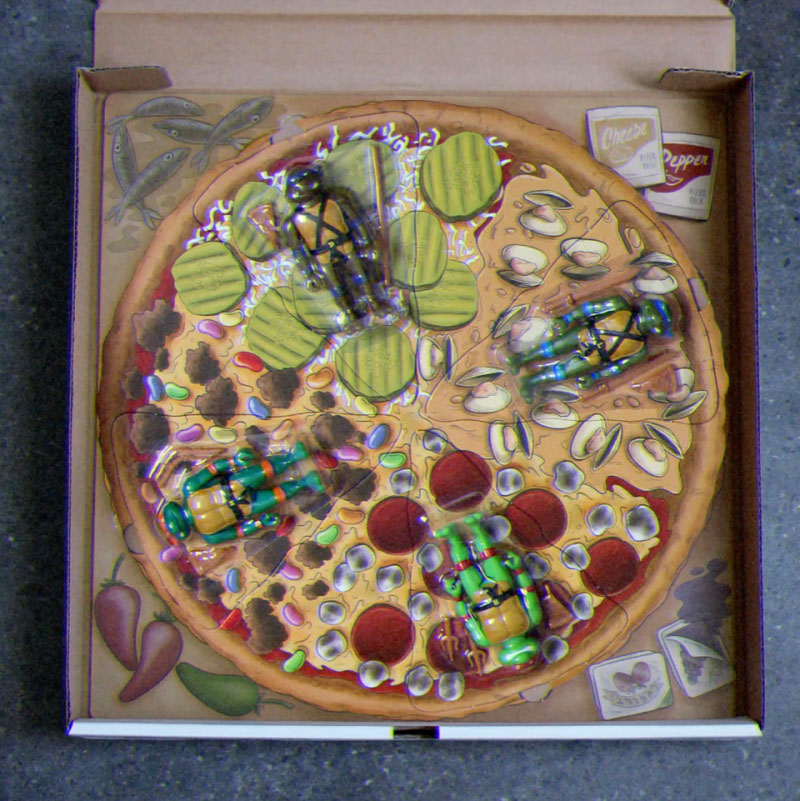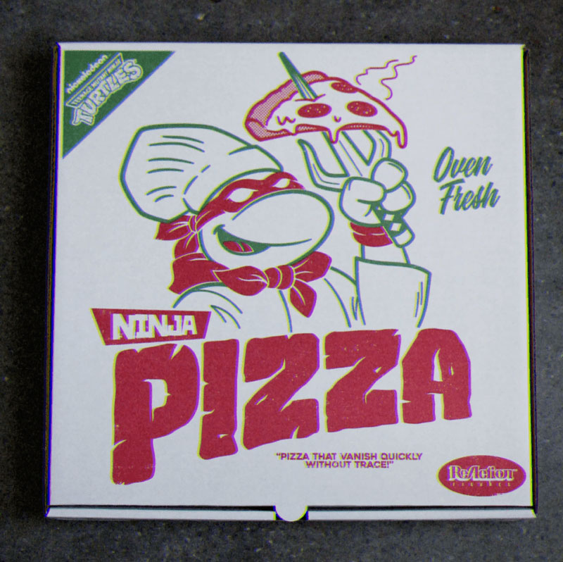 Cowabunga! The Teenage Mutant Ninja Turtles ReAction Figures are here! Fresh from the oven for their debut at San Diego Comic-Con, the steaming-hot halfshell heroes are stealthily stashed with their favorite food – Pizza! The fabulous four TMNT ReAction Figures are reimagined as authentically detailed 3 ¾" action figures, blister-packaged with accessories on pizza-slice shaped cardbacks featuring some of the Turtles' favorite pizza toppings, inside a genuine pizza delivery box. Each four-pack set includes: