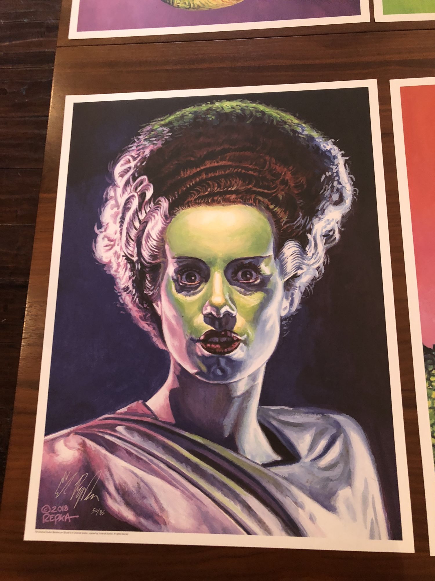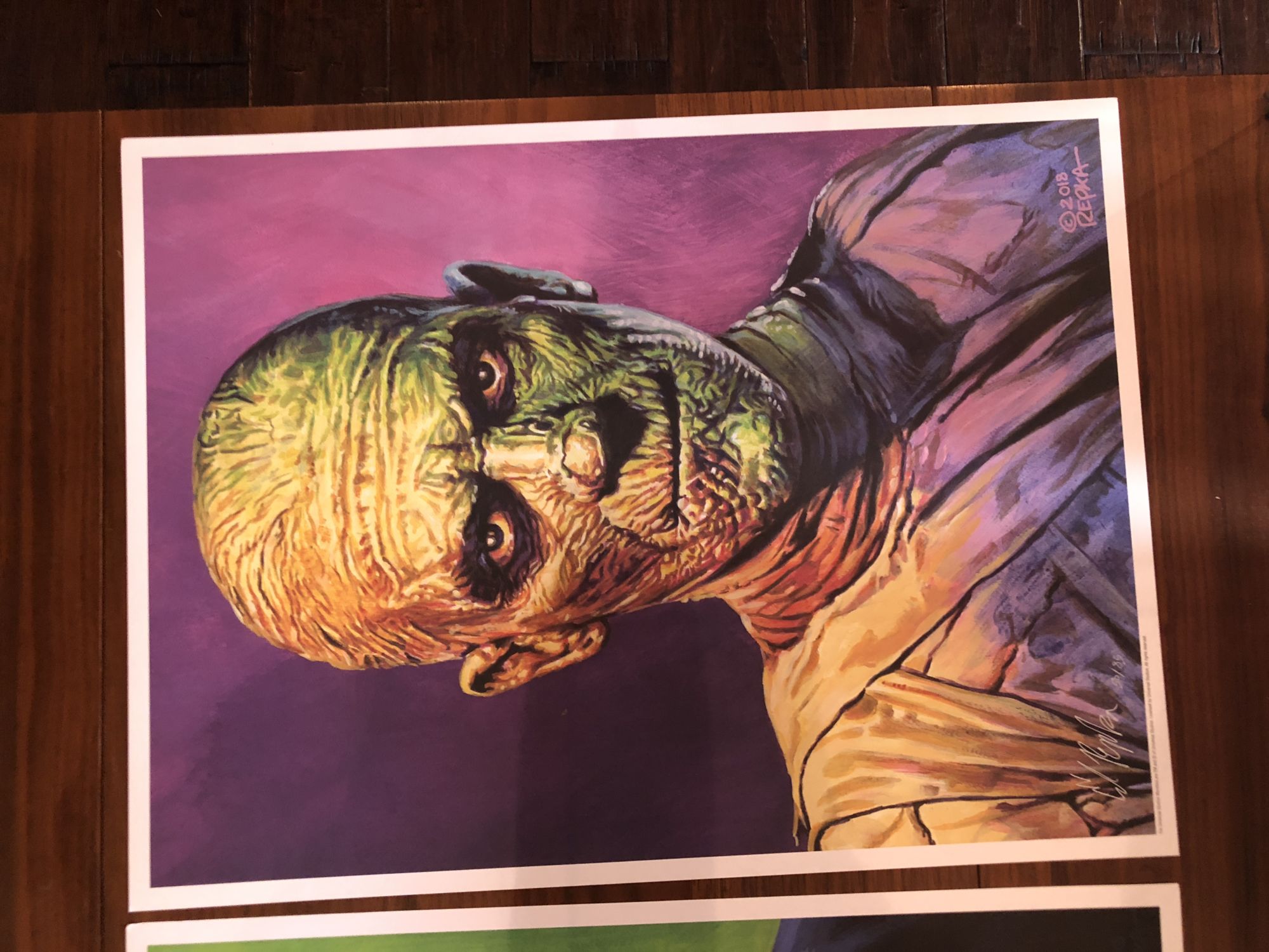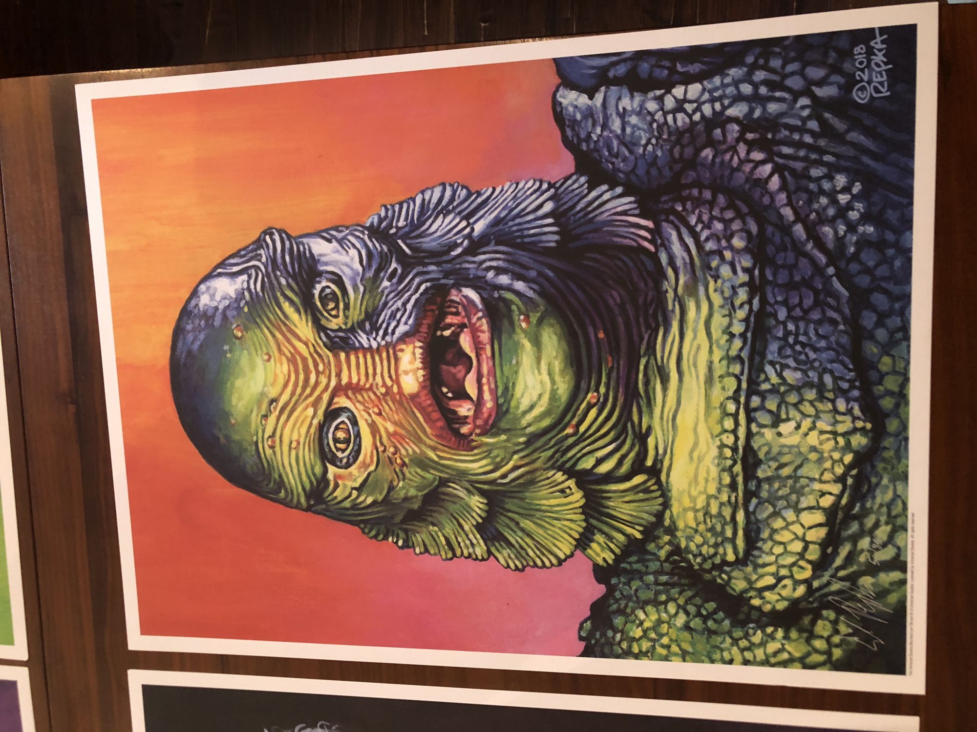 Right from the outside, with it's old barbershop-style window art, Monster Kids like myself feel welcome and right at home. When you walked inside, a center table contained the liited to only one pair in each size shoe being offered. Four were available, and they sold out pretty dang fast. Also on the table were four awesome Ed Repka prints featuring The Bride, Frankenstein's Monster, The Creature From the Black Lagoon, and The Mummy. Each of those was limited to only 50 of each.