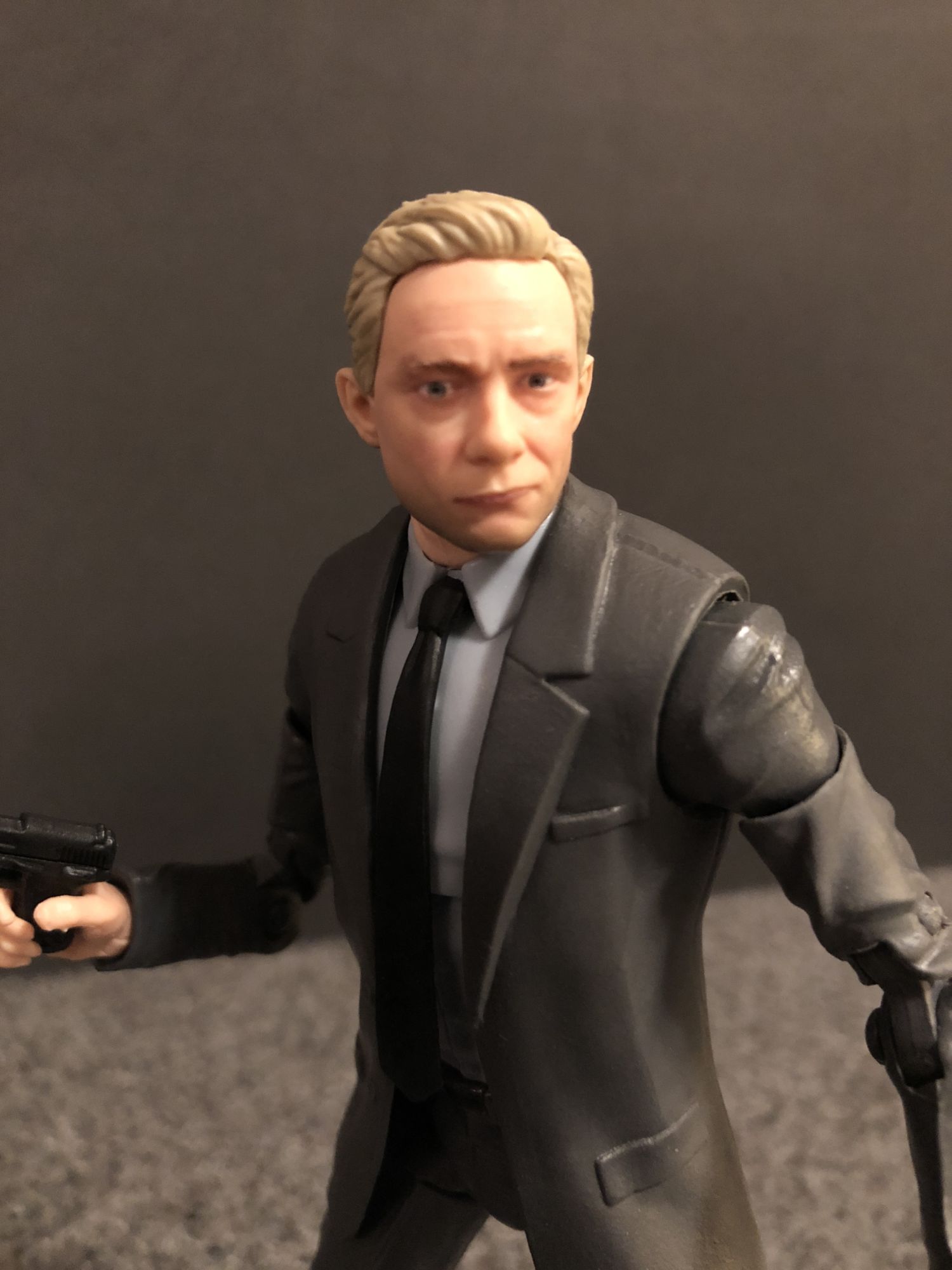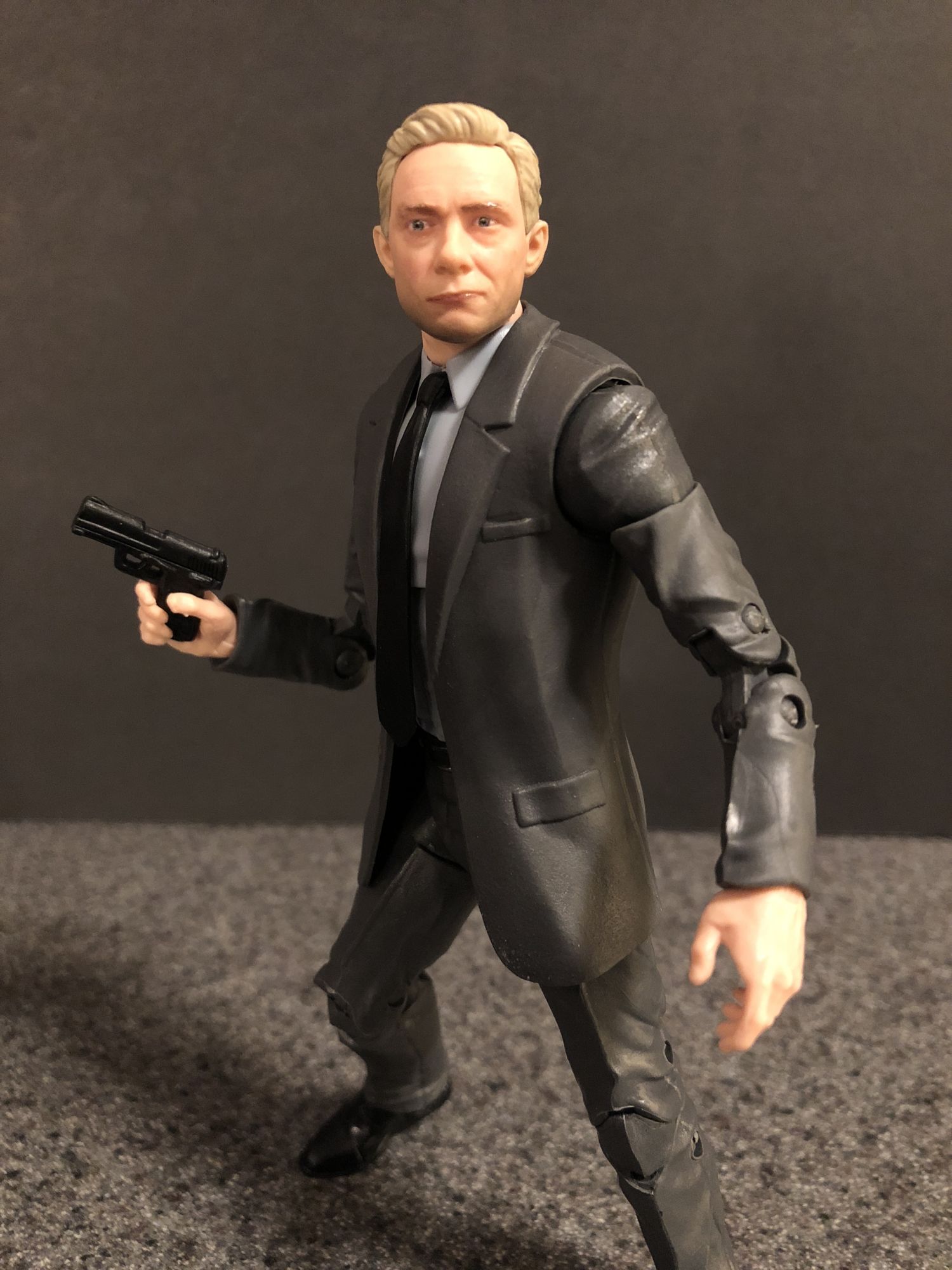 Looking at the figures themselves, at least they tried. The Everett Ross figure is a rare miss. Its not that the headsculpt doesn't look like Martin Freeman, but the expression chosen is just off-putting. I am not sure what they were going for there, but it did not work. The basic buck used for the suited body has the same issues as the others: the ankles. It is really hard to get him to stand, the left foot on mine was especially stiff and hard to plant. Just a disappointing figure.