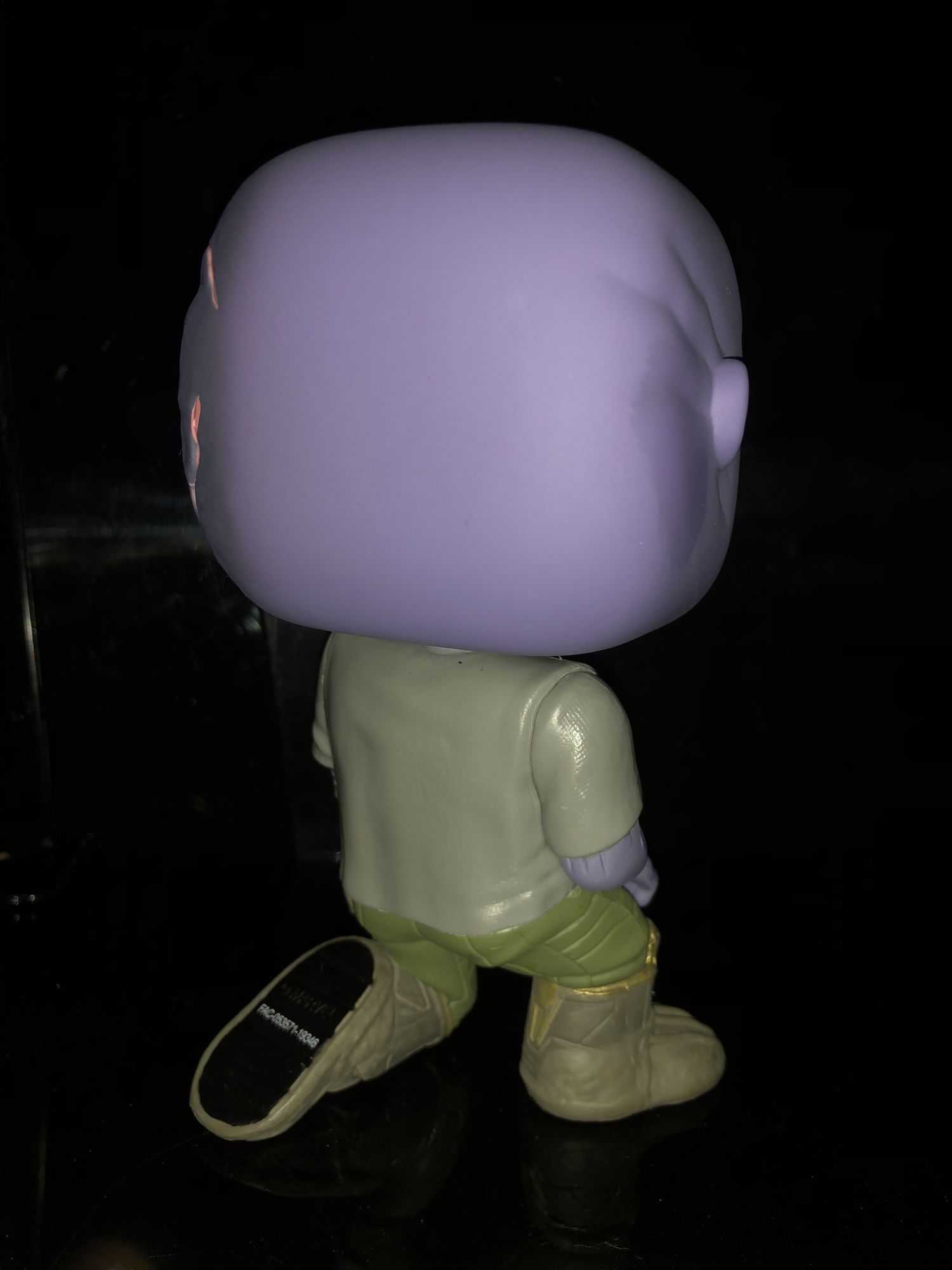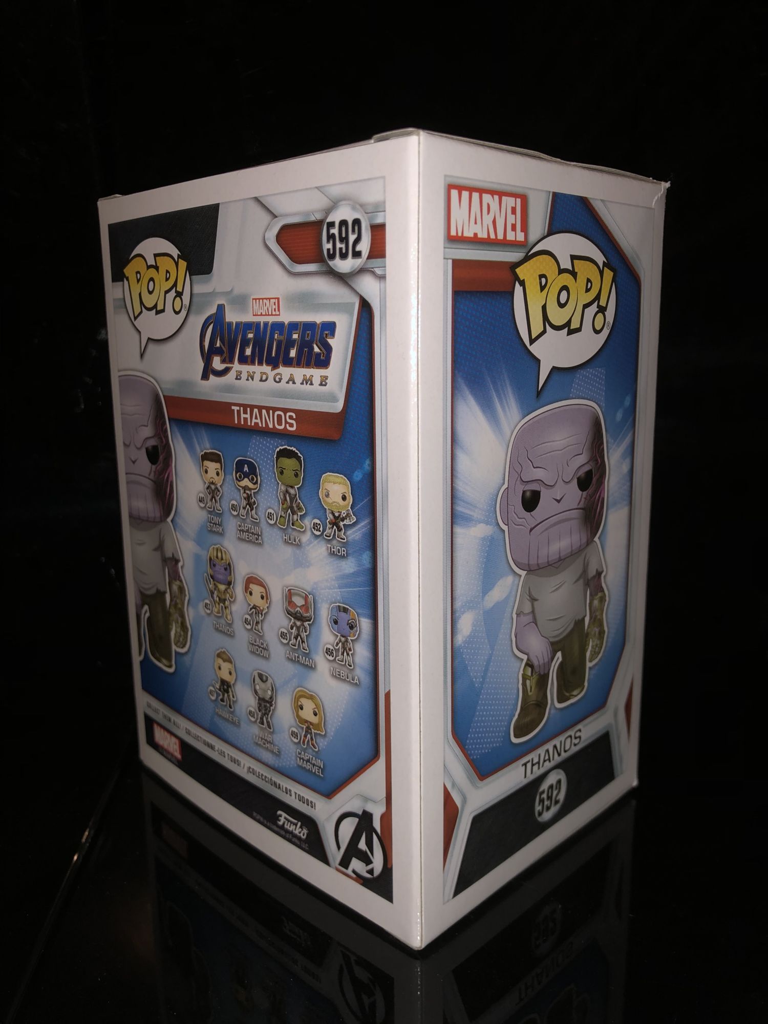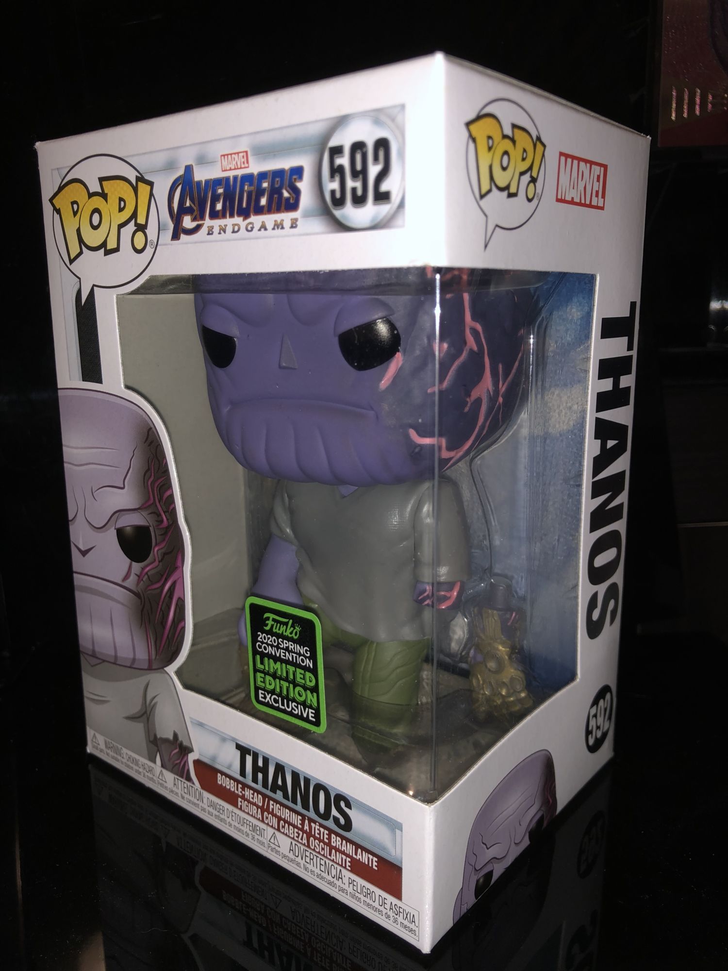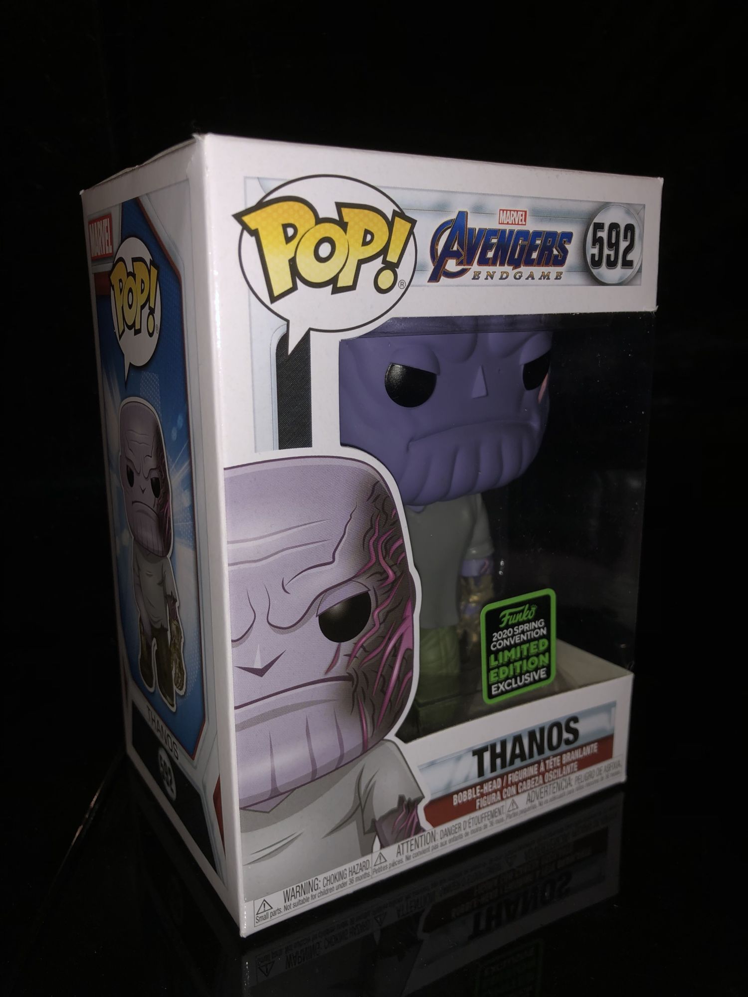 The box is pretty standard with the other Avengers: Endgame Funko Pops. The only this time really makes this Thanos box stand out from the rest is the green shared exclusive sticker on the window. It was odd that the sticker was more in the center of the box than the corner but this is due to the severed arm placement.