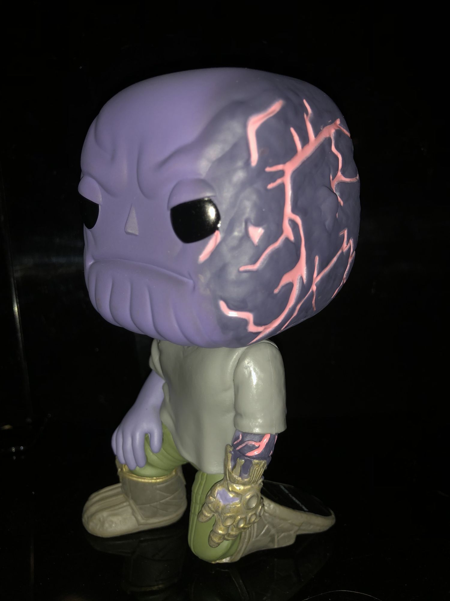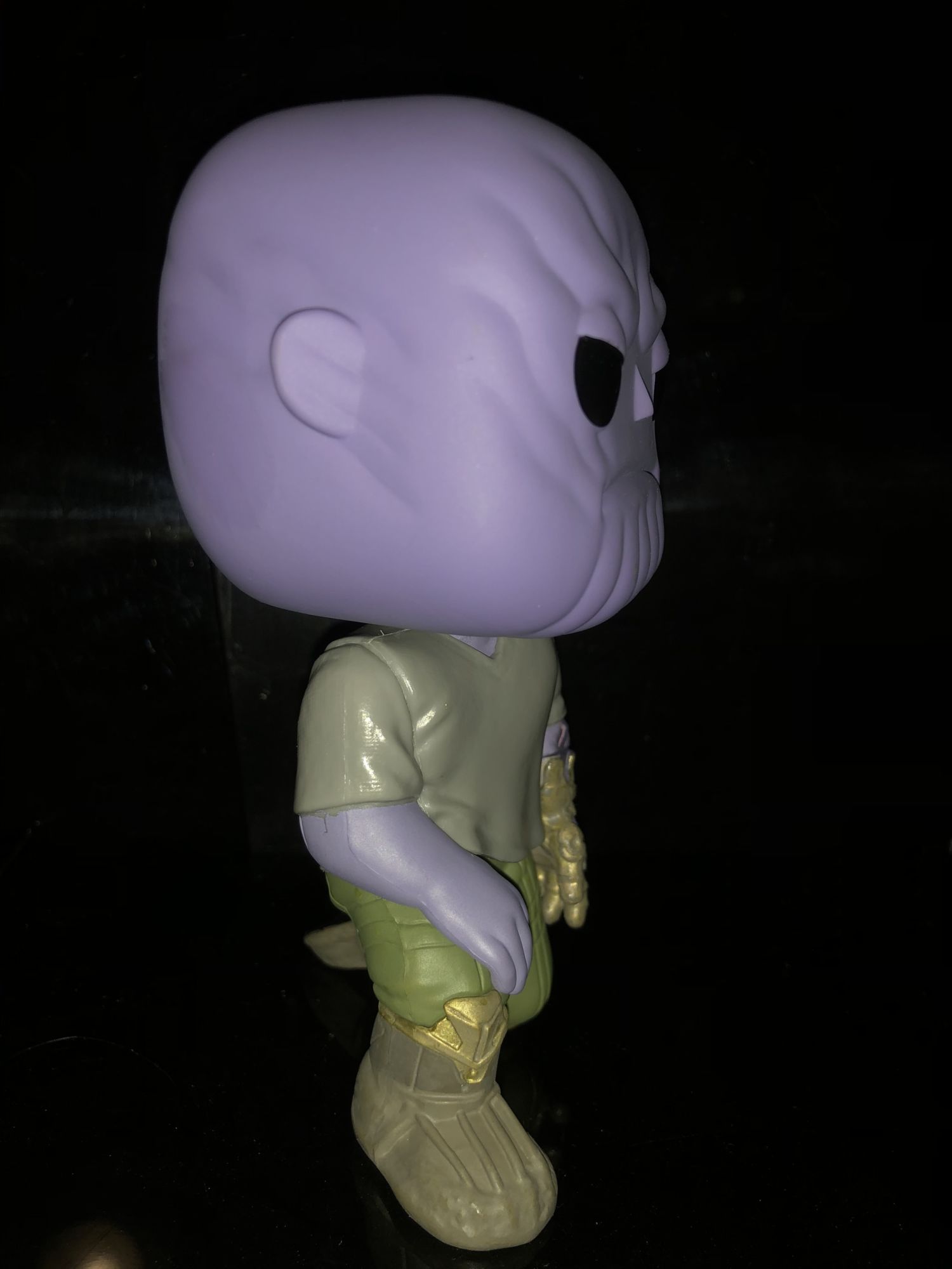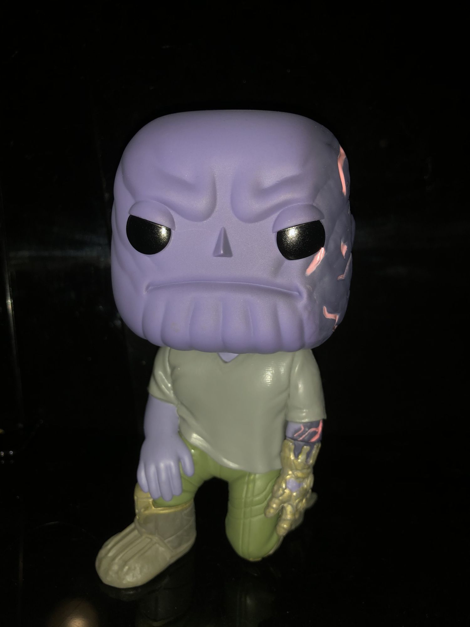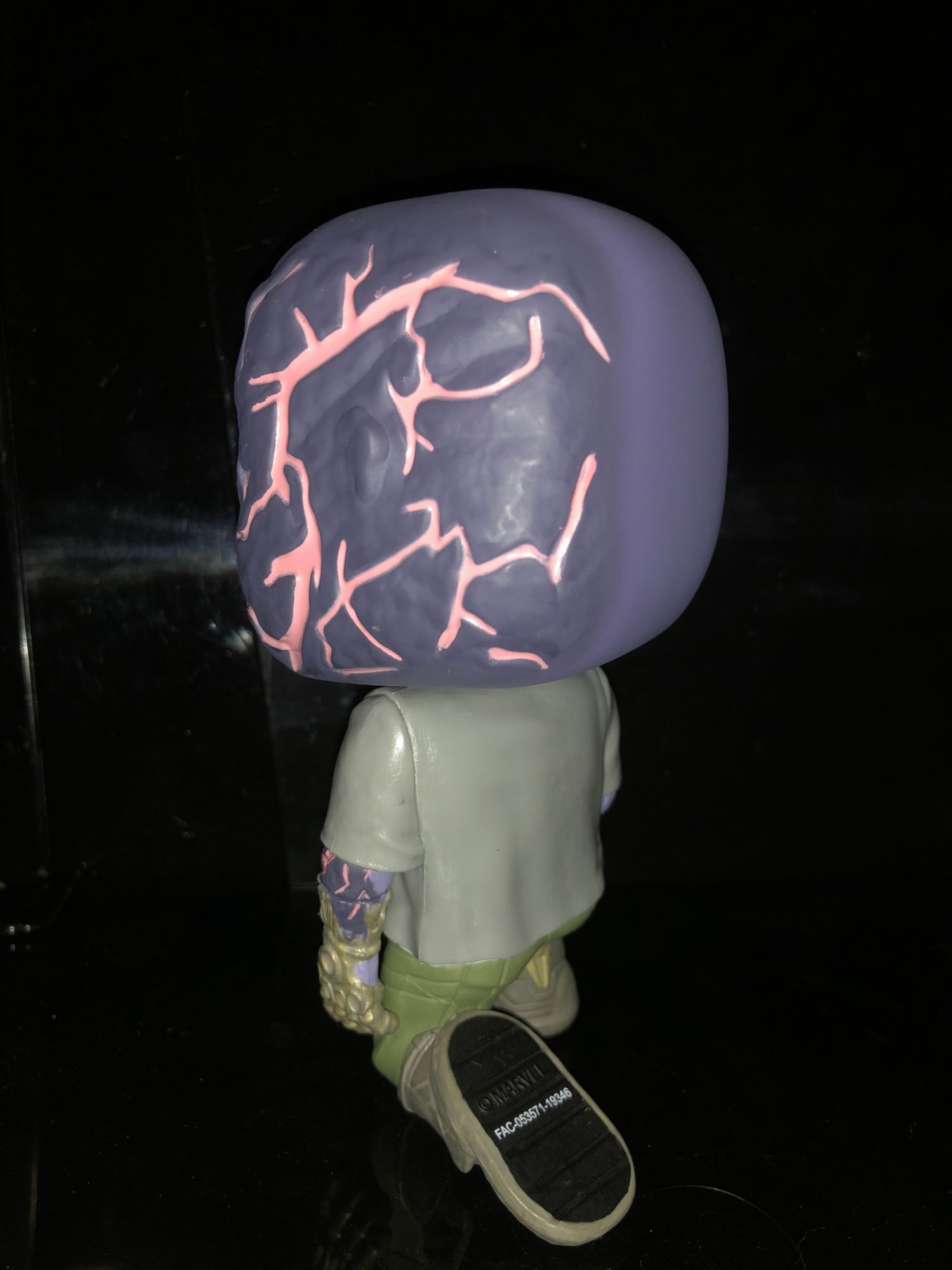 The box is pretty standard with the other Avengers: Endgame Funko Pops. The only this time really makes this Thanos box stand out from the rest is the green shared exclusive sticker on the window. It was odd that the sticker was more in the center of the box than the corner but this is due to the severed arm placement.