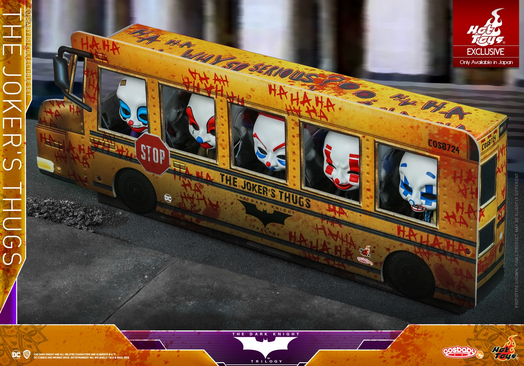 The Dark Knight is defiantly on my top 10 list of the great superhero movies around. This time it's not even the hero's role but the villains. Two-Face and the Joker realm made a remarkable performance with this modern twist enthuse iconic characters. One of my favorite scenes from The Dark Knight is the opening Joker robbery scene as its simple, sweet, and sinister. This time Hot Toys has announced new Cosbaby collectible from this classic superhero film that has some awesome packaging. Each Joker Thug is nicely designed and crafted and carrying their own weapon. The clown masks are simple and sweet and the red and whites really pop. On top of that, the packaging is amazing as its the bus and you can see the masks on each side. This hinted might be my first Cosbaby purchase just to dimply the in the box to show off my ave for The Dark Knight. The main Joker tuft is not included but was already announced and available separately and worth it.