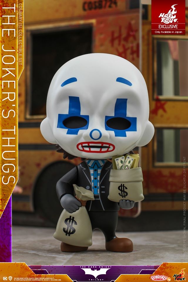 The Joker who portrayed himself as an agent of chaos, turns Gotham City into turbulence and in tranquility. Inspired by The Dark Knight movie, Hot Toys is thrilled to present the latest Joker's Thugs Cosbaby (S) Collectible Set that recreates the masked thugs as they appeared during the memorable bank heist with The Joker. Each Cosbaby figure measures approximately 11 – 12.5 cm tall including figure base. The collectible set is firstly available in Japan and in selected markets.