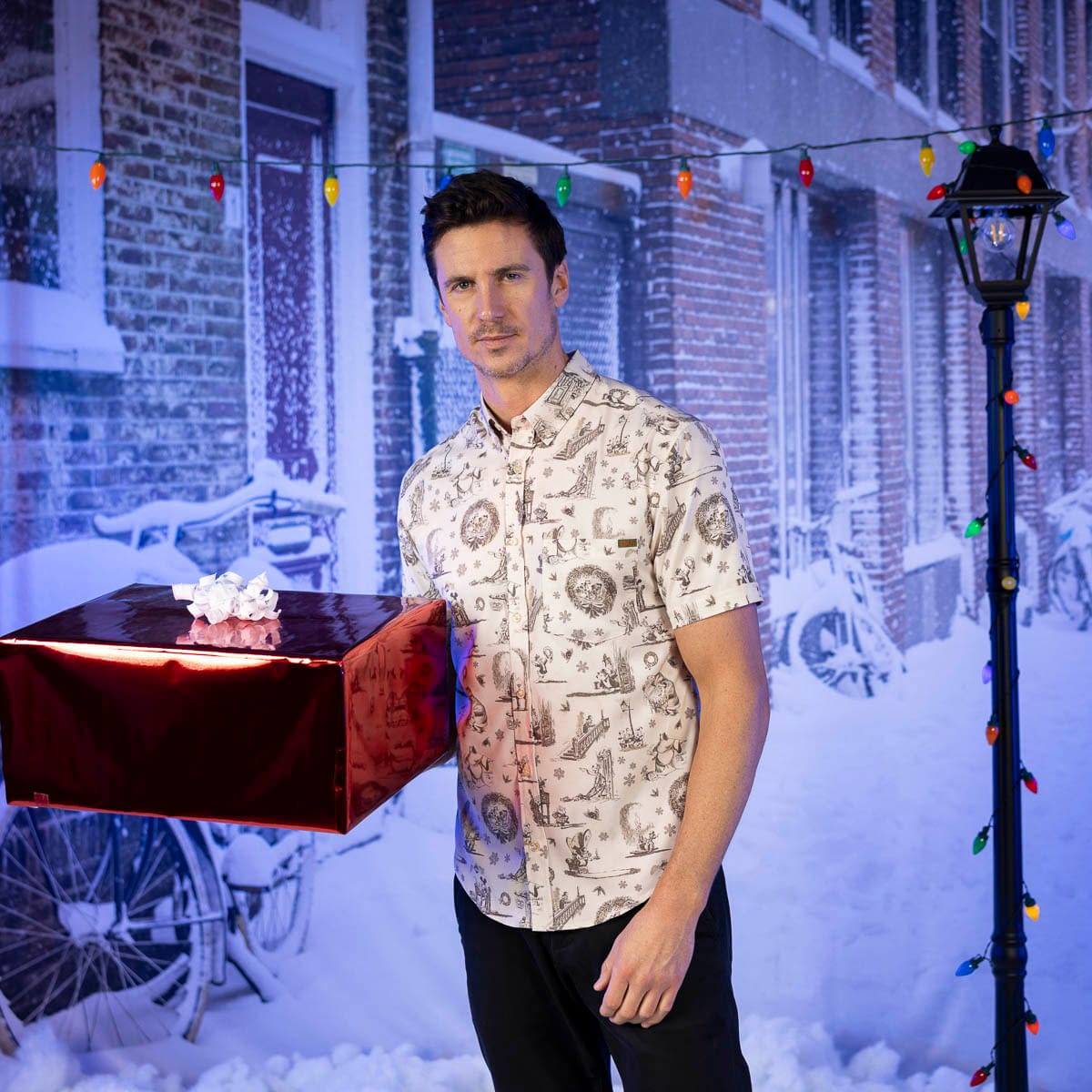 Button-down shirts ($70) with designs like "Oh What a Merry Christmas Day", "Humbug & Holiday Cheer", "Counting House Christmas", and "Season's Wreathings"