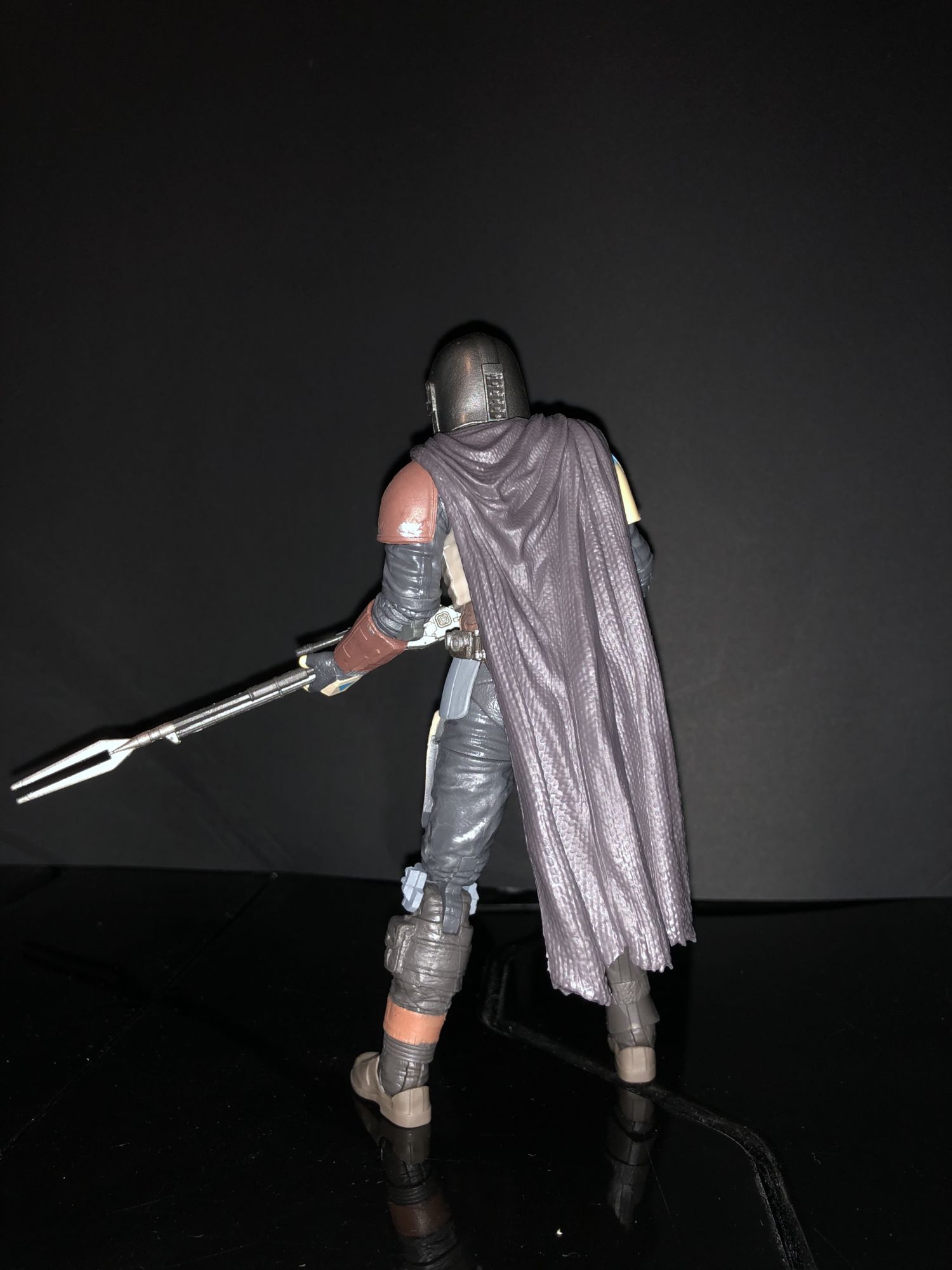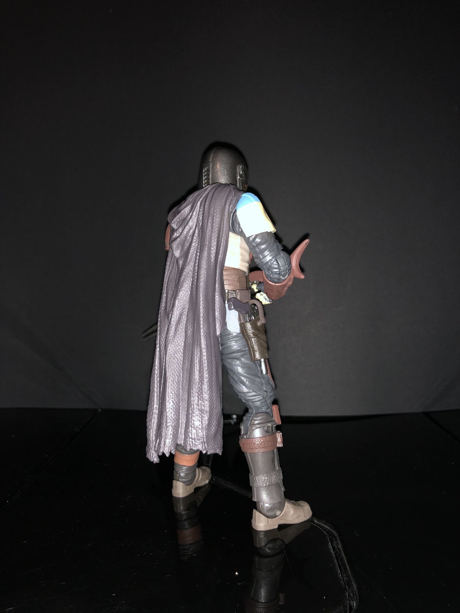 I really do dig the Mandalorian's character design, while it feels familiar from being fans of Boba Fett and Jango Fett, it still has its own unique feel. Unlike the other bounty hunters we know there is no antenna attached to the helmet but the helmet does show dirt weathering effect. I really do wish that his cape was fabric and not plastic because the plastic cape can get annoying at points. I also wish that his rifle had a clip for it on his back. It almost seems like it does as there is a notch in the back and a piece of the rifle could fit in it but with me, I had no luck.