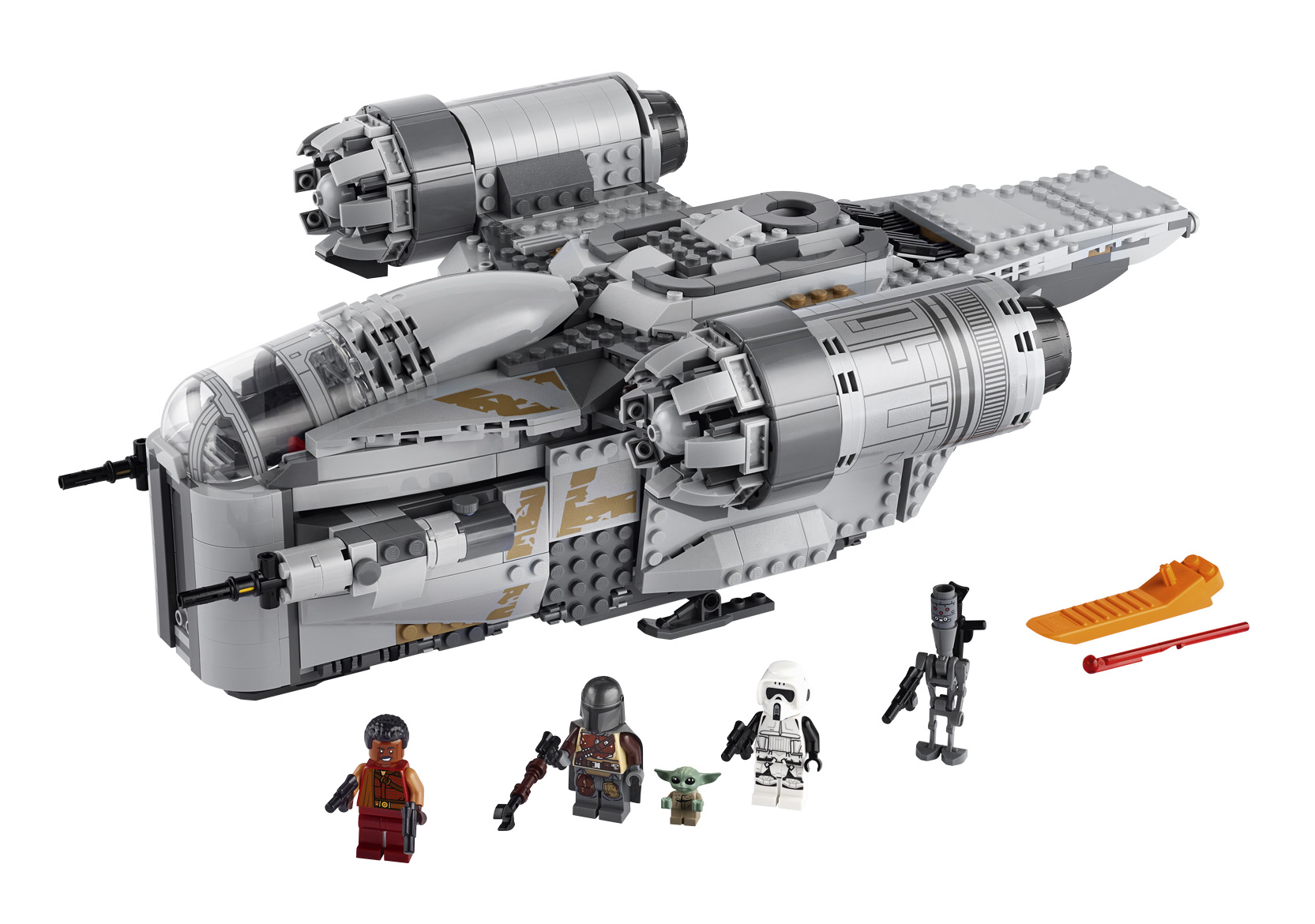 • The Razor Crest has a dual LEGO® minifigure cockpit, 2 spring-loaded shooters, cargo hold with opening sides/access ramps and carbonite bounty elements inside, sleeping area and detachable escape pod for creative play.