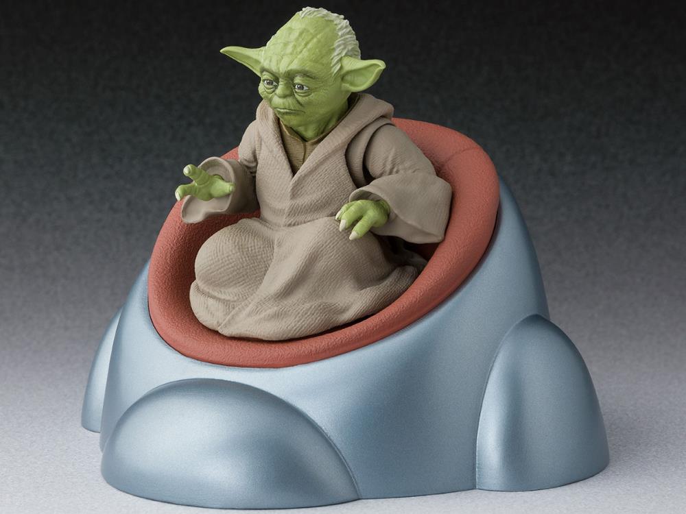 From Star Wars: Revenge of the Sith, the S.H.Figuarts Yoda figure stands approximately 3 inches tall. This highly articulated figure comes armed with his lightsaber and also his cane and senate chair.
