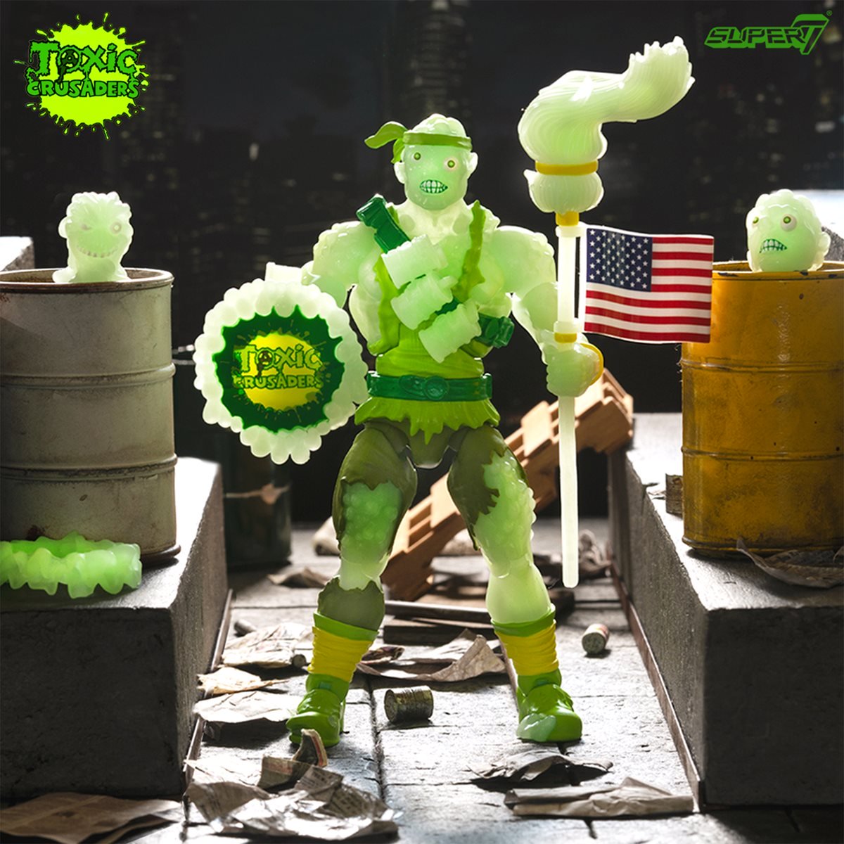 The Toxic Crusaders have returned after many years of suspension s Super7 revives the toy line. We have seen plenty of figures from the series return but this time Toxie is back and ready to clean up the streets. Just in time for some Earth Day action, Super7 has announced at a new Toxic Crusaders 6 inch deluxe figure will be getting a special Entertainment Earth exclusive release. This figure will be now glow in the dark and is packed with detail and accessories. He will come with Blobbie, shield, flag mop, an alternate head, and more. The figure was mold in special glowing green plastic to really make the glow really pop here. Toxic Crusaders fans will be excited to get their hands on this figure and you can here. The figure is priced at $44.99 and the pre-orders are going in and out so stay alert!