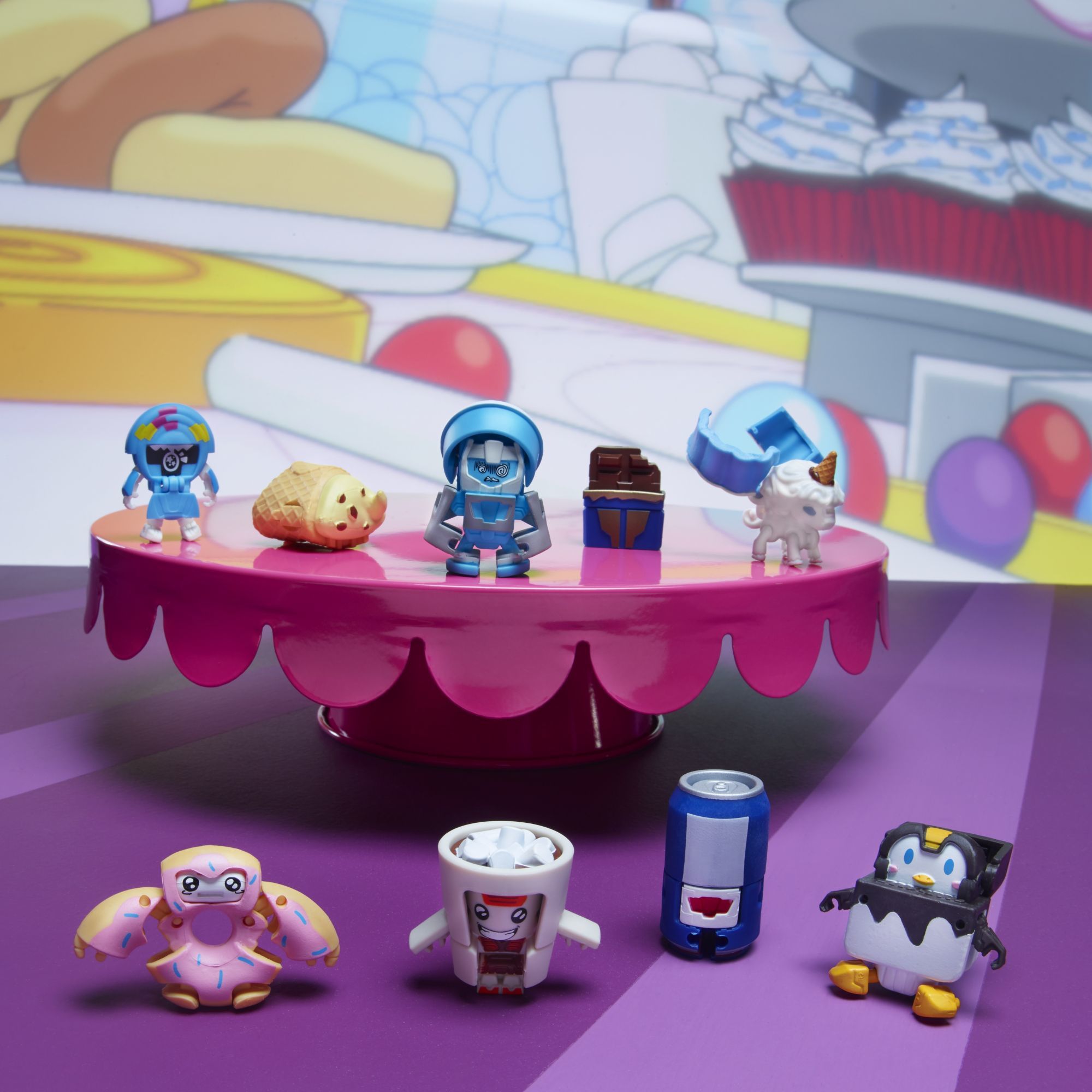Not long ago and somewhere close by, a glowing mist filled with TRANSFORMERS energy called ENERGON came down from the sky and covered a shopping mall. The things inside came to life as little TRANSFORMERS robots! These bots can hide in plain sight as everyday objects, meaning no one knows what's a bot and what's not! Mischievous, funny, and super silly, these are… BOTBOTS! These 1-inch tall figures change from totally normal stuff to little robots in 3 to 5 easy steps. The SUGAR SHOCKS are a squad of sweet treats who share their own unique sugar rush and kick things into overdrive. Each SUGAR SHOCKS collection pack includes 5 BOTBOTS figures: 2 from the SUGAR SHOCKS, 1 from the LOST BOTS, and 2 from other themed teams! Series 1 5-Pack SUGAR SHOCKS characters are SIPPY SLURPS, THE PLOP FATHER, WADDLEPOP, LOLLY LICKS, REMORSEL, SPRINKLEBERRY D'UHNUT, UNILLA ICEQUEENCONE, COCOA CRAZY, and NRJEEZ! Please note that not all SUGAR SHOCKS characters can be found in this SUGAR SHOCKS themed pack. Look for other SUGAR SHOCKS characters in blind bag assortment, other 5-pack assortment themed packs, and 8-pack assortment themed packs (each sold separately, subject to availability) to find different characters. Available at select retailers and on HasbroToyShop.com.