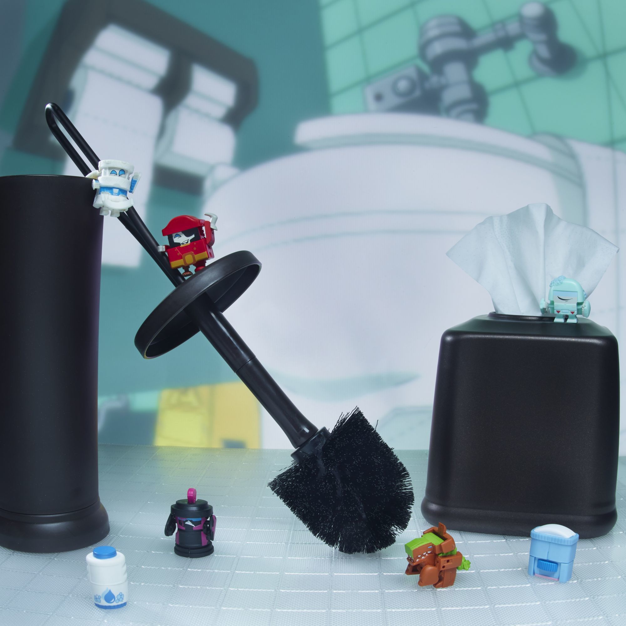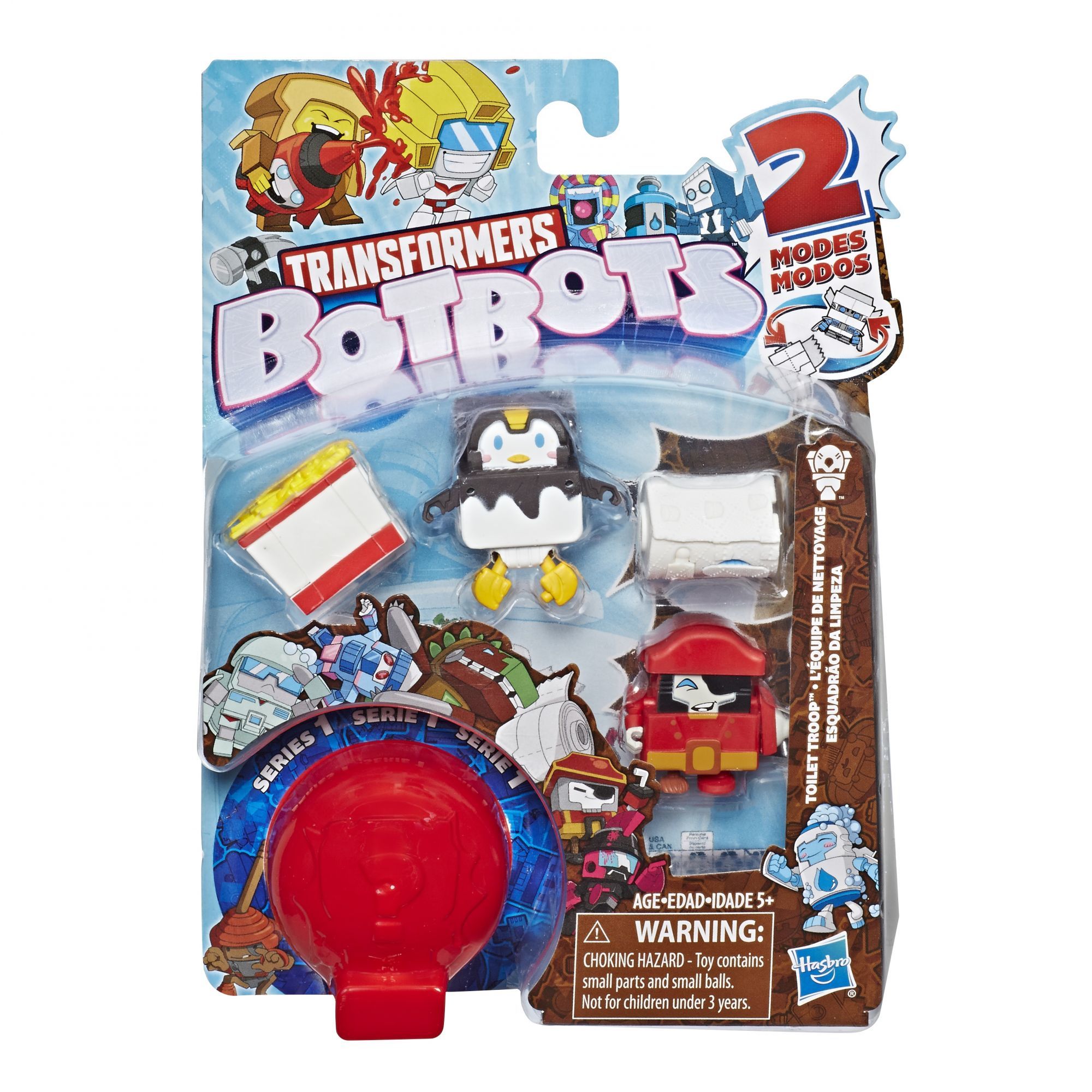 Not long ago and somewhere close by, a glowing mist filled with TRANSFORMERS energy called ENERGON came down from the sky and covered a shopping mall. The things inside came to life as little TRANSFORMERS robots! These bots can hide in plain sight as everyday objects, meaning no one knows what's a bot and what's not! Mischievous, funny, and super silly, these are… BOTBOTS! These 1-inch tall figures change from totally normal stuff to little robots in 3 to 5 easy steps. The TOILET TROOP is a clean-up platoon of bathroom defenders who take care of business by cleaning the bathroom and beyond. TOILET TROOP collection pack includes 5 BOTBOTS figures: 2 from the TOILET TROOP, 1 from the LOST BOTS, and 2 from other themed teams! Series 1 TOILET TROOP characters are SERGEANT SCRUBADUB, KING TOOTS, SUDSBEARD, NOBEEOH, STINKOSAURUS REX, POO SHAM, and FROHAWK! Please note that not all TOILET TROOP characters can be found in this TOILET TROOP themed pack. Look for other TOILET TROOP characters in blind bag assortment, other 5-pack assortment themed packs, and 8-pack assortment themed packs (each sold separately, subject to availability) to find different characters. Available at select retailers and on HasbroToyShop.com.