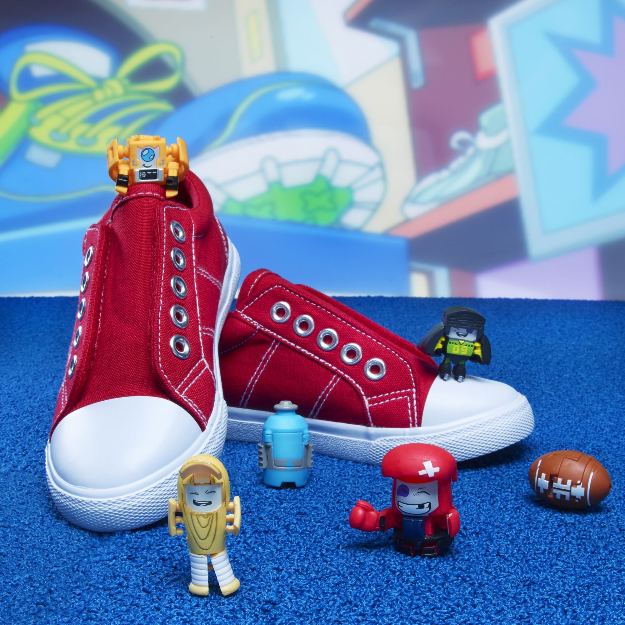 Not long ago and somewhere close by, a glowing mist filled with TRANSFORMERS energy called ENERGON came down from the sky and covered a shopping mall. The things inside came to life as little TRANSFORMERS robots! These bots can hide in plain sight as everyday objects, meaning no one knows what's a bot and what's not! Mischievous, funny, and super silly, these are… BOTBOTS! These 1-inch tall figures change from totally normal stuff to little robots in 3 to 5 easy steps. The JOCK SQUAD is crew of super sporty bots who love to win and are always ready to gear up and get their game faces on. JOCK SQUAD collection pack includes 8 randomized BOTBOTS figures: 2 from the JOCK SQUAD, 1 from the LOST BOTS, and 5 from other themed teams! Series 1 Jock Squad characters are LACEFACE, BATSBY, KIDD KLOBBER, PUCKSIE, FIT NESS MONSTER, and ARCTIC GUZZLERUSH! Please note that not all JOCK SQUAD characters can be found in this JOCK SQUAD themed pack. Look for other JOCK SQUAD characters in blind bag assortment, 5-pack assortment themed packs, and other 8-pack assortment themed packs (each sold separately, subject to availability) to find different characters. Available at select retailers and on HasbroToyShop.com.