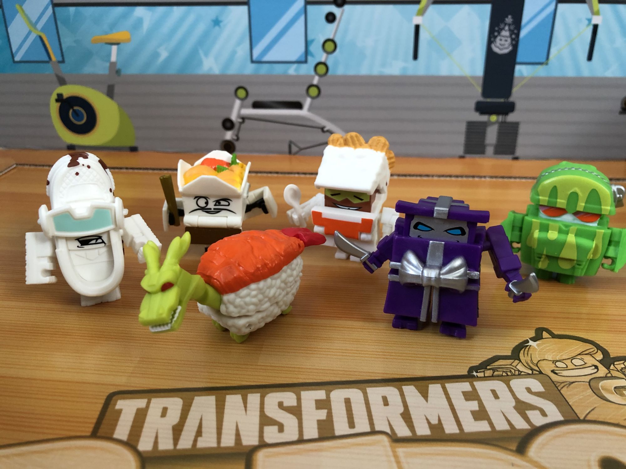 We finally move on to the 5 and 8-pack figure sets. Each pack does include a mystery figure, so it is always a nice surprise to see who you will be getting. We did manage to get a couple of doubles, which is totally expected when it comes to massive packs like this. In the end, we ended up with 26 new Transformers BotBots figures and two very special Winners Circle figures. Hasbro has definitely pushed the bar this time in Series 5 with more intricate objects and transformations. Some of these objects include a water gun, sushi, neck pillow, and some Chinese food. Each figure carries his own flavor and style and I love that about these Transformers toys. Hasbro is starting to included weapons and accessories into some of these figures like Lieutenant Lo Mein has chopsticks, Cheeros gets a spoon and Shifty Gifty has dual swords. The extra weapons take them to new levels and the articulation of some of them is pretty great for such small figures. So many amazing objects come to life with these figures and I want to go out and add more to my collection that we happened to miss like any from the Movie Mongols tribe that features popcorn, bratwurst, and chocolate cherries.