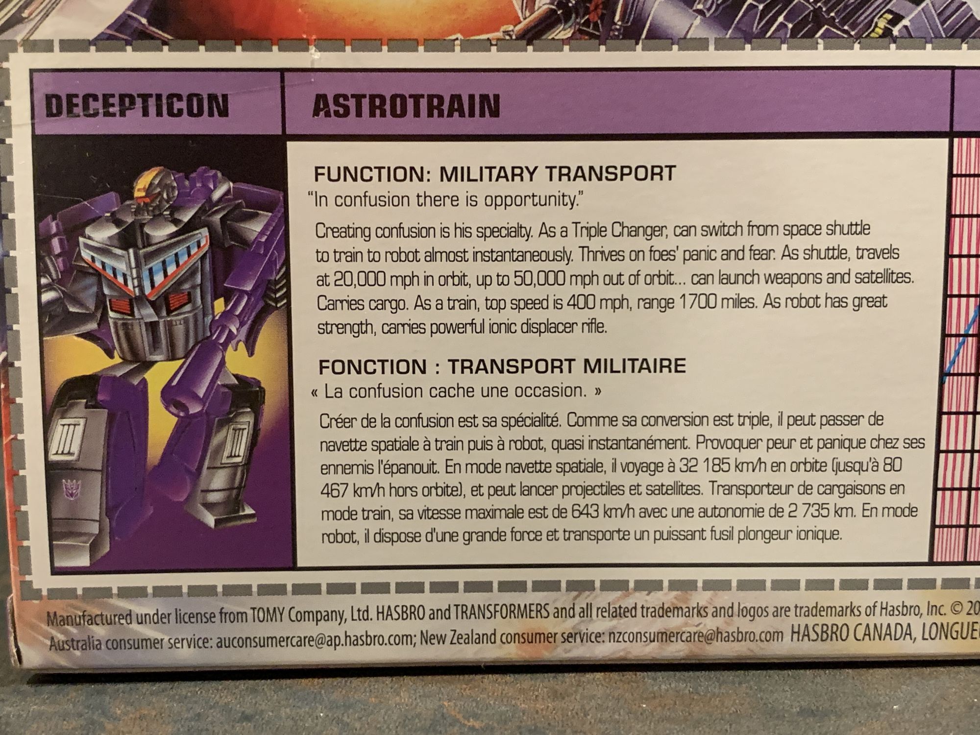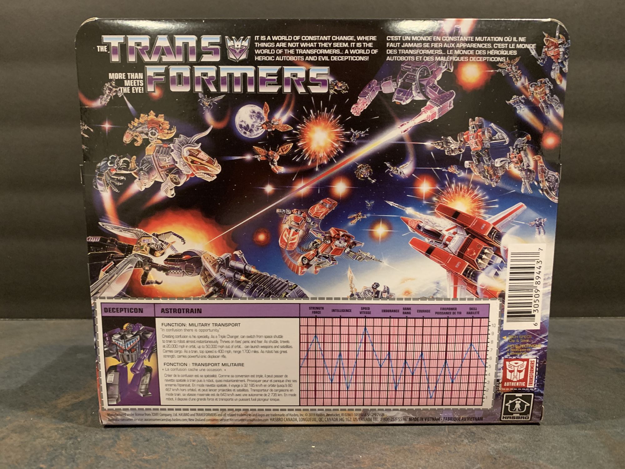 Transformers collectors for the past year can be forgiven for thinking it was the late 80's all over again when walking into the figure aisle at Walmart. Hasbro has been reissuing G1 robots for the last year, right down to the box art. The appeal for these is of course nostalgia, I was born in 1984, so walking into a toy store and buying a G1 Optimus Prime wasn't likely. Last year though, I was able to do just that (minus the trailer though). Hitting Walmarts now is a Transformers figure I never got, even when I got older throughout the years. Astrotrain was always one of those Decepticons that I would forget about, and now that I picked up the reissue. Let's take a look at it shall we?