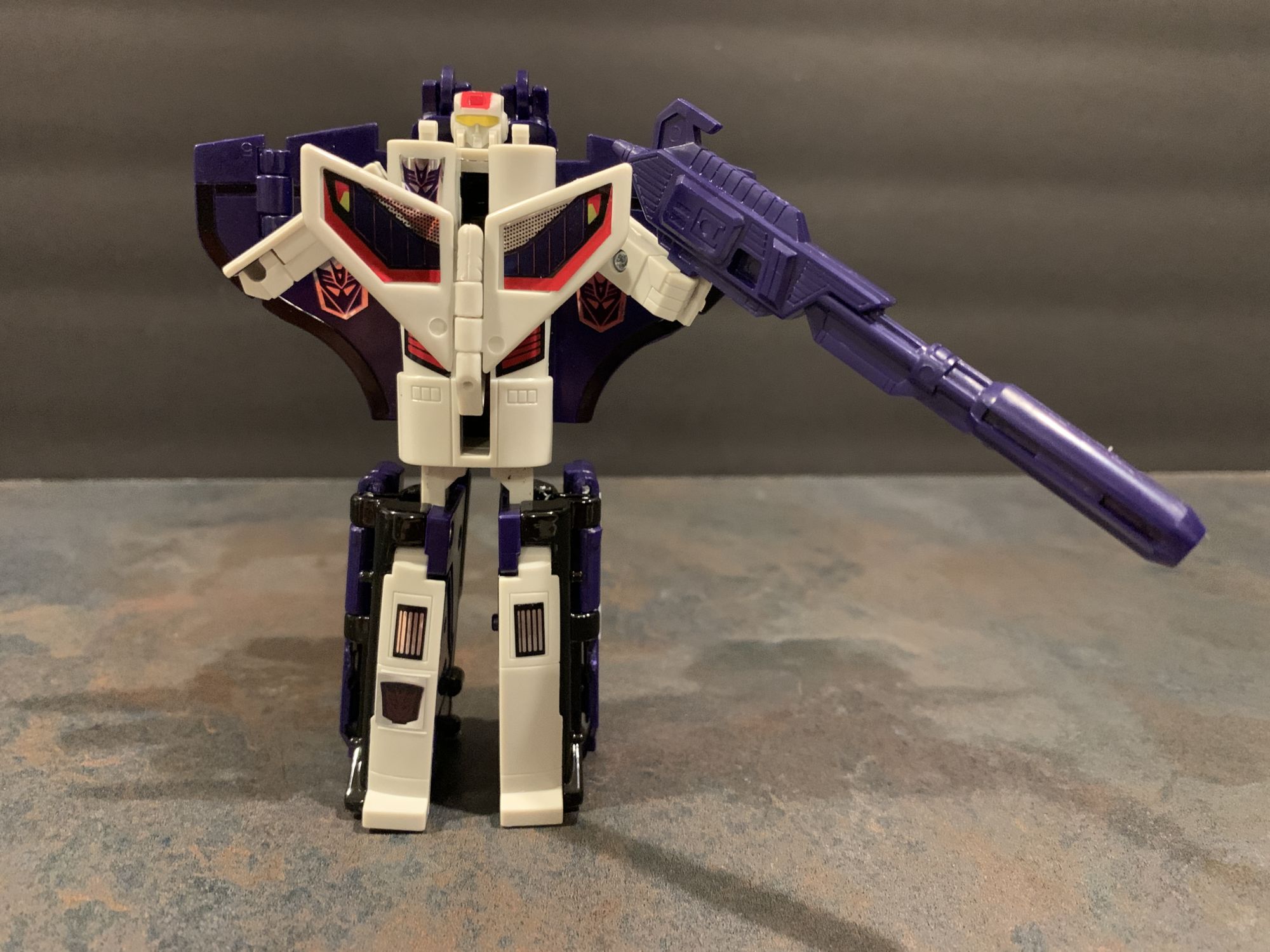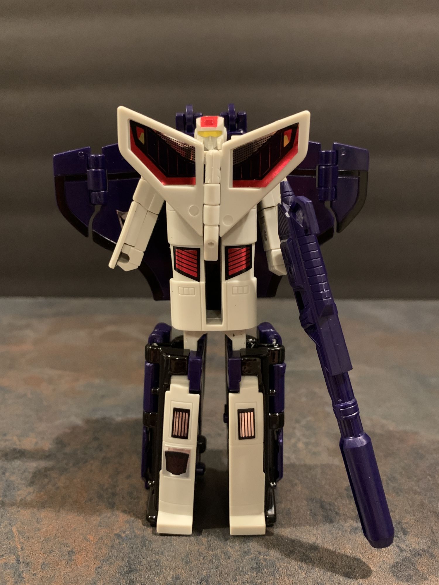 I keep all my bots in robot mode however, and in robot mode he is awesome. Astrotrain stands really well, and poses very menacingly. My only complaint is that he doesn't feature any bend in the elbows, so you for sure can;t get him anywhere near the pose on the front of the box. Still, there is just something charming about a G1 Transformers figure that just makes one smile. His little robot head, his giant gun. Just awesome.