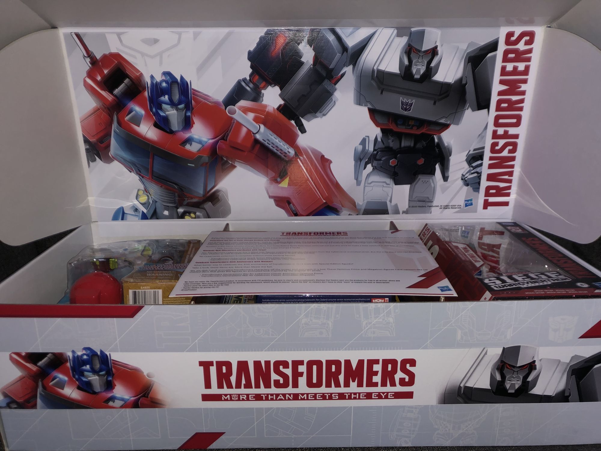 Hasbro was kind enough to send us a mysterious Transformers box for free. Just let us take the time to thank them and dive into a review. Right off the bat, the packaging is awesome! Just the box it came in shows of Tansformers greats Optimus and Megatron with the iconic catchphrase "More than meets the eye right now". Inside that there is another beautifully detailed Transformers box to celebrate Transformers 35th anniversary. The box is split up between auto bots and deceptive cons with fantastic are on each side showcasing some of the greats.