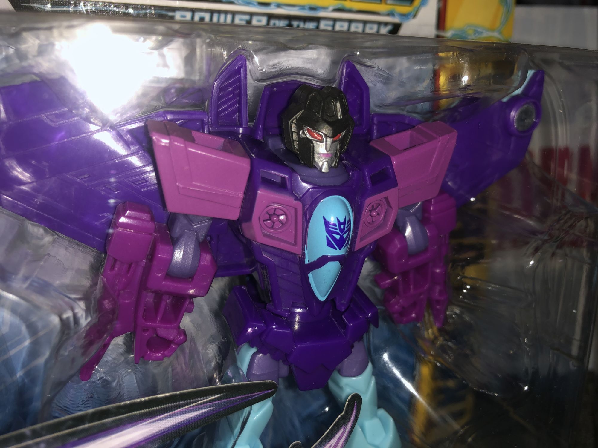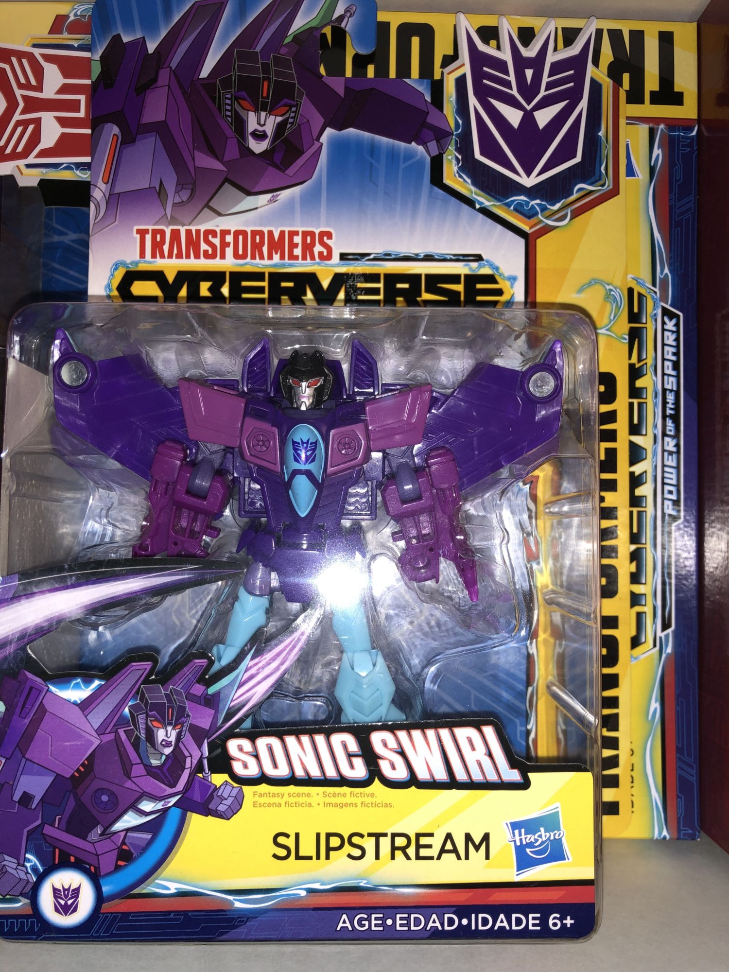 Now we are diving into the Transformers Cyberverse line that is inspired by the popular characters from the Cyberverse Animated Series. Target is the only place you can find the Elite Class Cheetor and the Cyberverse Warrior Class Slipstream. Slipstream is a female Decepticon and her color scheme is pretty amazing. The light purple, dark purple, and teal colors go well with her. She does transform into our jet in just seven steps and even has a sonic swirl power mode.