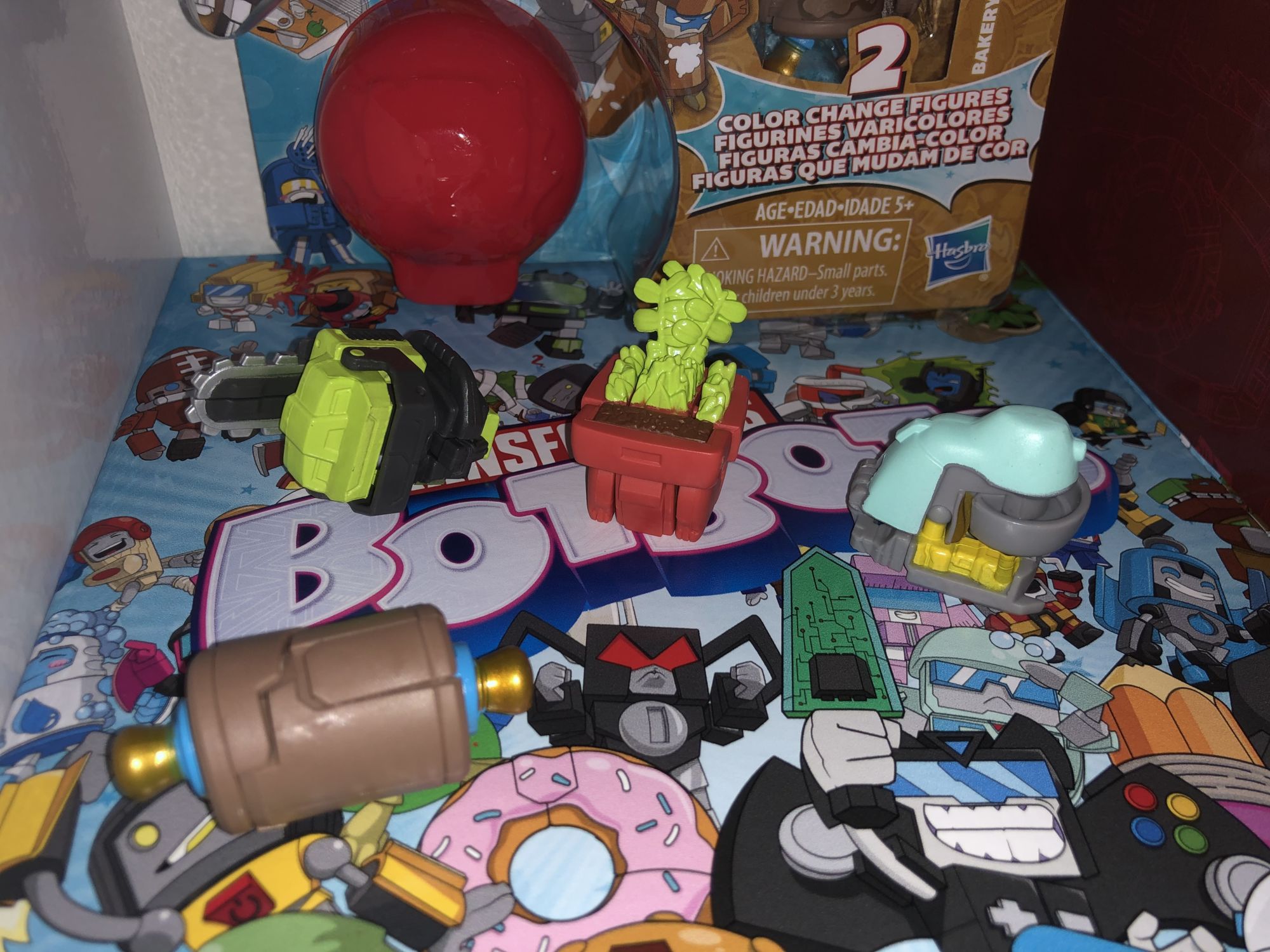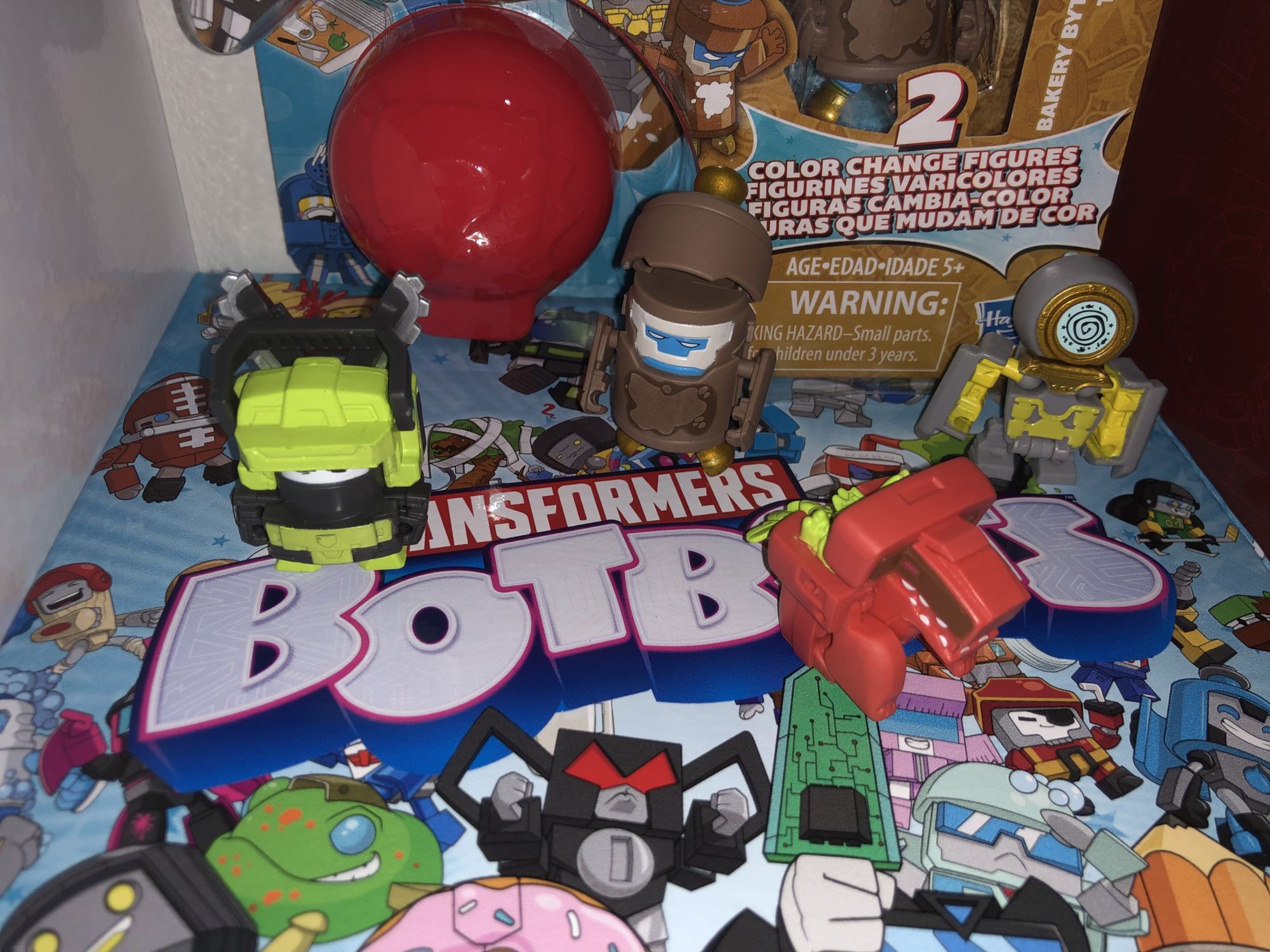 Now we dive deeper inside the box only to be greeted with three separate categories of new Transformers exclusive products. All of these are retailer exclusive's and I am excited to see what we got. First up is the color-changing BotBots from Amazon. There are two Transformers BotBot Bakery Bytes Color Changing 5-pack. Being a MOC "Mint on Card" collector I usually leave things in the package but with the BotBots you have to take a closer look.
