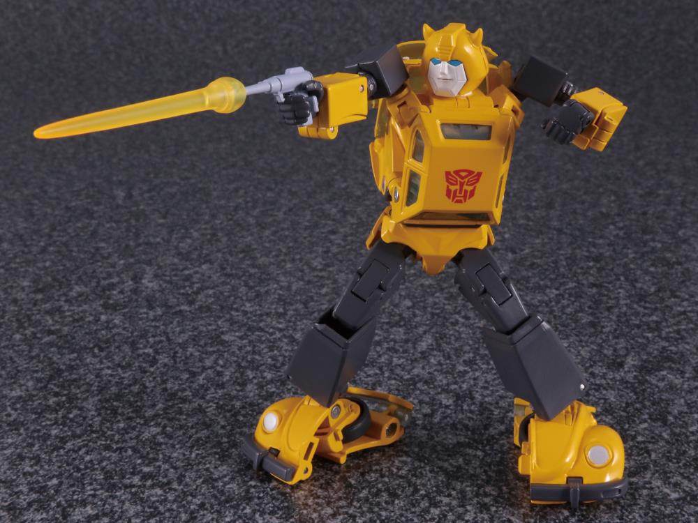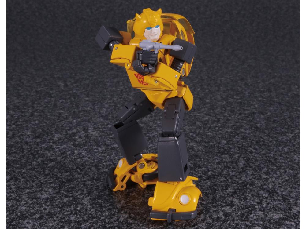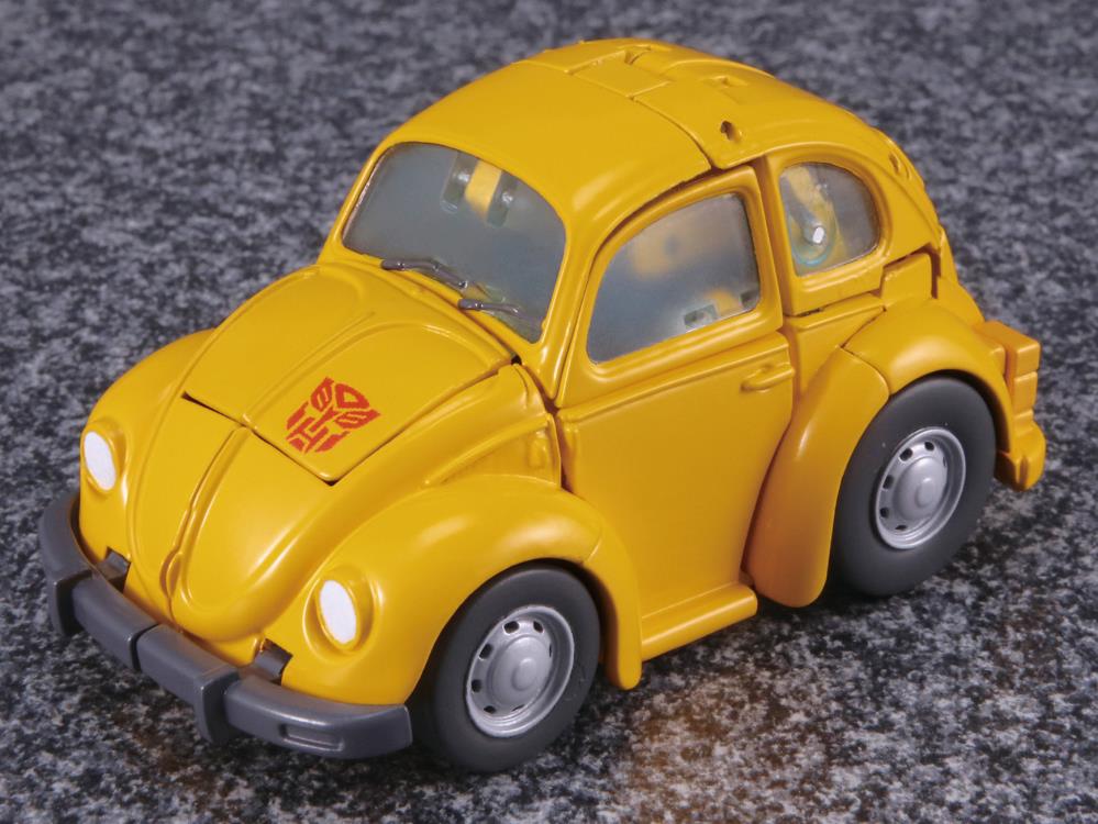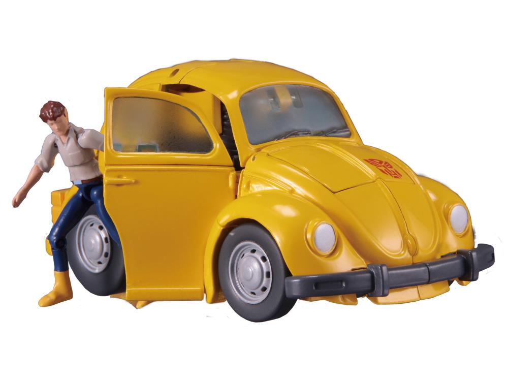 Joining the Transformers Masterpiece line is everybody's favorite Autobot, Bumblebee. Transforming from robot to his classic VW vehicle mode Bumblebee features translucent windows and opening doors while in vehicle mode. Bumblebee comes with several accessories including alternate face plates and an in-scale Spike Witwicky figure.