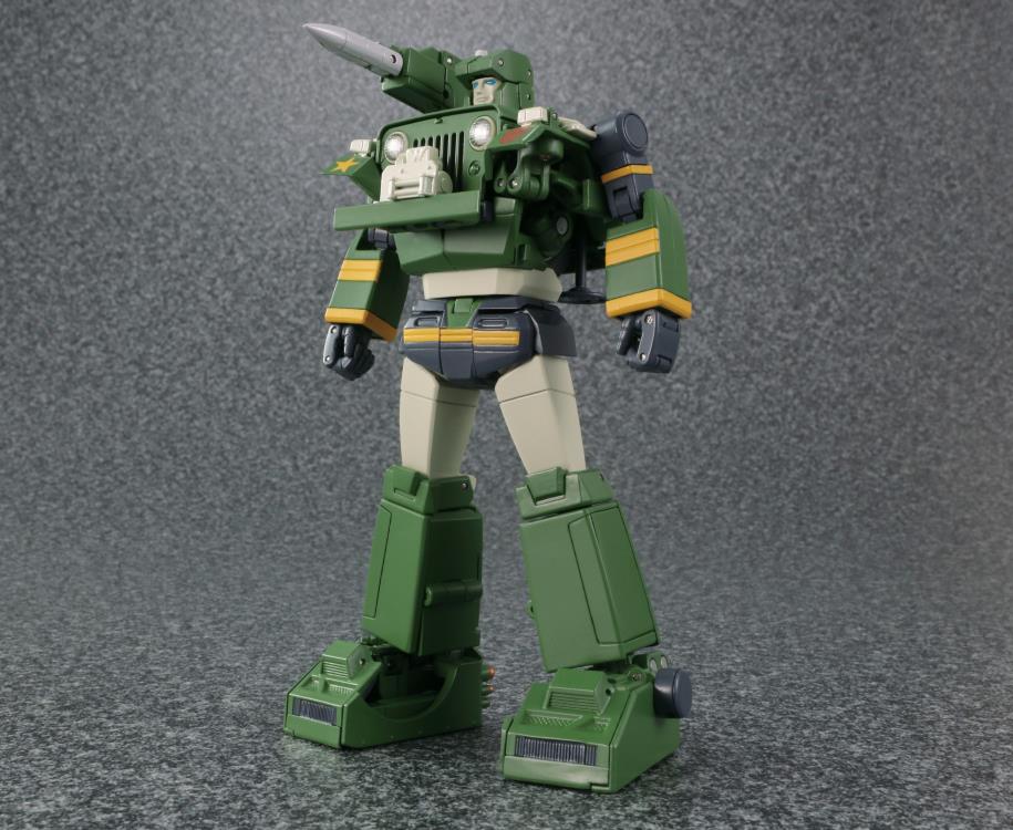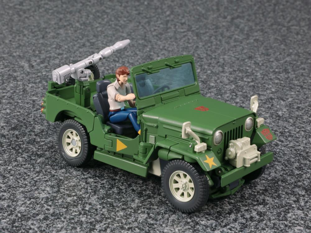 Based on the original cartoon series, the Autoboot warrior Hound joins the Transformers Masterpiece figure line. Hound is a fully poseable figure and transforms into an armored Jeep that features realistically reproduced details under the supervision of Fiat Chrysler Automobile. Hound's hood can be opened, cab can be removed, and can be driven by the included Spike figure or the hologram driver.