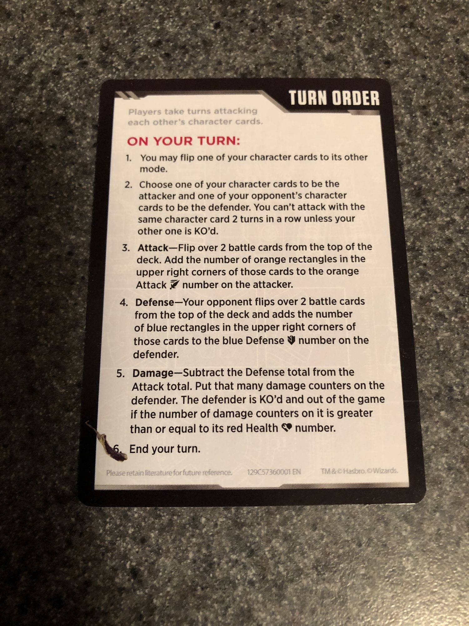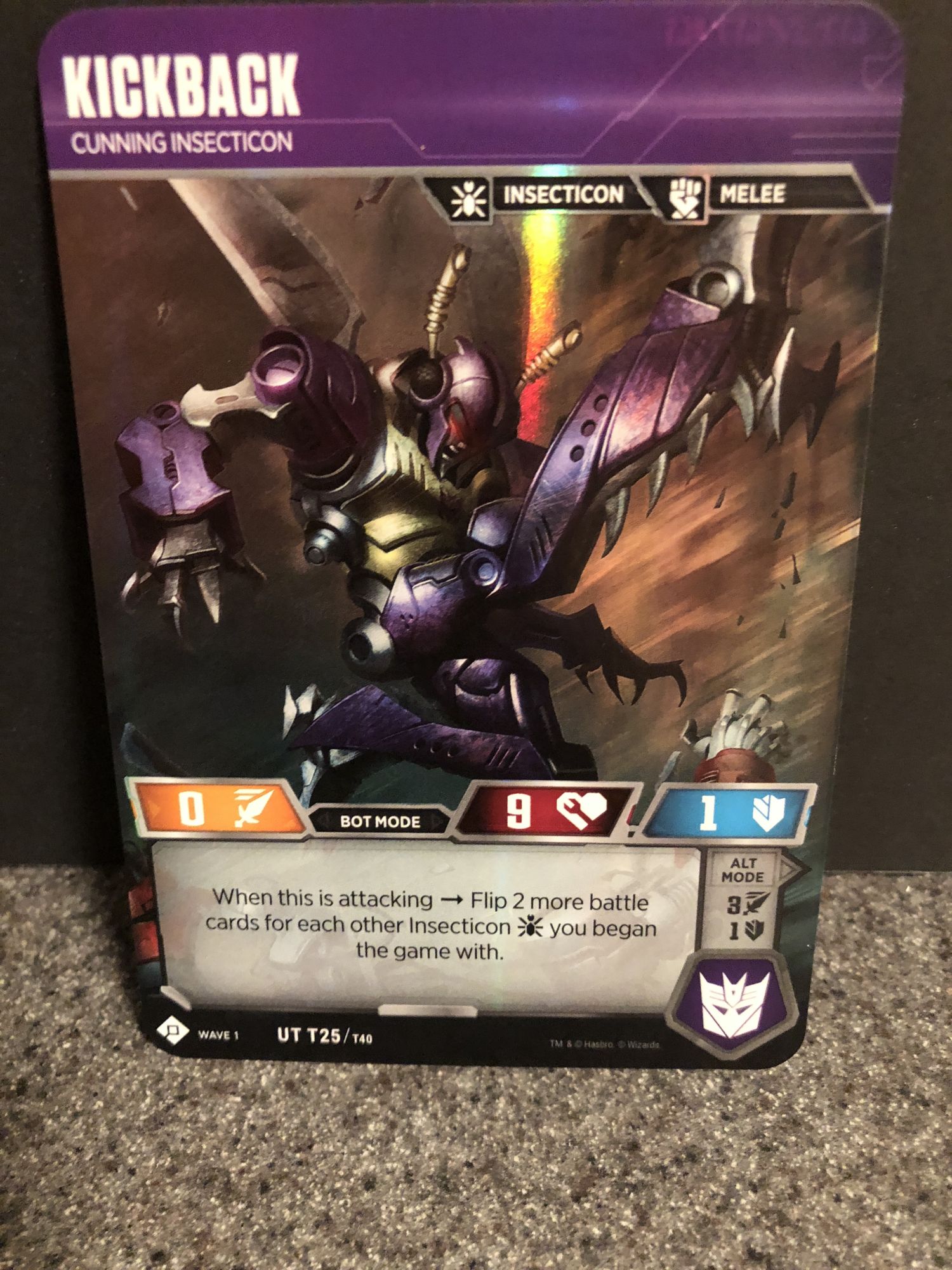 First thing you notice is how big the character cards are. I love it! Show off that artwork and make the dang cards as easy to read as possible. Every important marking is bold and clear, and the rules could not be easier to follow. This is a two-player battle game, and really easy to just pick up and play. It doesn't take long to play, but the battle card combinations you can make with the character cards will keep you playing for quite awhile. The Autobots starter pack comes with four robots- Optimus Prime, Bumblebee, Ironhide, and Red Alert. The booster pack I opened had Decepticon Kickback. Each of the character cards feature foil printing on their alt mode side, with their vehicle on the opposite one.
