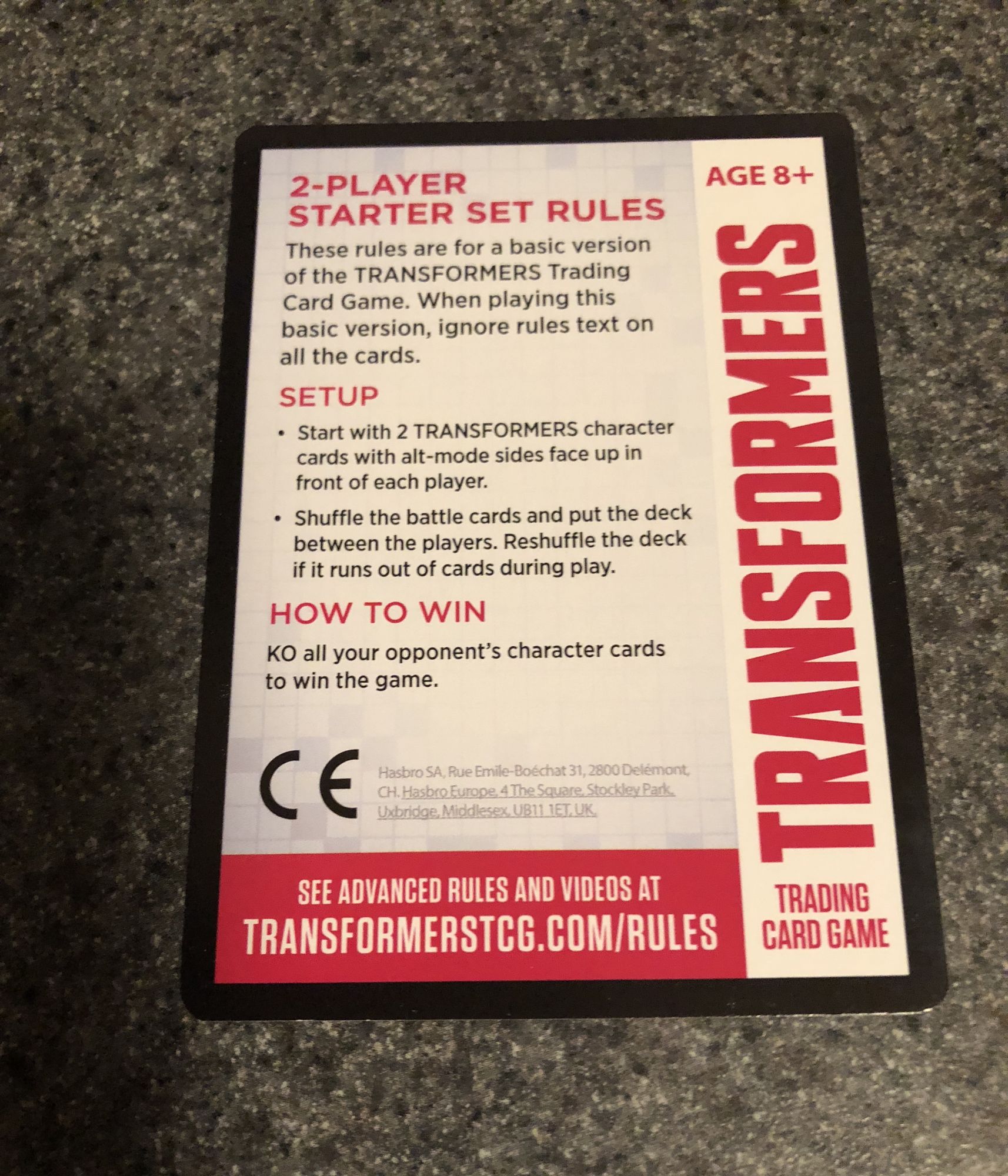 The TRANSFORMERS Trading Card Game is a fast, easy-to-learn action battling card game designed for two players. Players build a team of TRANSFORMERS character cards and power them up with a customizable deck of battle cards. TRANSFORMERS character cards are huge – character cards in the AUTOBOTS Starter Set and Booster Packs are twice the size of standard playing cards, and can be flipped from bot mode to alt mode and back – and feature premium printing treatment on one of their sides. The deck of battle cards features Action and Upgrade cards to enhance TRANSFORMERS character cards.