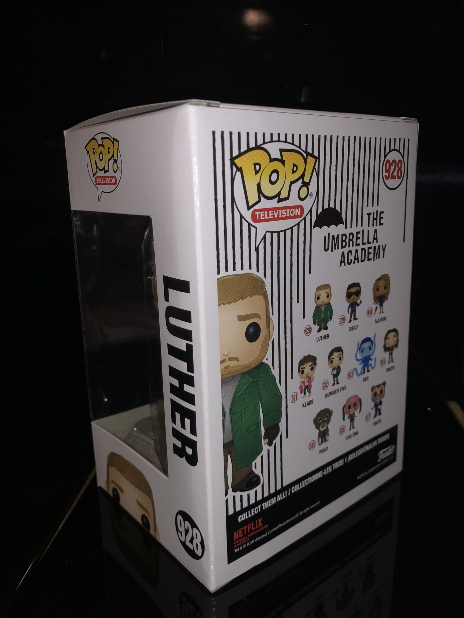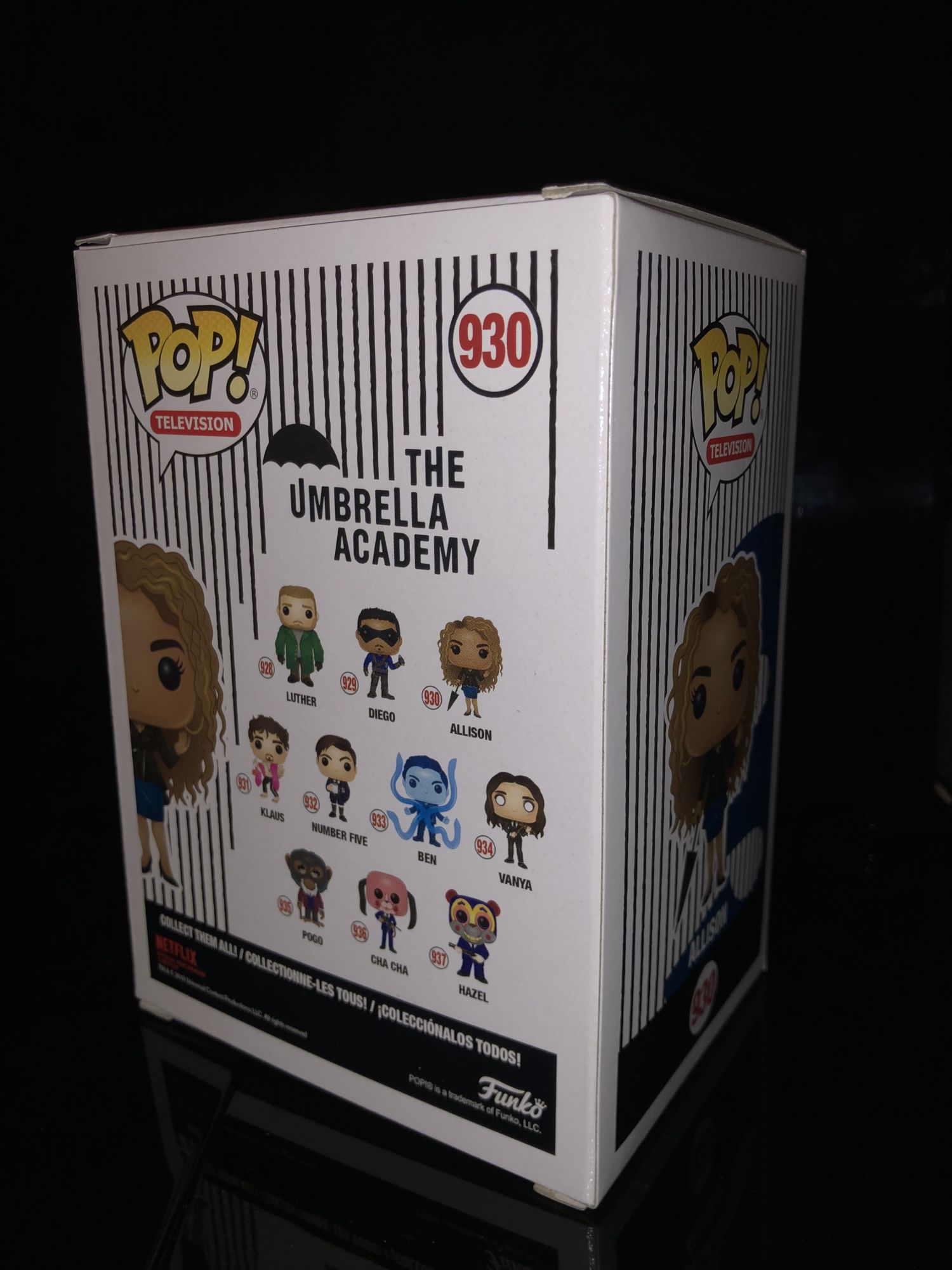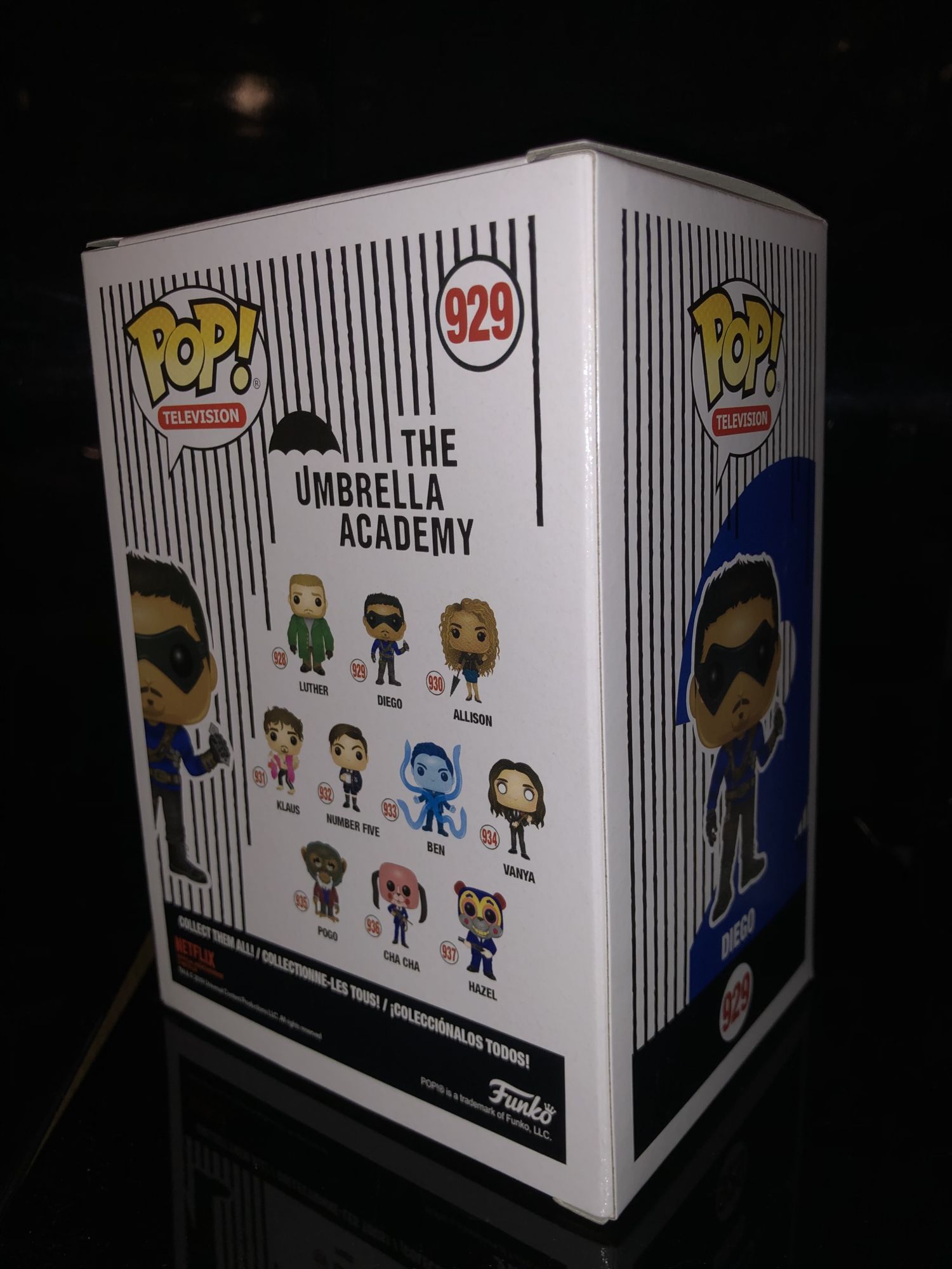 If you don't know the story it is about seven kids bought by a billionaire who have superpowers and become a fighting force. The Netflix show takes place years after and that's when the drama ensues. There were 13 Funko Pops in total this release with two Chases and one of them has an exclusive glow-in-the-dark version going to Hot Topic. The packaging for each Umbrella Academy character is the same as every other Funko Pop box, but the design on the side is pretty unique. Not only is there a corresponding number located on the side, but there is a quote on the back flat for each character.