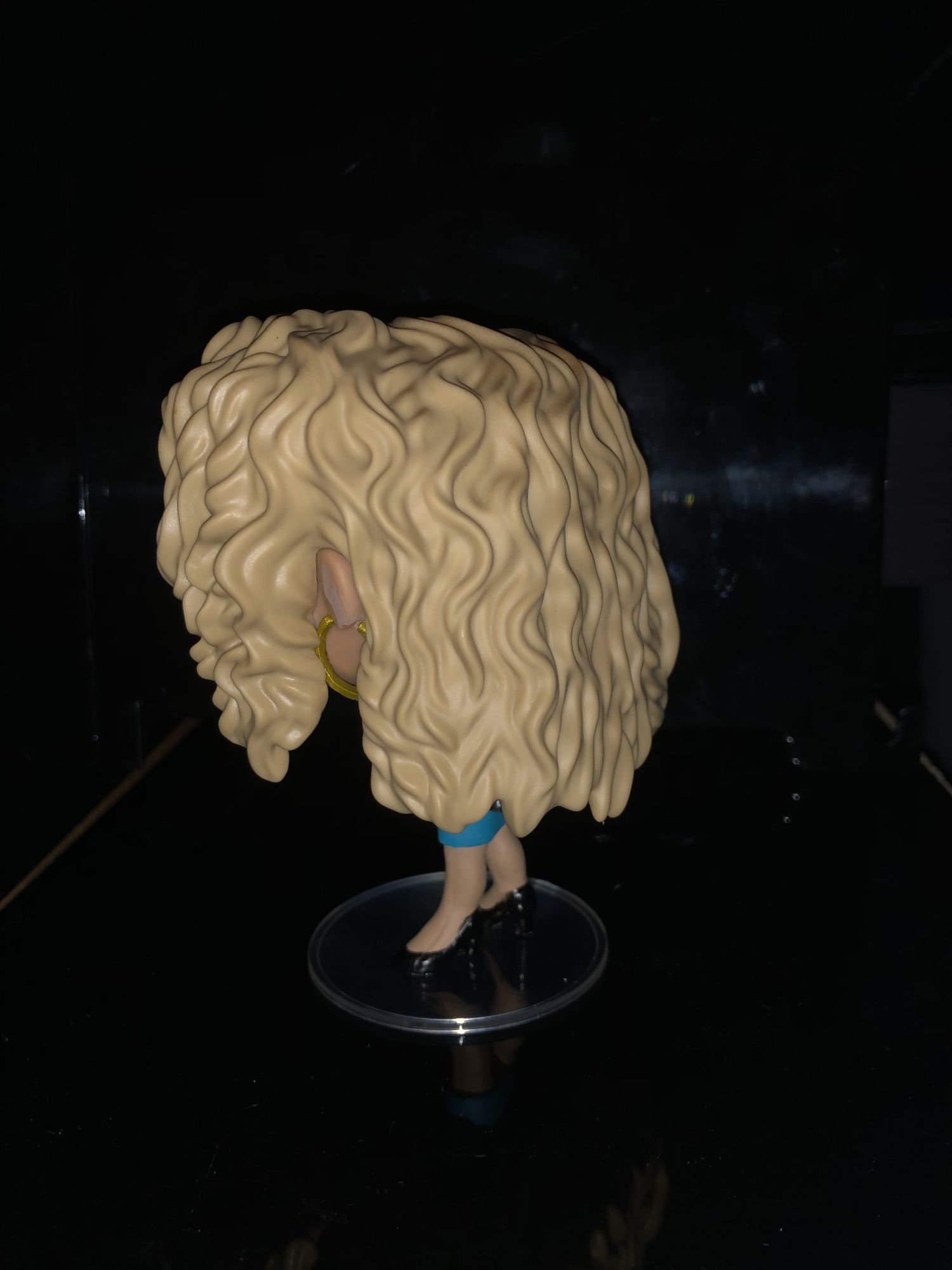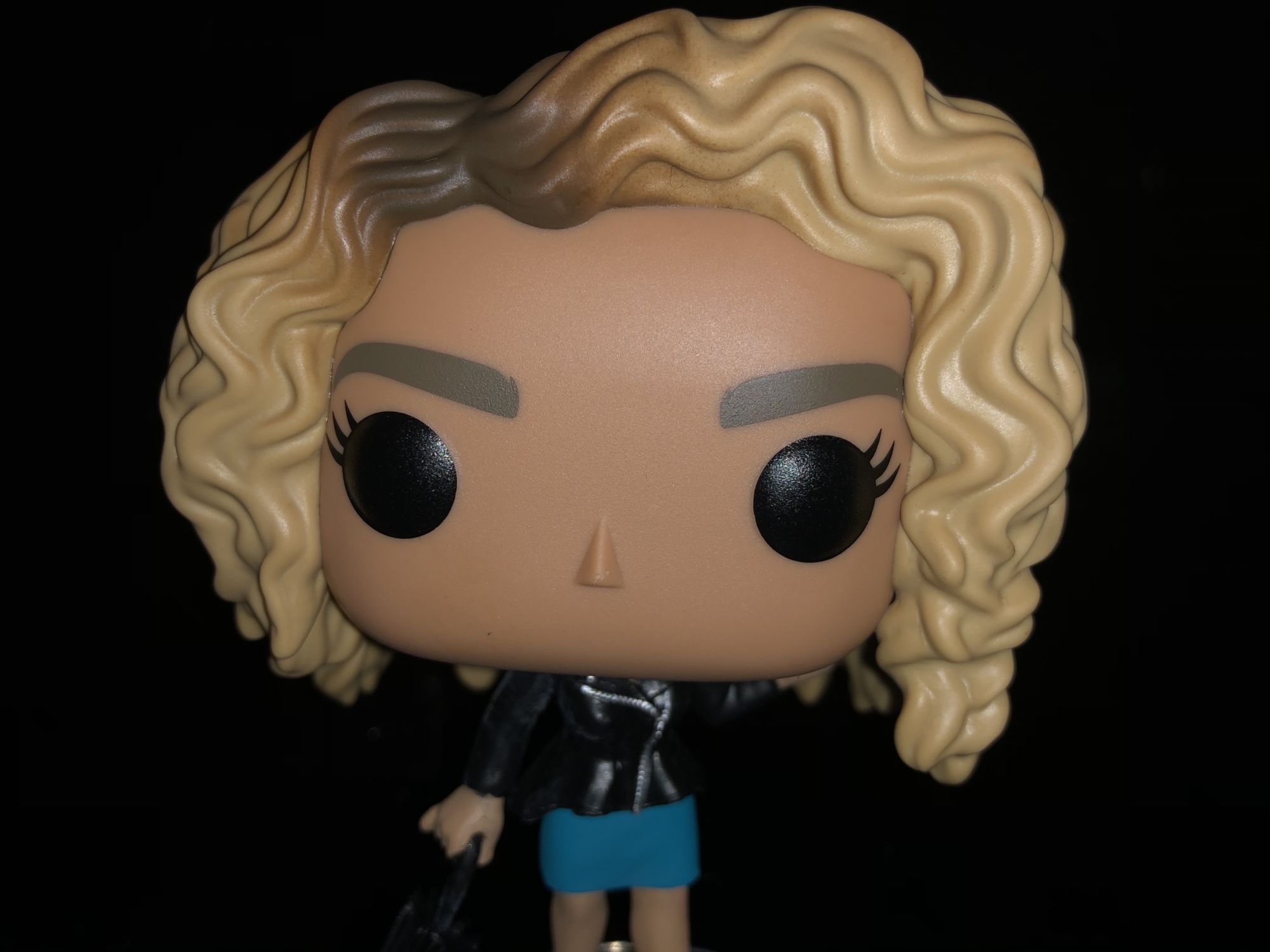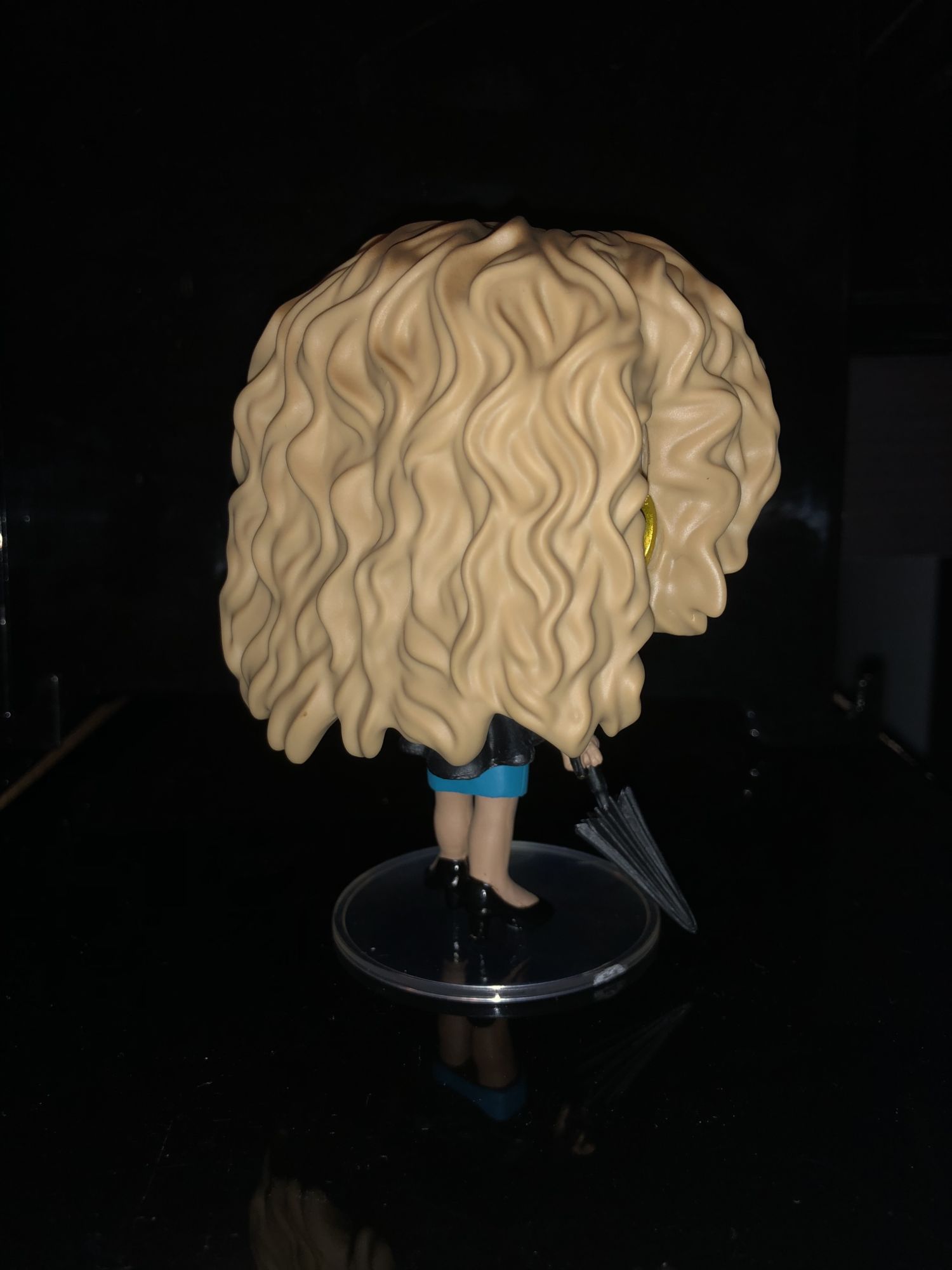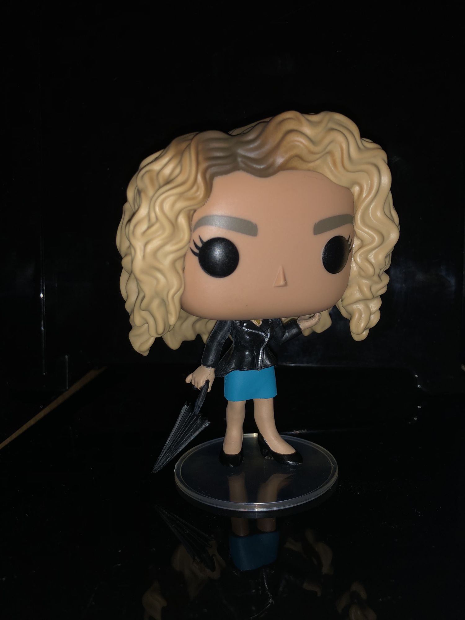 Her character is pretty well designed too from the waves of her hair to her leather jacket. I love the different dimensions that Funko added to the color of her hair. Her umbrella was slightly crooked when I opened the figure, but that's an easy fix by bending it back to place. She does come with a display stand so she doesn't fall over, which gives here a balance to counter the weight. Her jacket is very well detailed as you can see the buttons from the zipper; to a necklace that she wears.