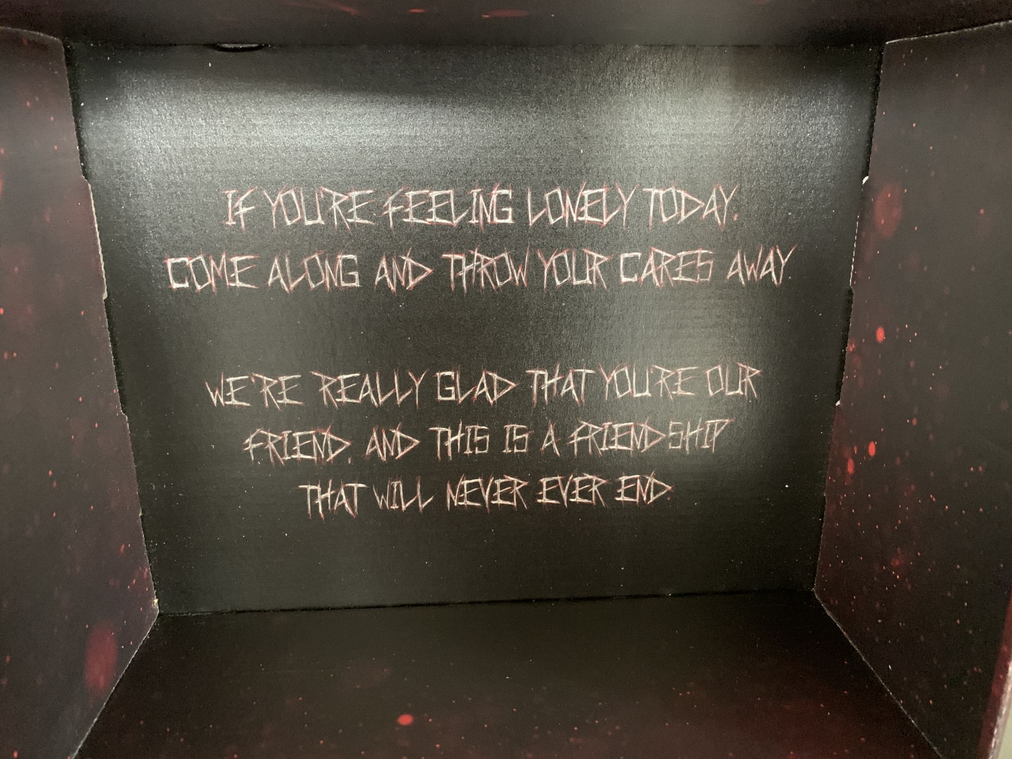The box itself features some cool Fiend key art, playing further into the sinister nature of the character. Once you open the box and remove the contents, the following message greets you: "If you're feeling lonely today, come along and throw your cares away. We're really glad that you're our friend, and this is a friendship that will never, ever end." That last part is the theme of the Firefly Funhouse. Excellent stuff and the presentation is already fantastic.