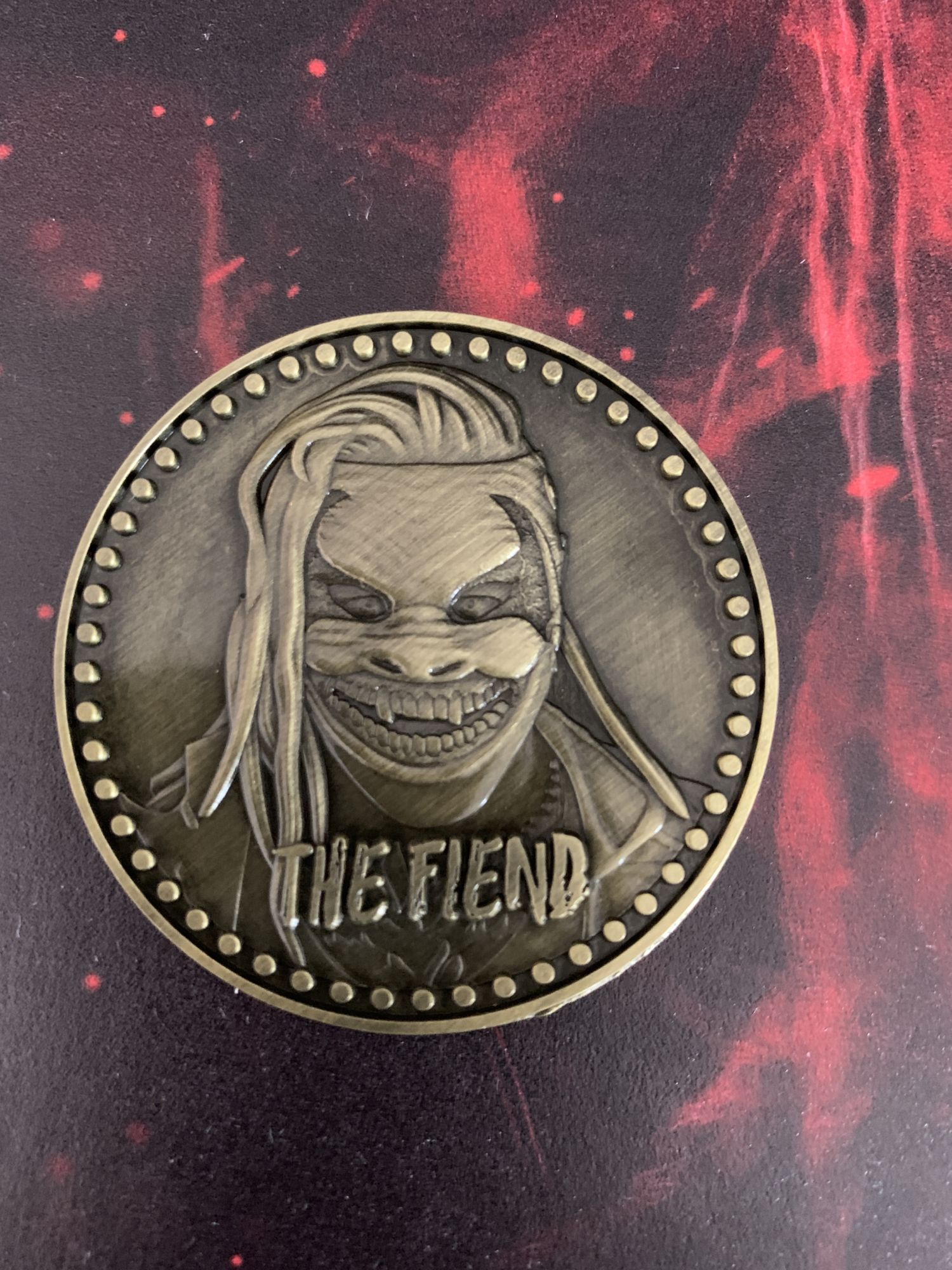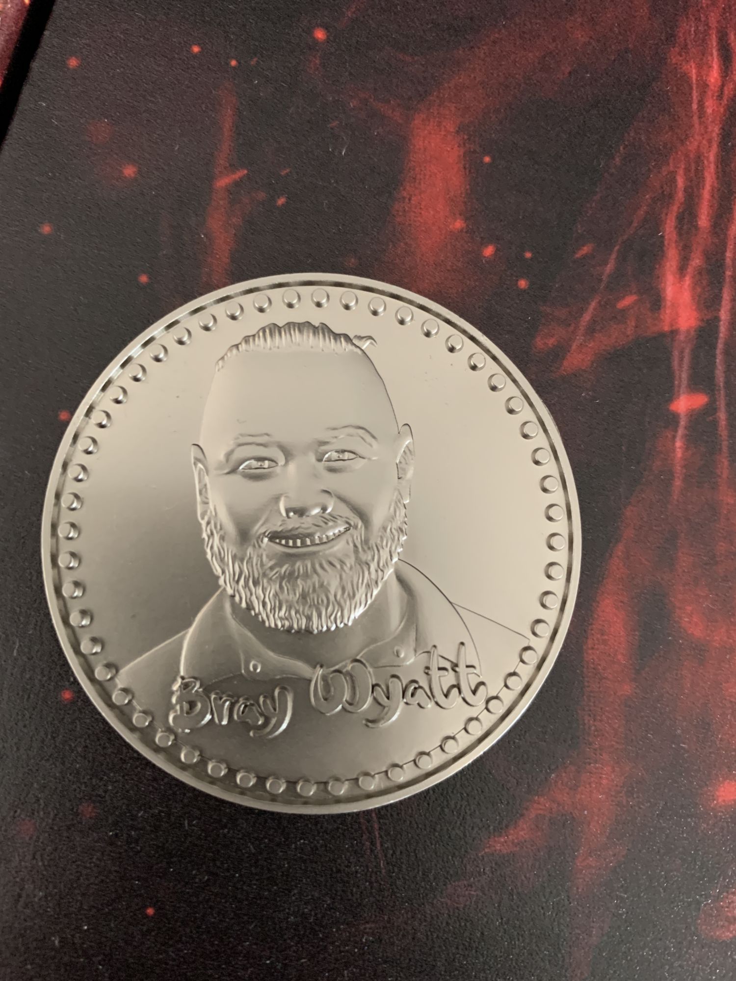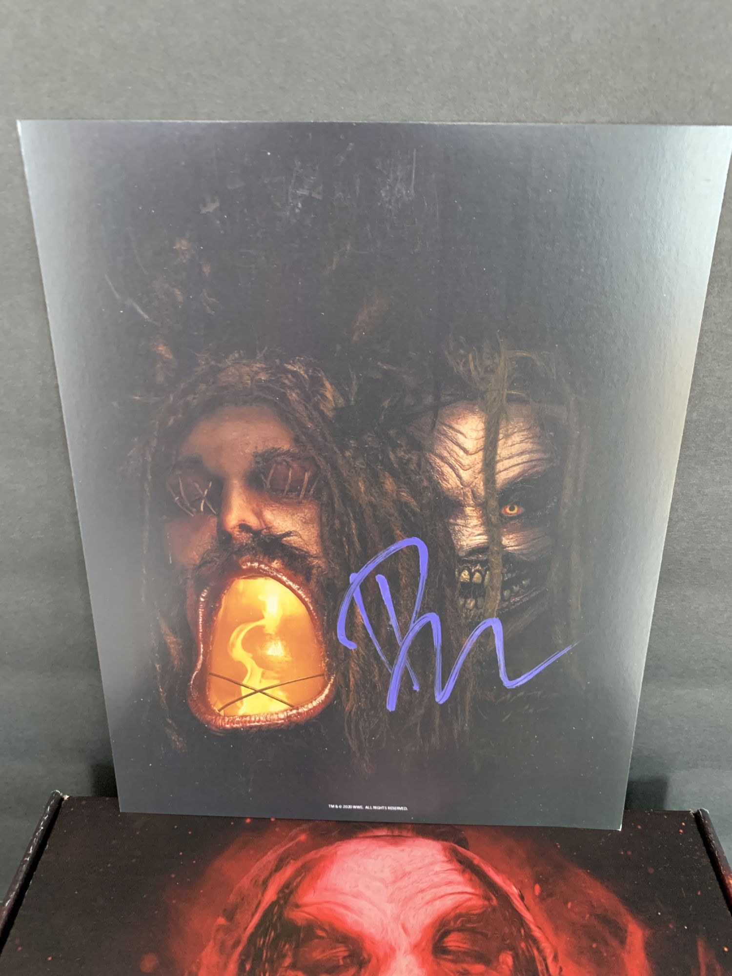 Now for the pieces, I did want in this box. This coin is double-sided and features Wyatt on the silver side, and The Fiend on the other in a really nice bronze wash. There is also some heft to it. I was not expecting this to be this heavy: excellent design and a nice piece for the collection. A very cool 8X10 signed photo is also included, featuring Fiend holding his gnarly Wyatt head lantern he carries to the ring.