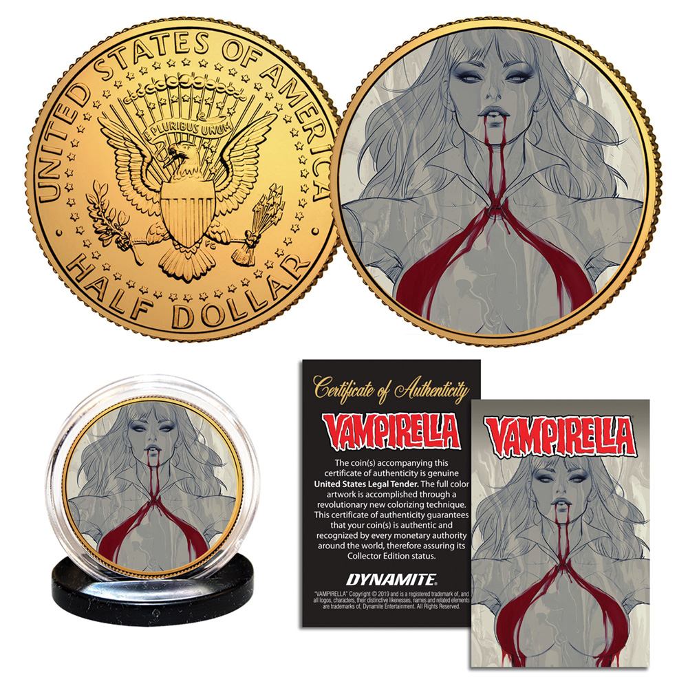 Dynamite's limited edition coins use an innovative colorization technique over top a base of authentic US John F. Kennedy Half-Dollars plated in real 24-karat gold. Packaged with a full-color Certificate of Authenticity and within an acrylic capsule to protect the coin, this currency is in fact legally able to buy a newspaper or bag of chips – but you won't want to do that!