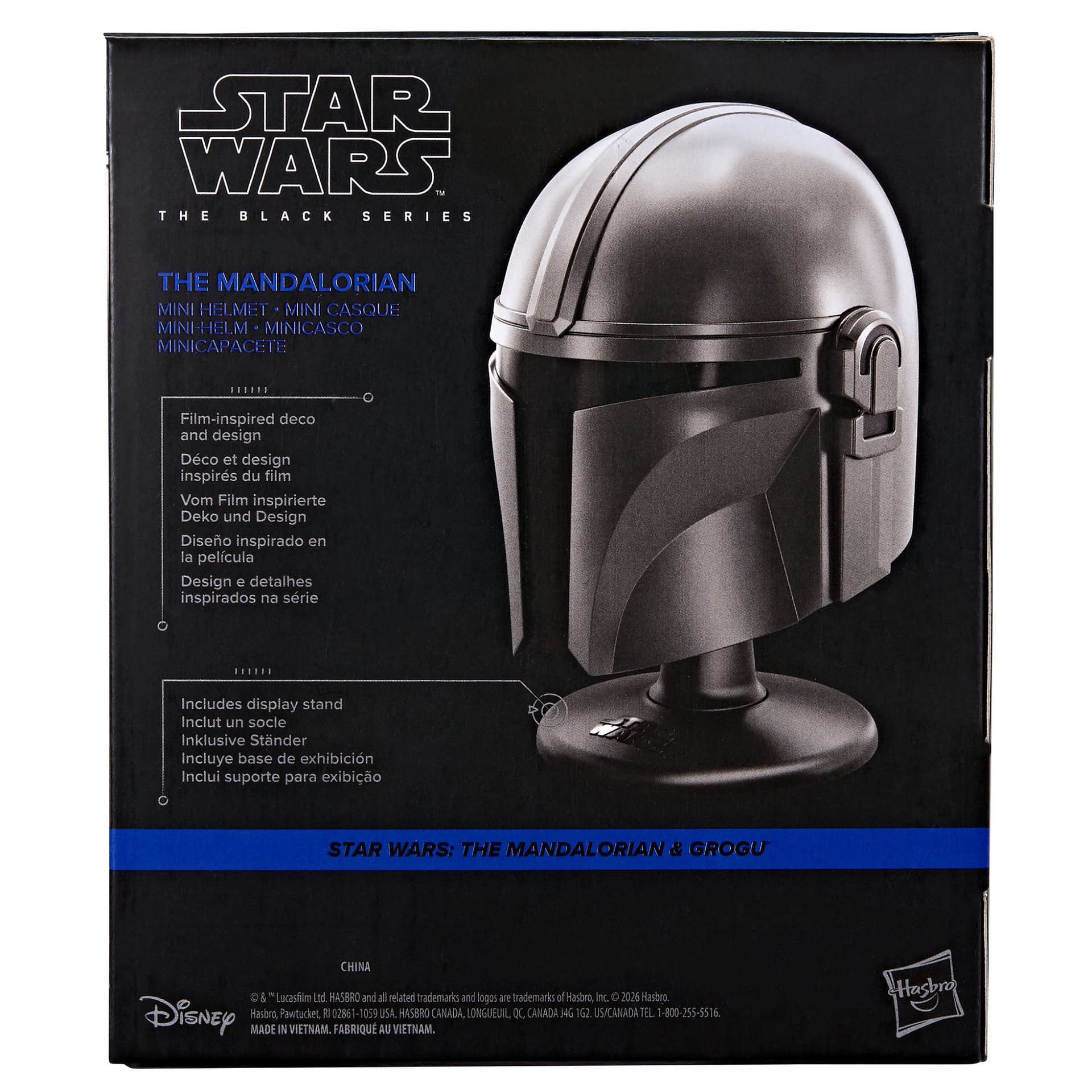 "Detailed to look like The Mandalorian's helmet from STAR WARS: THE MANDALORIAN & GROGU™, this scaled-down STAR WARS: THE BLACK SERIES helmet is an impressive addition to any fan's shelf. The helmet comes in at around 6 inches tall when placed on the included stand and great for display as a desk accessory. Look for other premium mini helmets and other STAR WARS collectibles from THE BLACK SERIES (additional products each sold separately, subject to availability)."