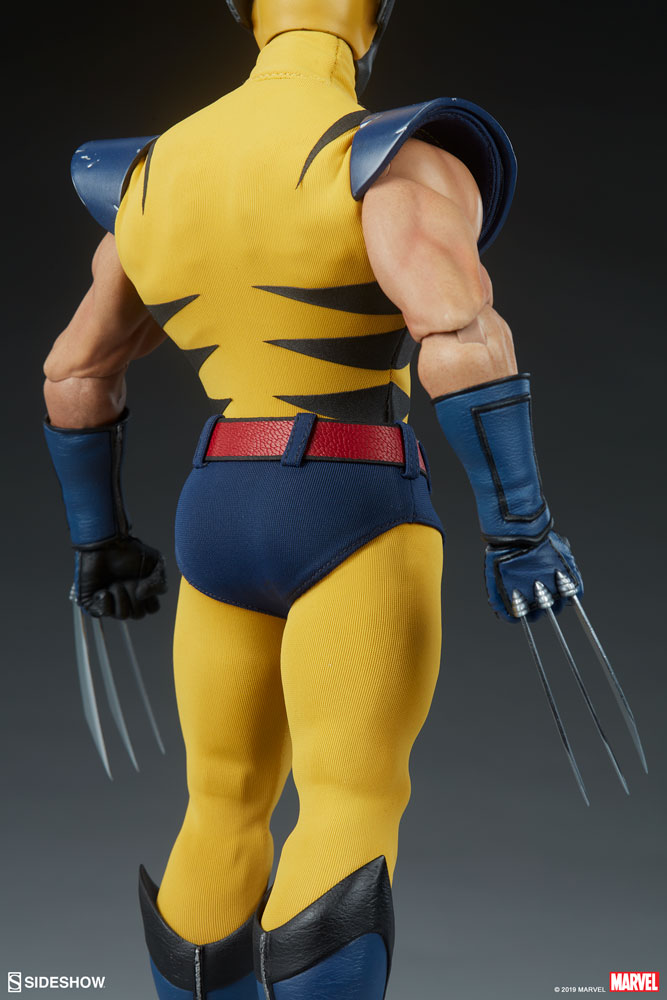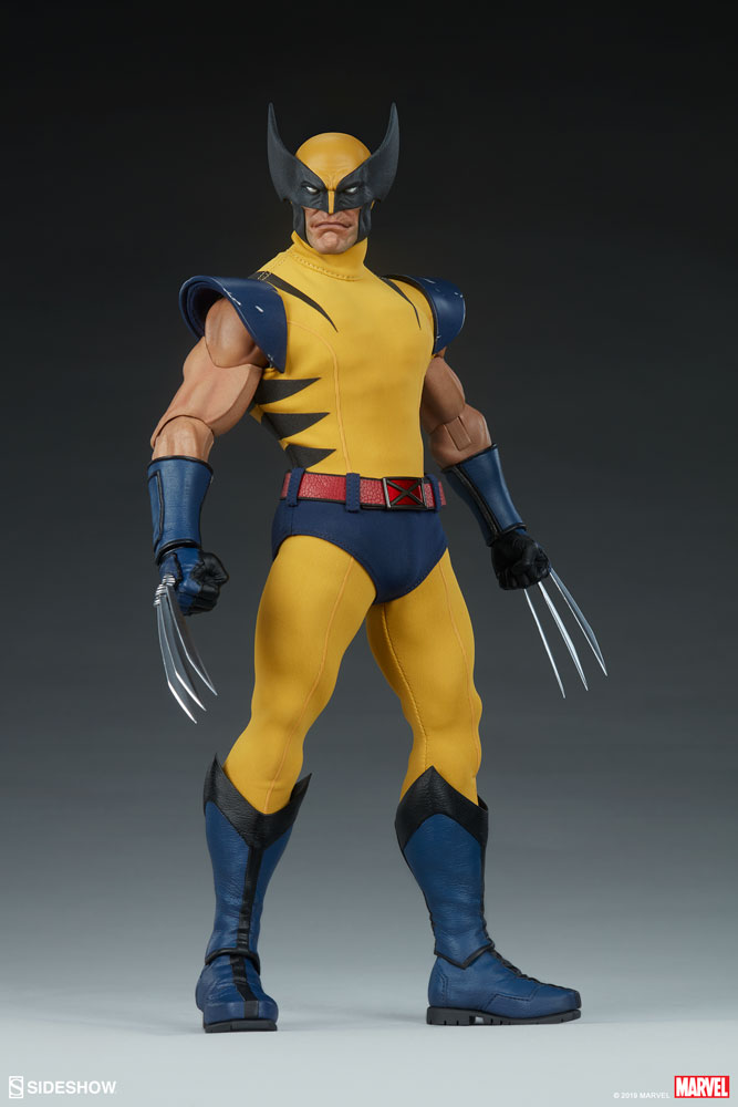 The Wolverine Sixth Scale Figure features a comic-inspired head sculpt of everyone's favorite feral mutant, with a stern expression beneath his yellow and black finned cowl. Wolverine's costume includes a yellow fabric bodysuit with black stripes, a set of blue fabric briefs, and a red fabric belt with an 'X' buckle. His classic costume also has sculpted elements like distressed blue shoulder armor as well as blue and black gauntlets and two-part boots.