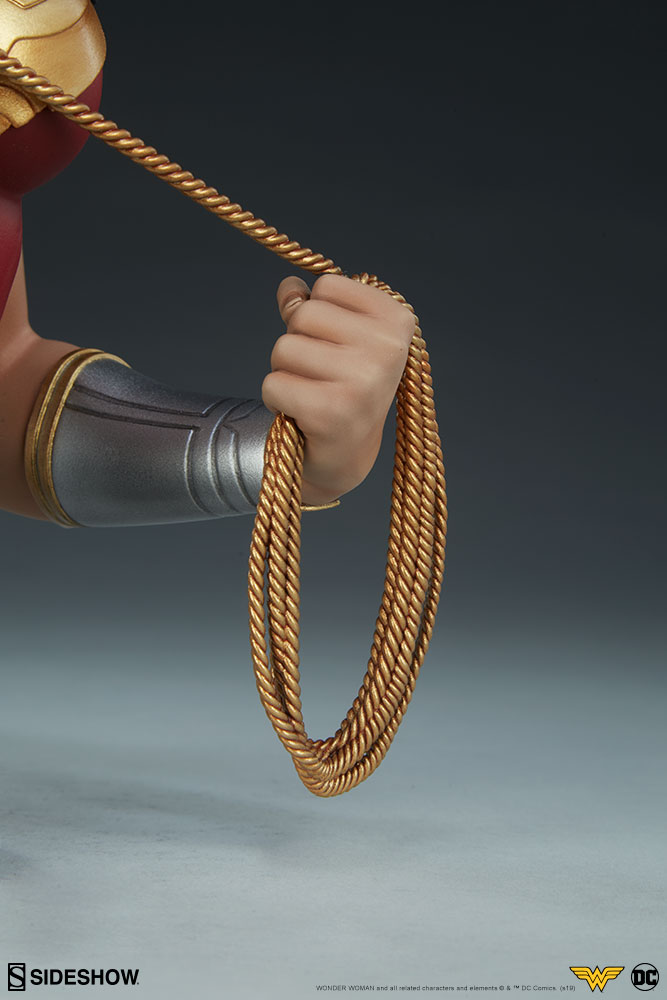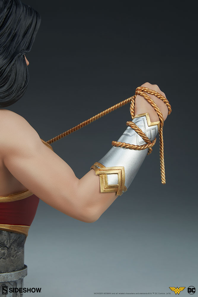 The polyresin Wonder Woman Bust measures 9.5" tall as the Amazon warrior holds her Lasso of Truth at the ready. As depicted from the waist up, Diana of Themyscira is clad in her iconic costume, featuring her sculpted red bodice, golden armor and tiara, and silver Bracelets of Submission. The Lasso of Truth is also fully sculpted, detailed to mimic the appearance of rope as she wields it against injustice across the DC Universe. Sitting atop a Themysciran pillar-inspired base, this detailed bust captures Wonder Woman's fierce devotion to love and honor in a dangerous world.