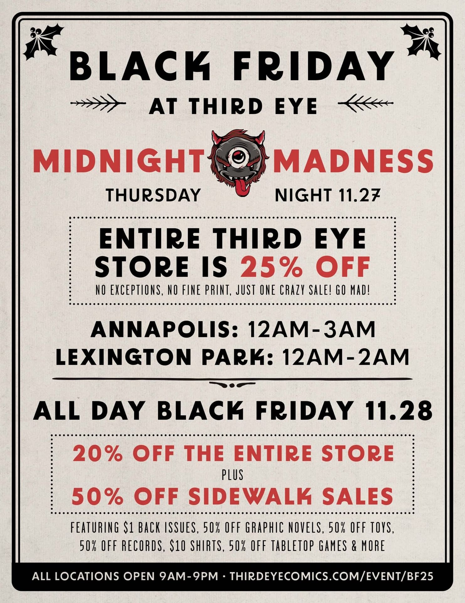 - Third Eye Comics Annapolis, 209 Chinquapin Round Rd, Suite 200, Annapolis, MD, Midnight – 3am 25% off – then all day sale