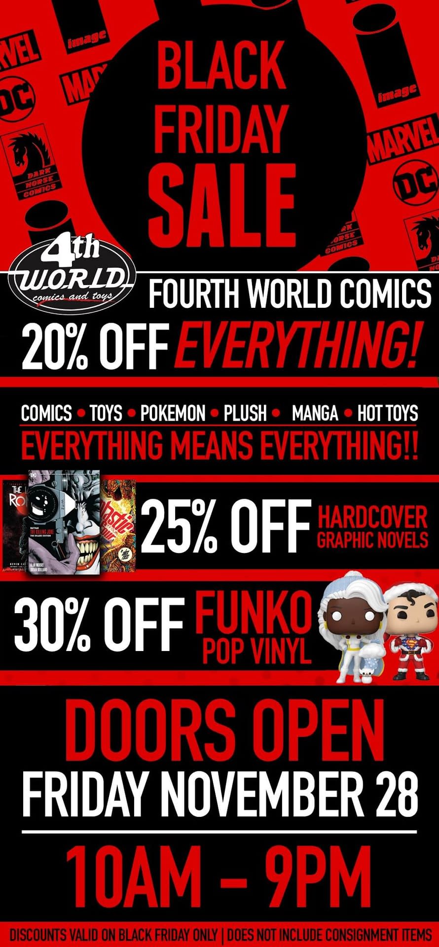 - Midtown Comics Times Square 25% off all comics, books, back issues and new. 10% off big ticket comics, Black Friday Fine Print (from the Watcher) 10AM–10PM