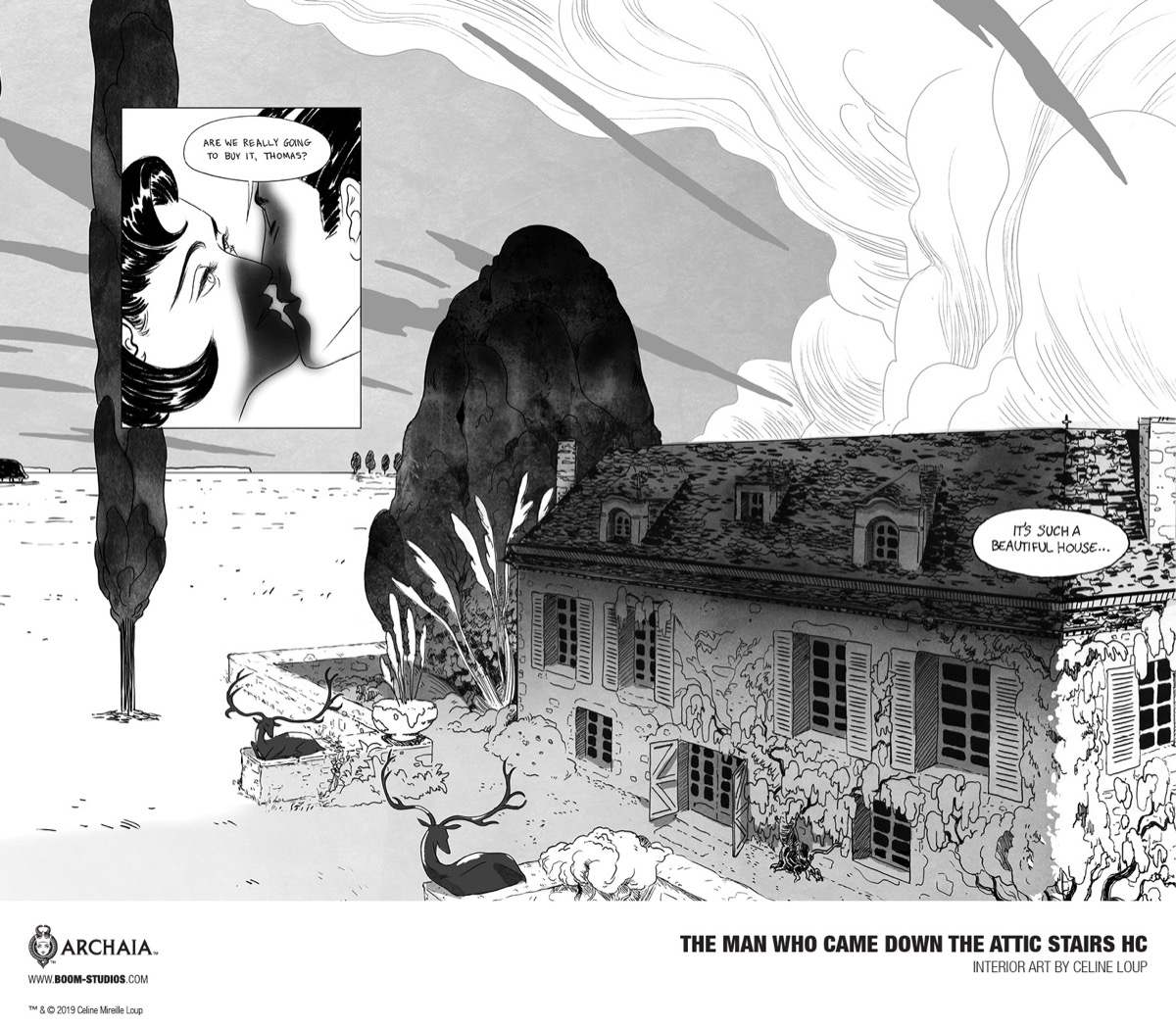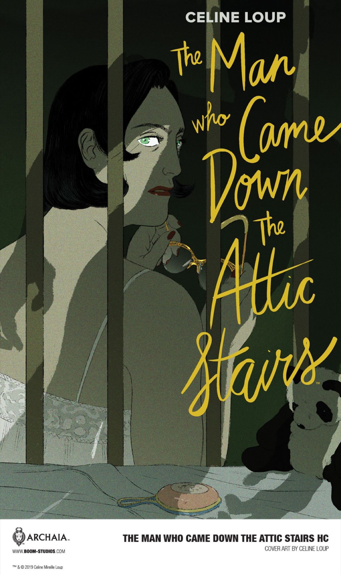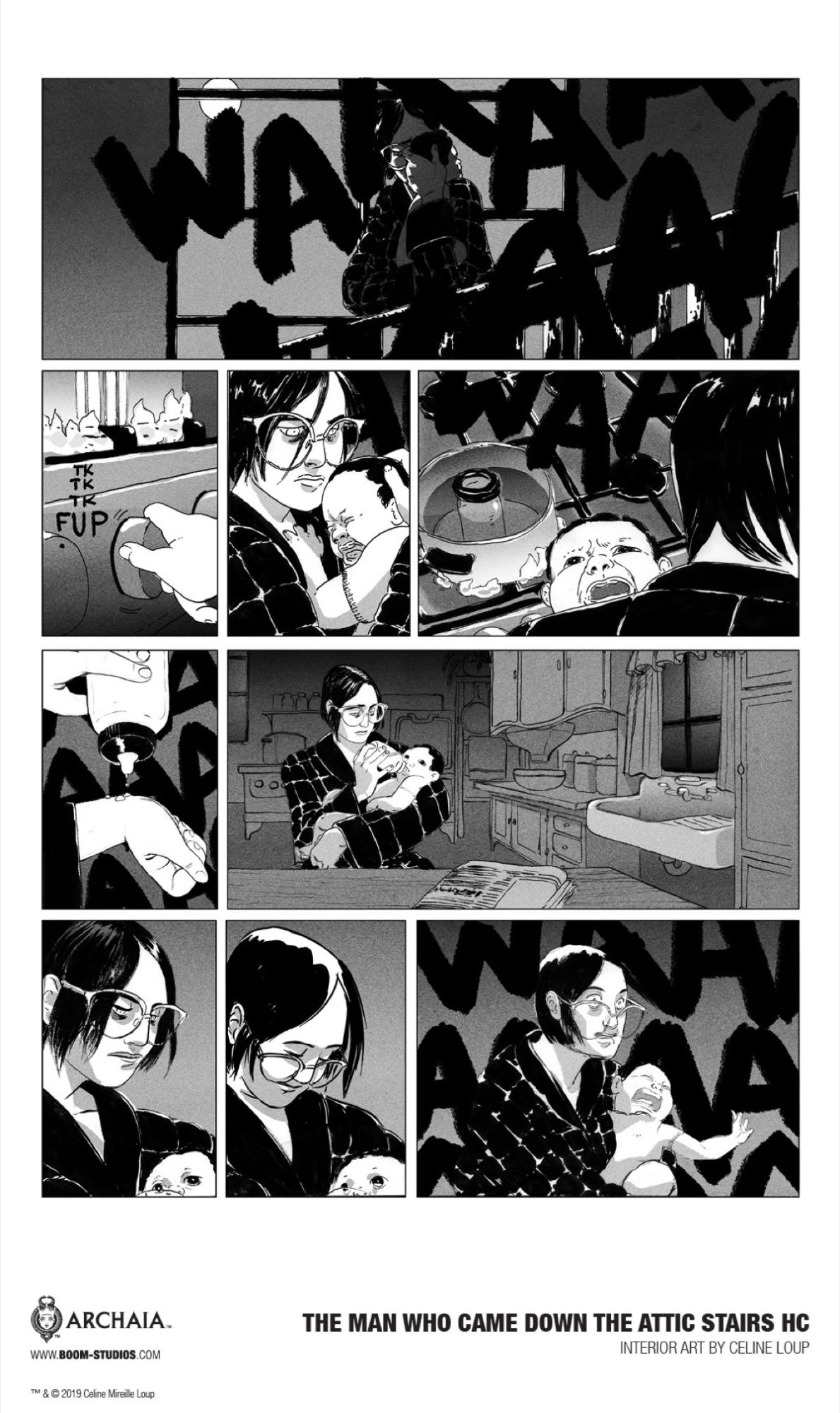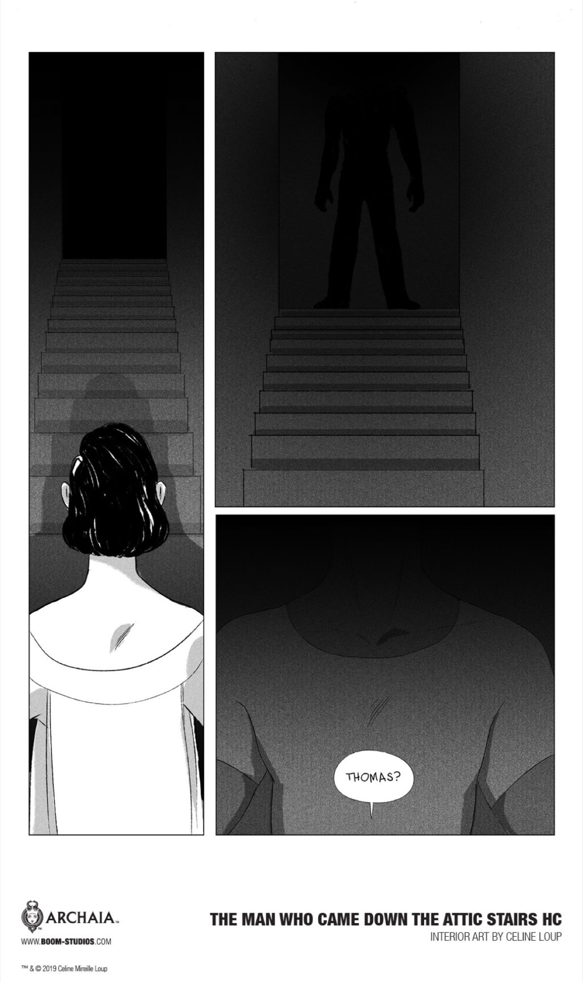 LOS ANGELES, CA (May 31, 2019) – BOOM! Studios today revealed a first look at THE MAN WHO CAME DOWN THE ATTIC STAIRS, a new original graphic novel in stores September 2019, inspired by the works of Shirley Jackson and Ira Levin, in which acclaimed comics creator Celine Loup weaves a tale of horror and suspense that captures the isolation of postpartum depression, while exploring the very real fears associated with new motherhood.