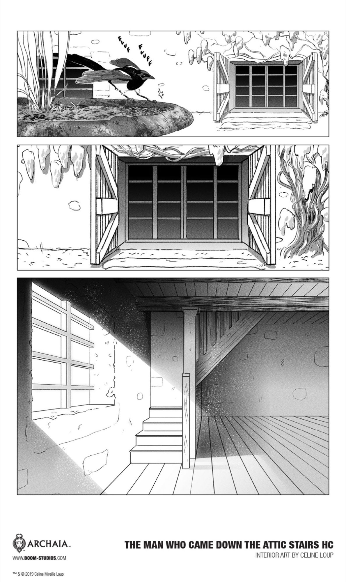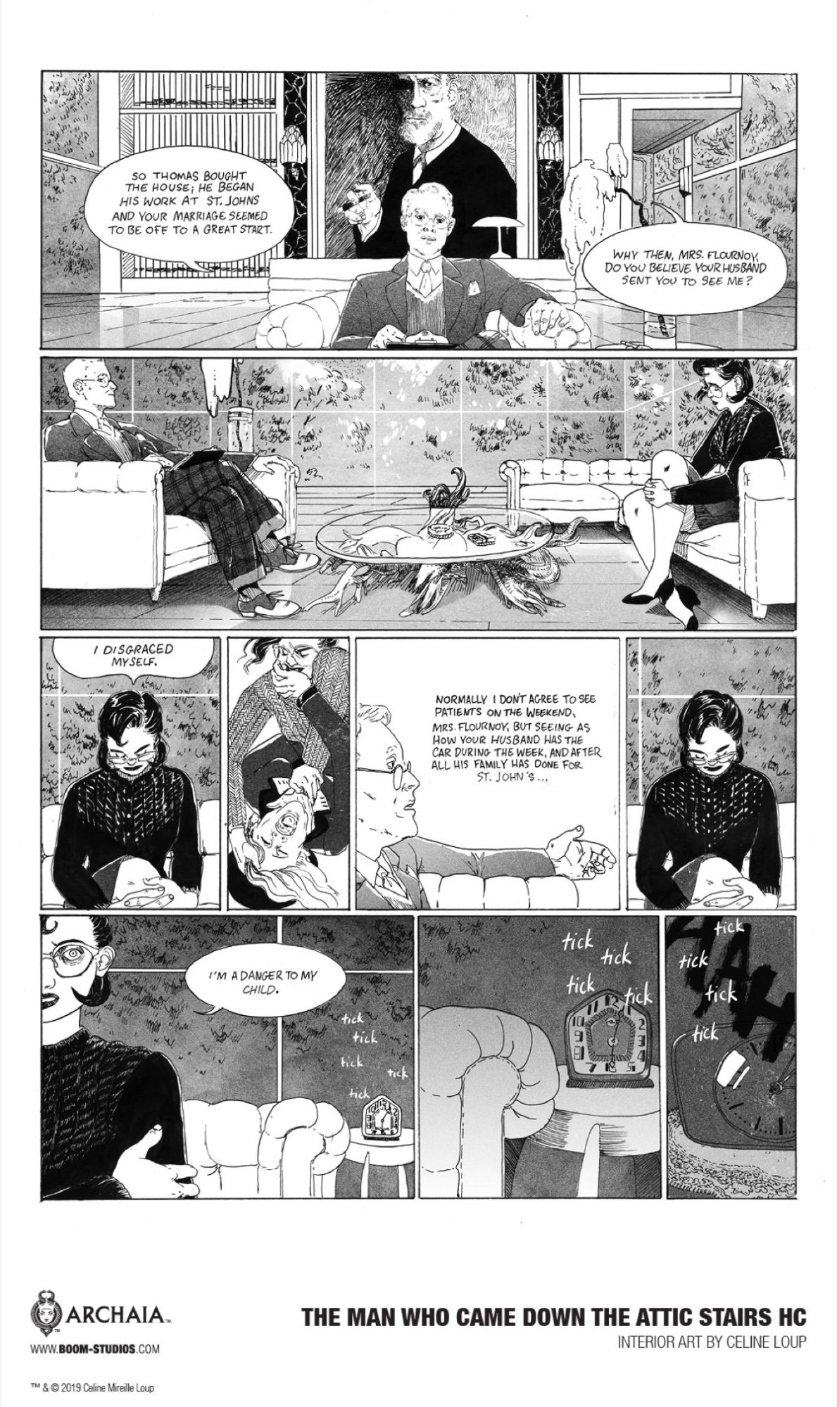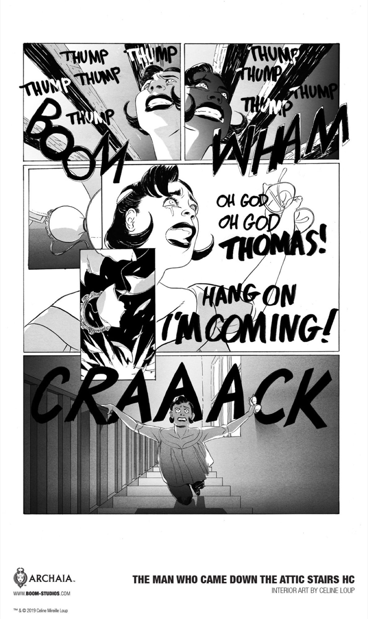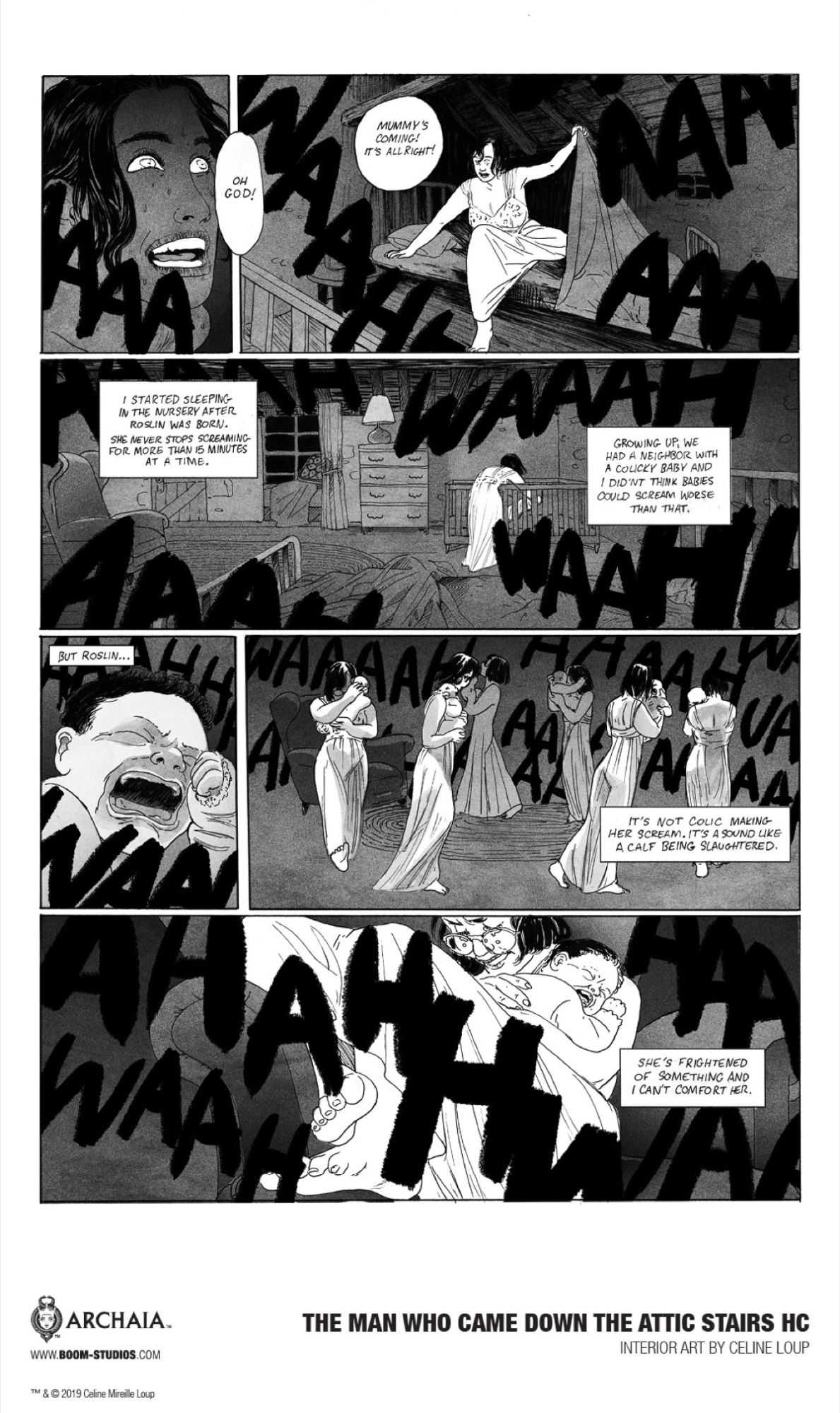 LOS ANGELES, CA (May 31, 2019) – BOOM! Studios today revealed a first look at THE MAN WHO CAME DOWN THE ATTIC STAIRS, a new original graphic novel in stores September 2019, inspired by the works of Shirley Jackson and Ira Levin, in which acclaimed comics creator Celine Loup weaves a tale of horror and suspense that captures the isolation of postpartum depression, while exploring the very real fears associated with new motherhood.
