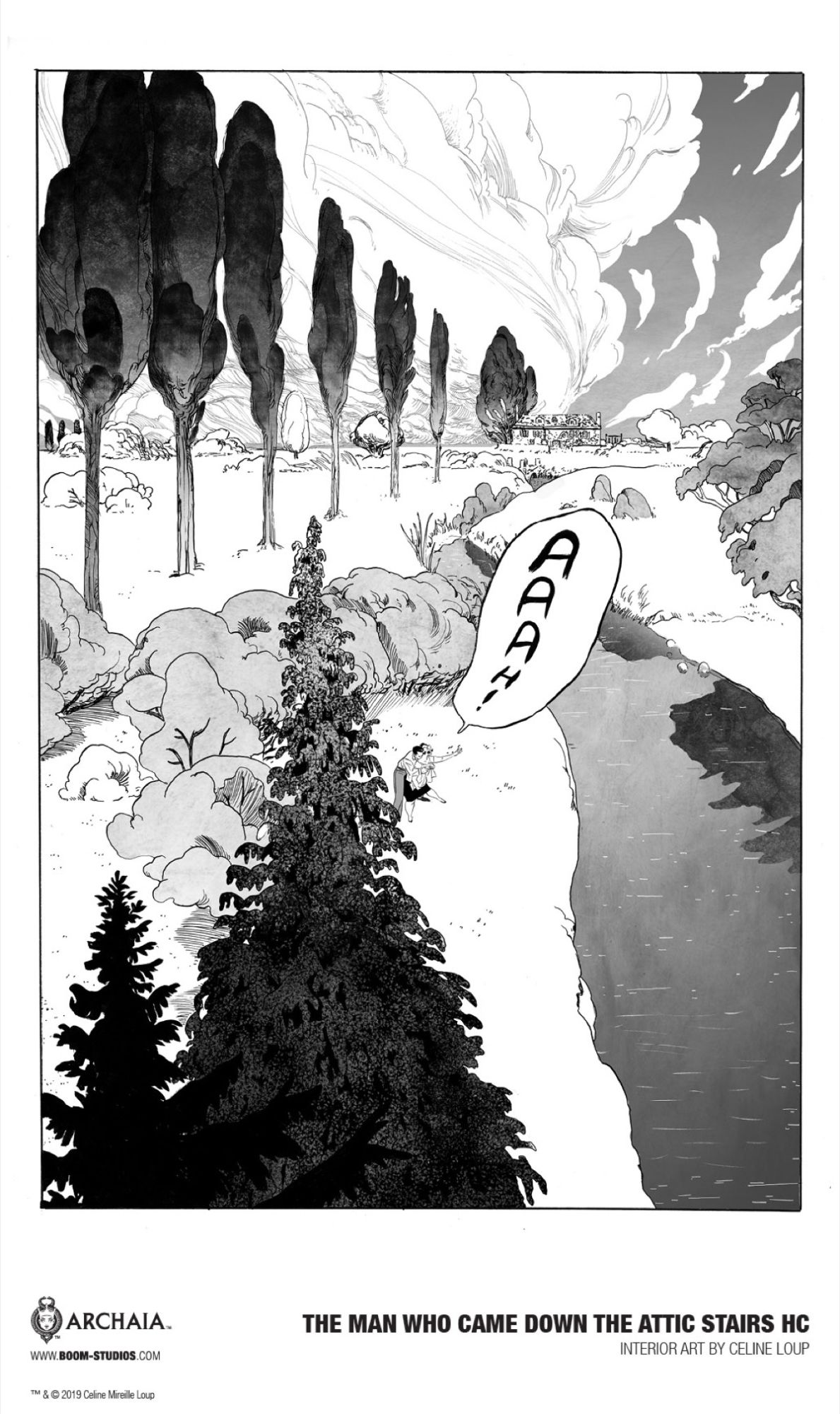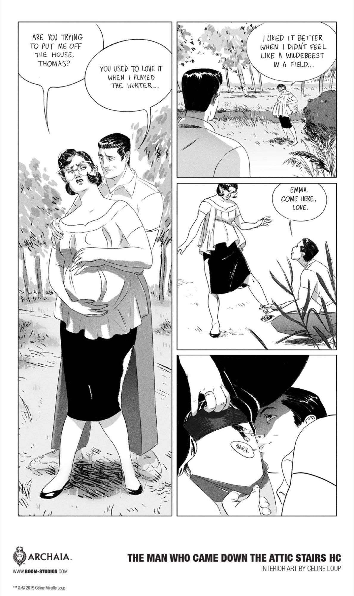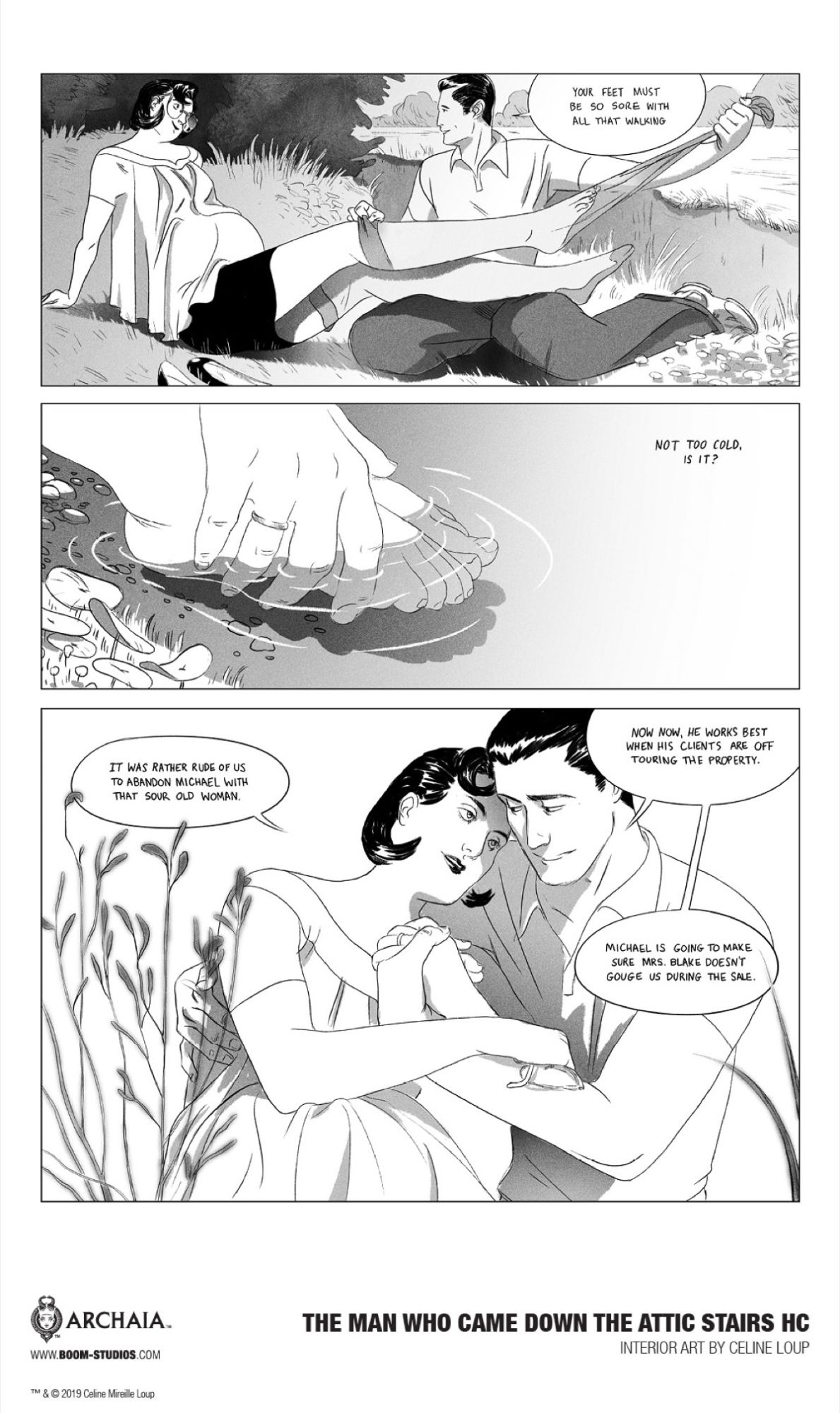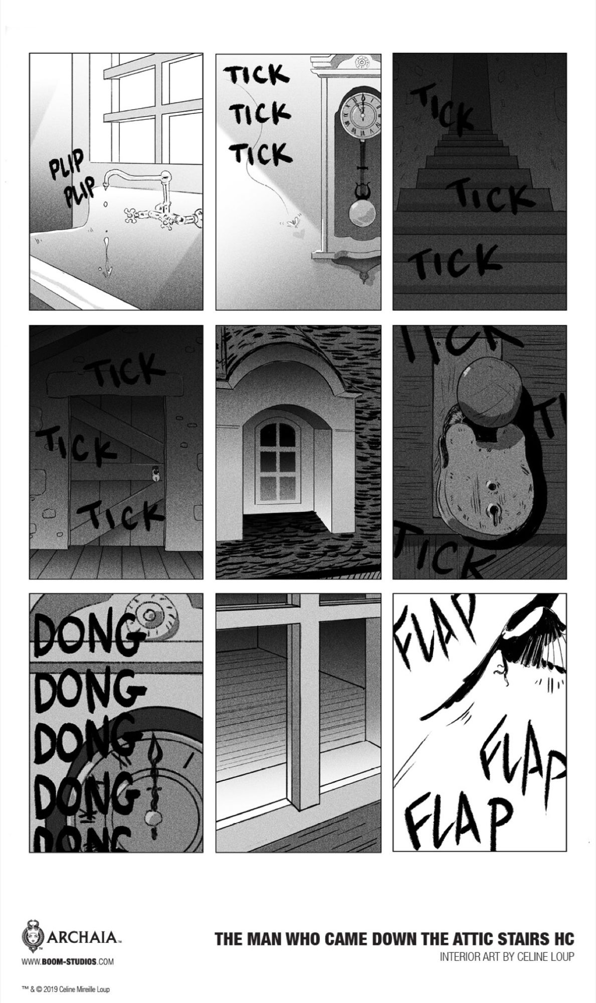 LOS ANGELES, CA (May 31, 2019) – BOOM! Studios today revealed a first look at THE MAN WHO CAME DOWN THE ATTIC STAIRS, a new original graphic novel in stores September 2019, inspired by the works of Shirley Jackson and Ira Levin, in which acclaimed comics creator Celine Loup weaves a tale of horror and suspense that captures the isolation of postpartum depression, while exploring the very real fears associated with new motherhood.
