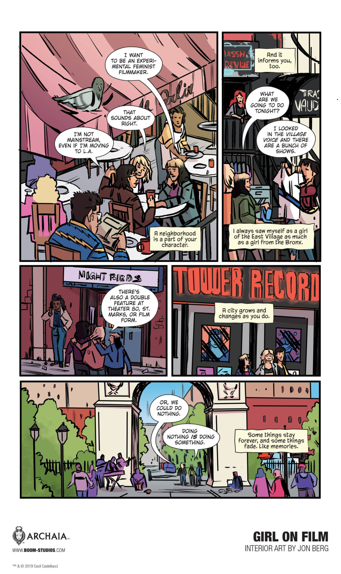 Explosive publisher BOOM! Studios has revealed a massive first look at Girl on Film, the upcoming graphic memoir written by Cecil Castellucci and illustrated by Vicky Leta, Melissa Duffy, V. Gagnon, and Jon Berg. The book, to be published via BOOM!'s Archaia imprint, depicts Castellucci's life journey from fan to bestselling comic book writer.