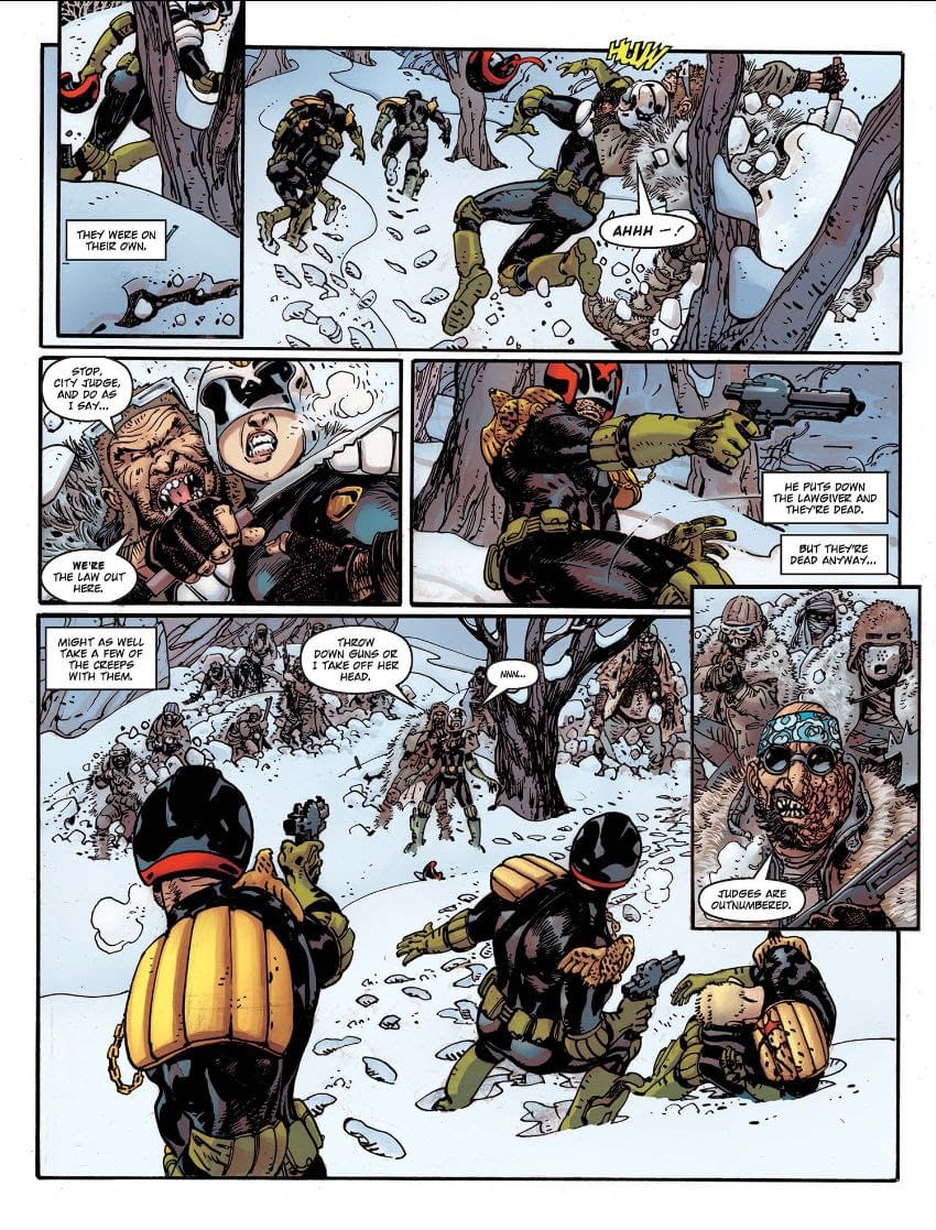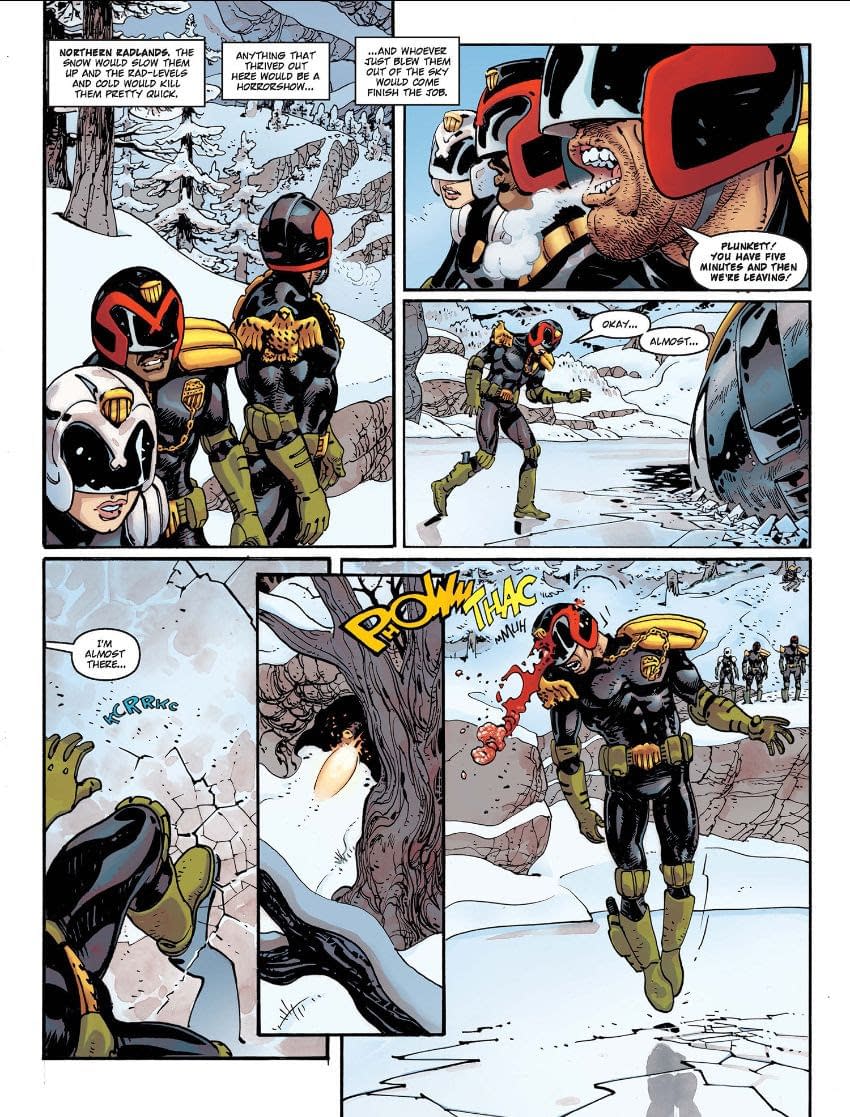 "Kicking off this 128-page collection, in Rend & Tear with Tooth & Claw Dredd finds himself stranded with a small team after his jet crashes into the middle of the snowy wilderness, the heart of the Northern Radlands. With a dwindling team around and fewer resources, he has to team up with the rookie Cadet Moon if he's any hope of escaping back to Mega-City One! But the wilderness is unforgiving, and the bloody wreckage has attracted the attention of an alpha-hunter: a gigantic bear hungry for Dredd's blood!