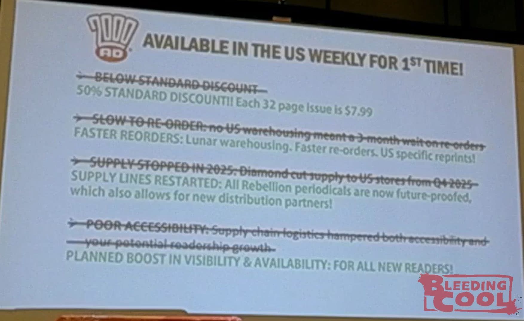 "So how does it work? From May 2026, it will be in US stores that order it, every week, with only a two-week gap between the UK and the US on-sale day. We're going to be printing and shipping in the US for the first time, offering supply that we can track. Each individual issue is going to be orderable. Individual issue orderable, printed on thicker paper for reading durability and browsing. No more polybags at all. We've raised the discount; it's going to be industry standard, so you get 32 pages for $7.99. We really love working with Lunar, and the relationship we've built with them has been great. They'll be warehousing, which means fast reorders. With some demand issues, we all have a chance to do US reprints as well. We're looking to basically remove obstacles to sales for you and hope to future-proof not just 2000 AD but Rebellion periodical articles in the US, and allow for new distribution partners. Pretty much every choice we've made has been about boosting availability and reaching more readers consistently."