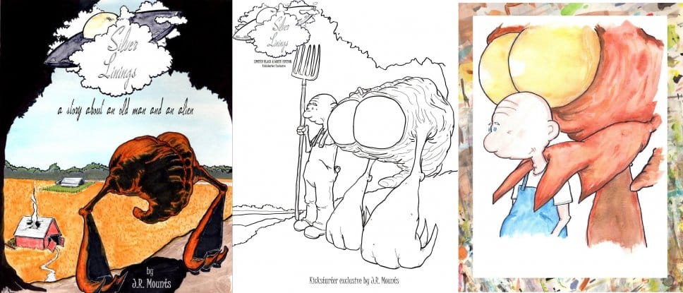 SILVER LININGS is the newest work from J.R. Mounts, a story about the friendship between and old man and an alien, much like E.T. for old people. This story is featured in a new limited edition set which collects not only the full watercolor story and 45-minute instrumental score cdr but the Kickstarter black & white edition of the full story before dialog and color were added. This exclusive set was limited to 15 copies and will be offered at C2E2 for remaining copies. This full set is $65 and comes signed by J.R. Mounts personally at C2E2.