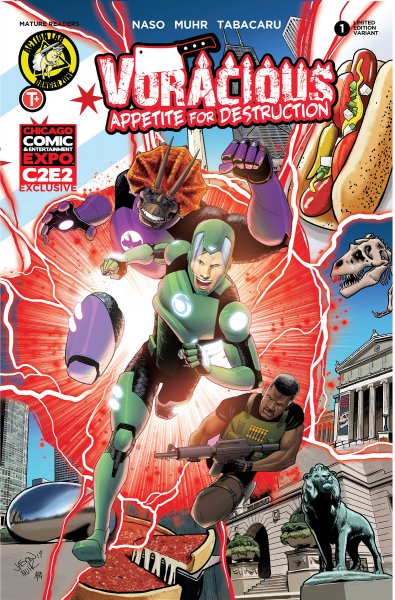 A special, C2E2 version of VORACIOUS: Appetite for Destruction #1! Featuring an iconic, Chicago cover by Jason Muhr and Andrei Tabacaru. Published by Action Lab Comics. Limited to 20 copies