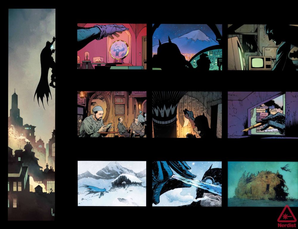 4 unlettered pages from eight-page Batman's Longest Case, by Scott Snyder and Greg Capullo. Batman follows clues around the world, leading him back to his home in Gotham City and to a secret organization that has been keeping tabs on him for years. Read about it here.