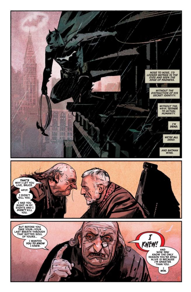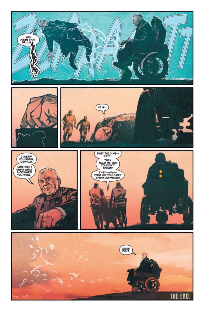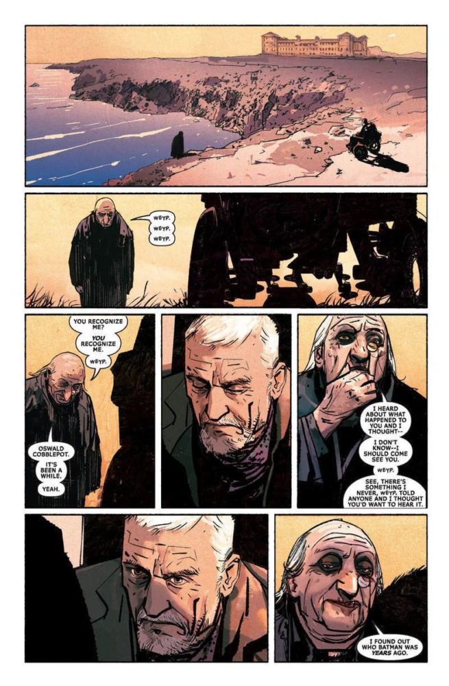 Full 9 pages of the 9-page story I Know story, by Brian Michael Bendis, Alex Maleev and Josh Reed. A unique future look at Batman and the Penguin. The Penguin comes to an elderly, wheelchair-bound Batman to tell him of the time that he learned Batman was Bruce Wayne—and to explain why he never did anything with that information. Read more about it here.