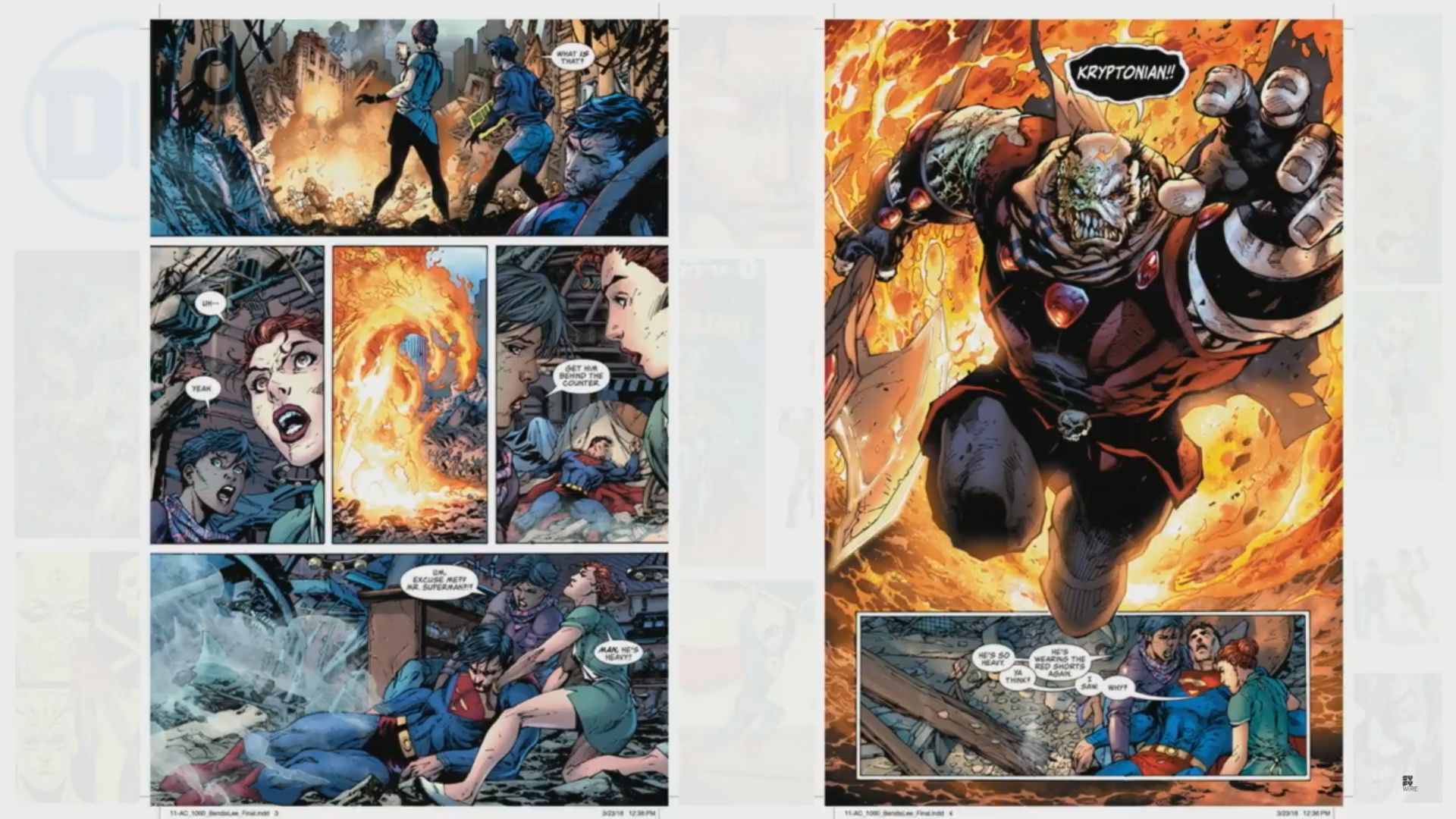 Shown off at the Action Comics #1000 panel at C2E2, we have the first four pages of Brian Michael Bendis's first Superman story, appearing in Action Comics #1000, with art by Jim Lee, fully coloured and lettered. Remember it wasn't that long ago since it looked like this.
