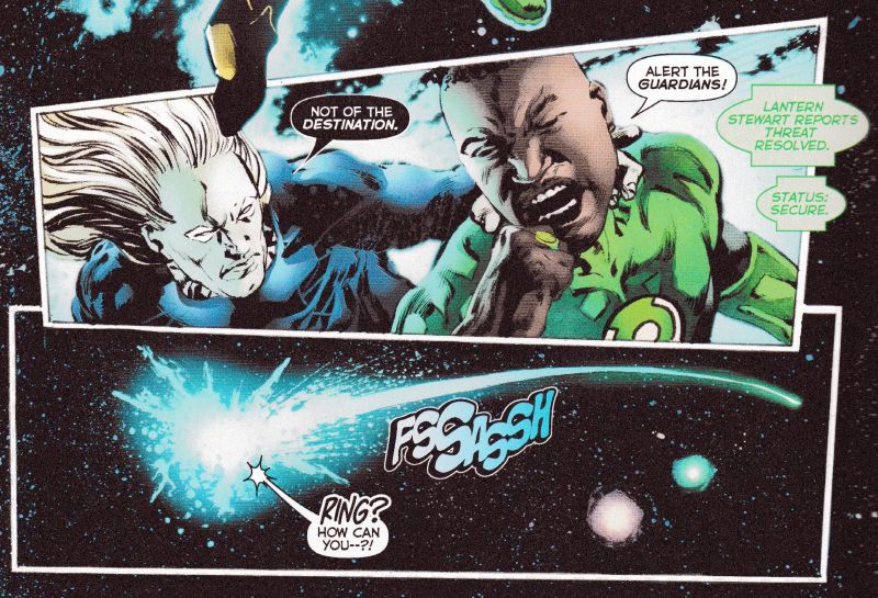 While over in Green Lanterns #50, John Stewart is betrayed by his own ring, disobeying his commands, when fighting a new and unexpected foe. And it seems that this betrayal may be spreading among the rings, if the final page reveal is anything to go by.