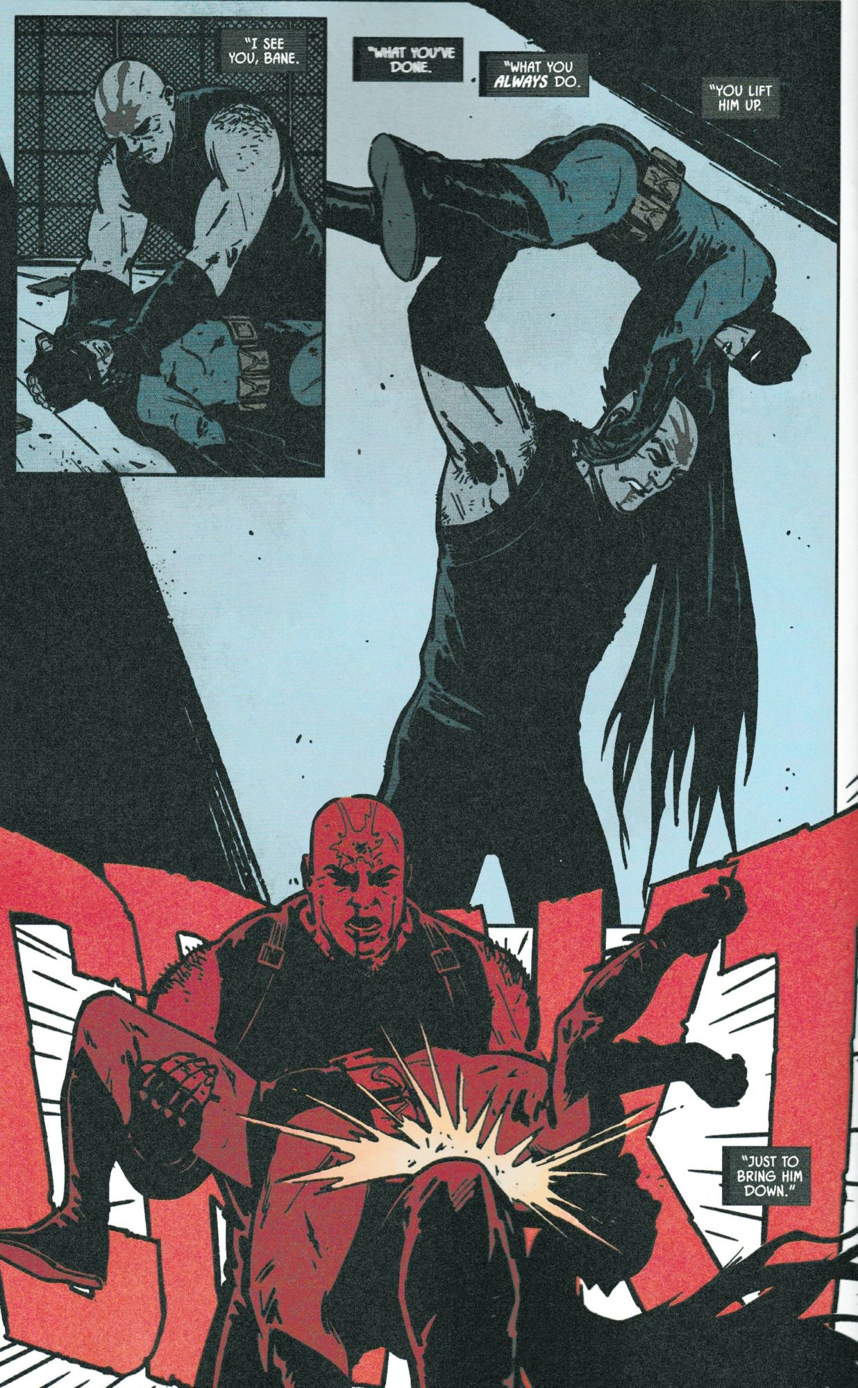 Today's Batman #72 is, to some degree, a clip show. As Batman engages in hand-to-hand combat with Bane, an unseen narrator speaks (even if you are bound to get who it is before the eventual reveal) taking the opportunity to run through Tom King's first fifty issues, summarising all the plots and machinations that occurs as part if Bane's big plan. Every nuance – The Button aside and from the narrator I'm sure we will get to that – every fight, every victory that Batman thought he had gained, all reinterpreted as the great plan. And then coalesced into one scene.